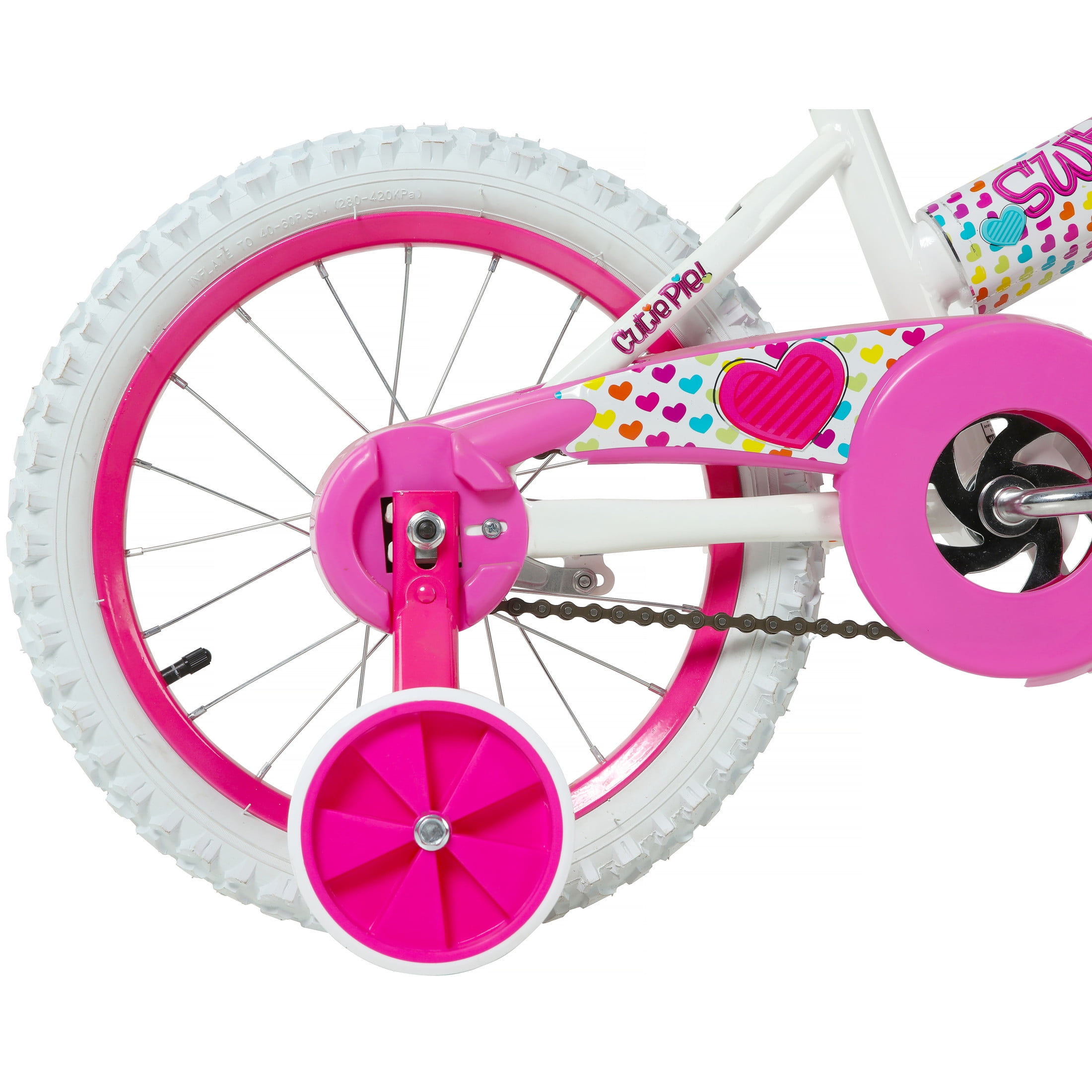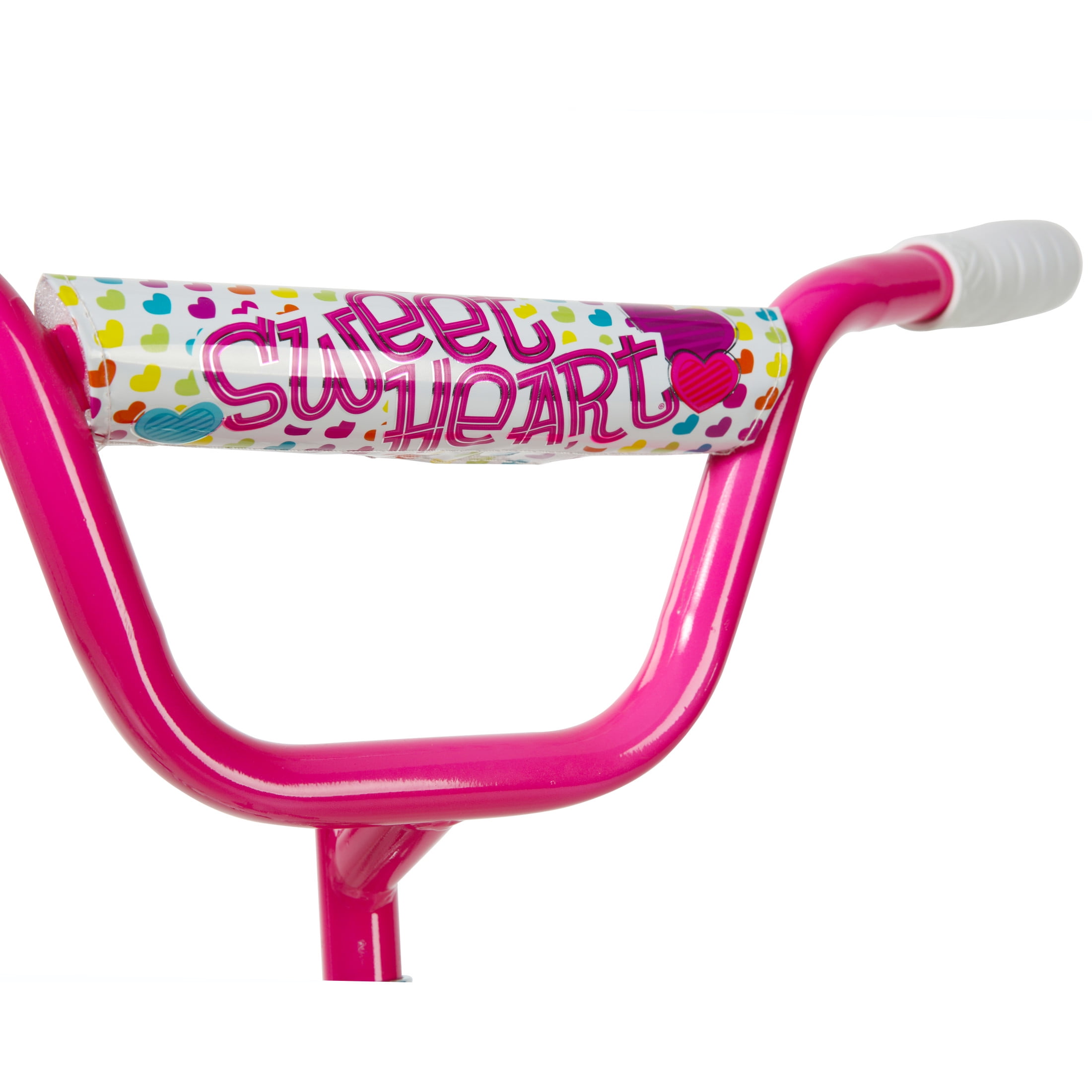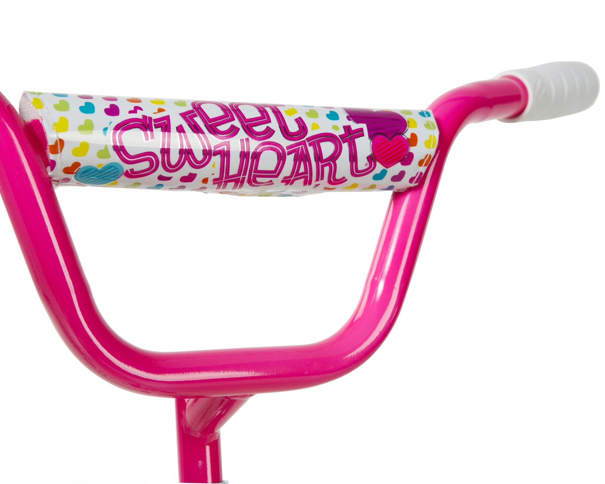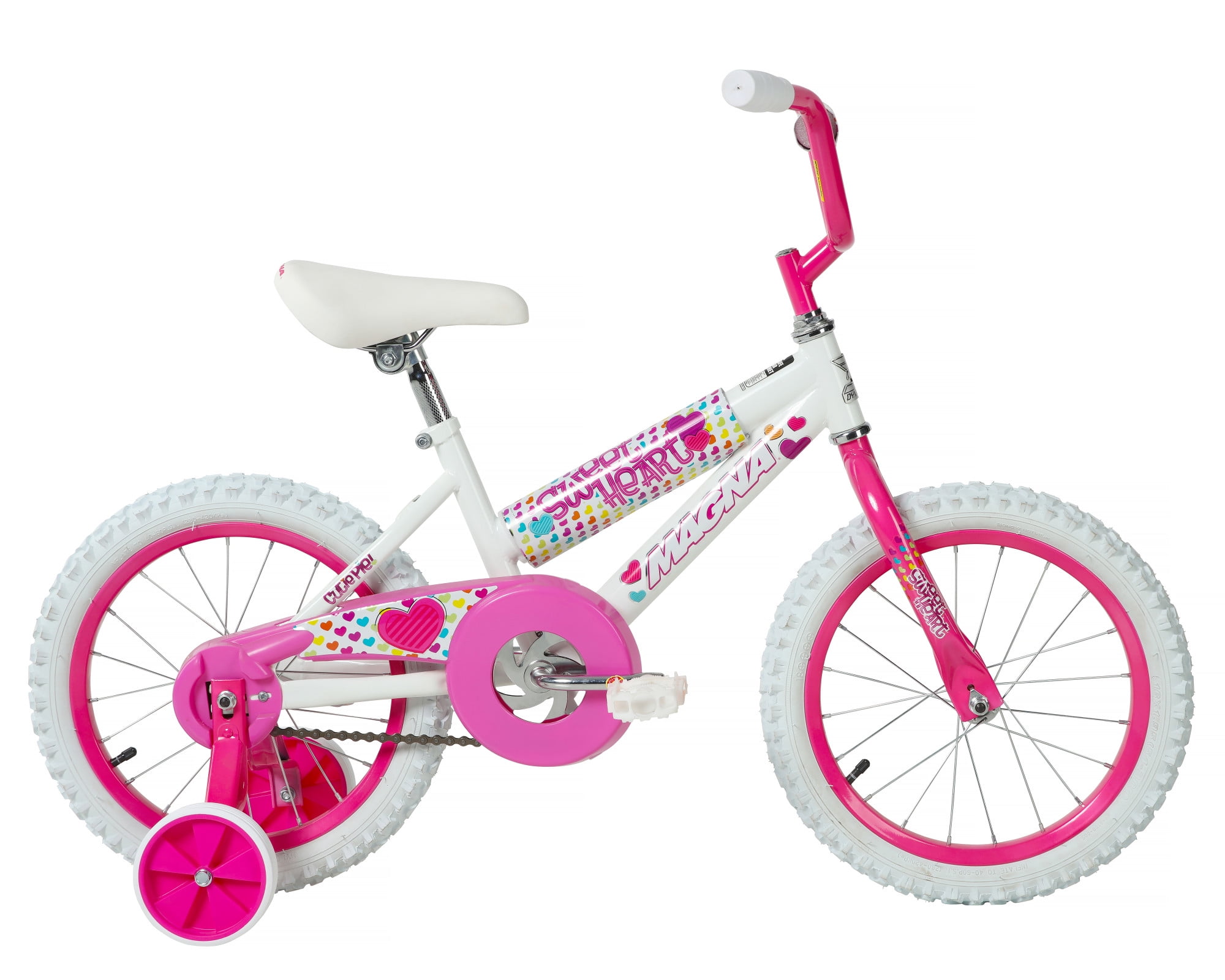 Your little one will experience nothing but the sweetest rides on the Magna Sweetheart 16-inch Girls Bike by Dynacraft. This bike is sure to capture attention with its eye-catching color scheme. The frame features a white paint finish accented by pink handlebars and training wheels. Colorful details and custom graphics on the handlebar pad, top tube pad, and chain guard are all decked out with pops of yellow, blue, and purple. Coaster brakes make stopping easy and removable/adjustable training wheels help ensure a fun and steady ride for those just learning to ride. The 16-inch tires make this a great option for young riders ages 4-8 years. Spread some love in the neighborhood on the Sweetheart 16-inch Girls Bike.