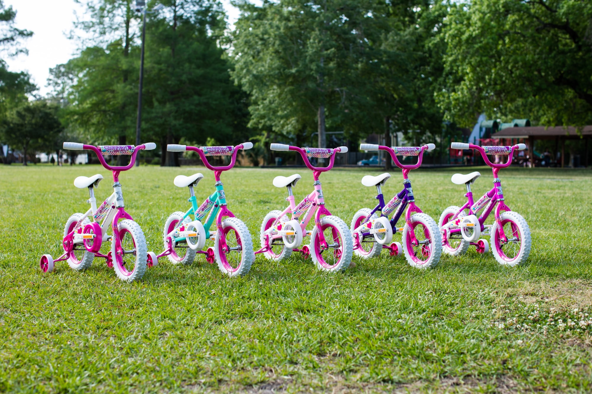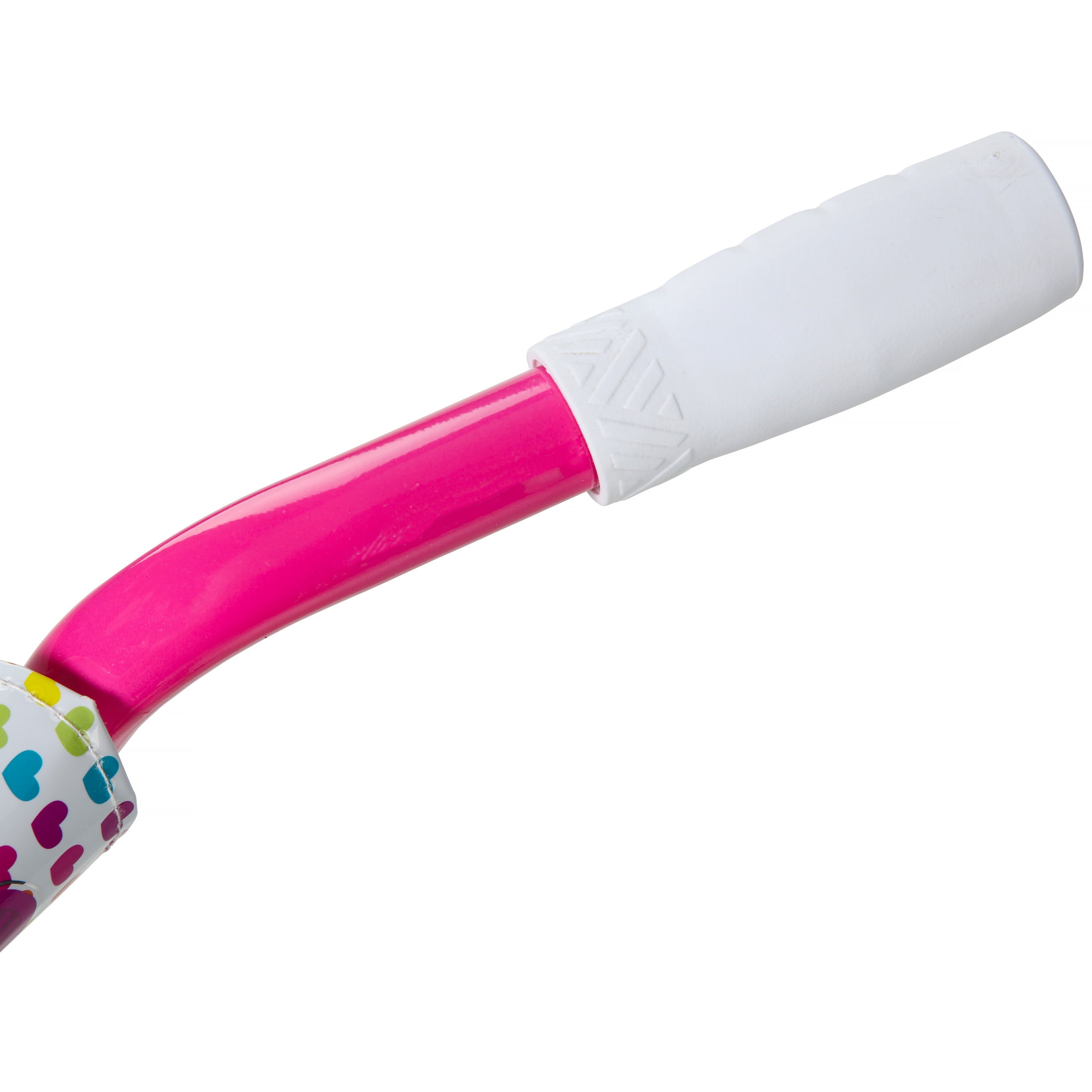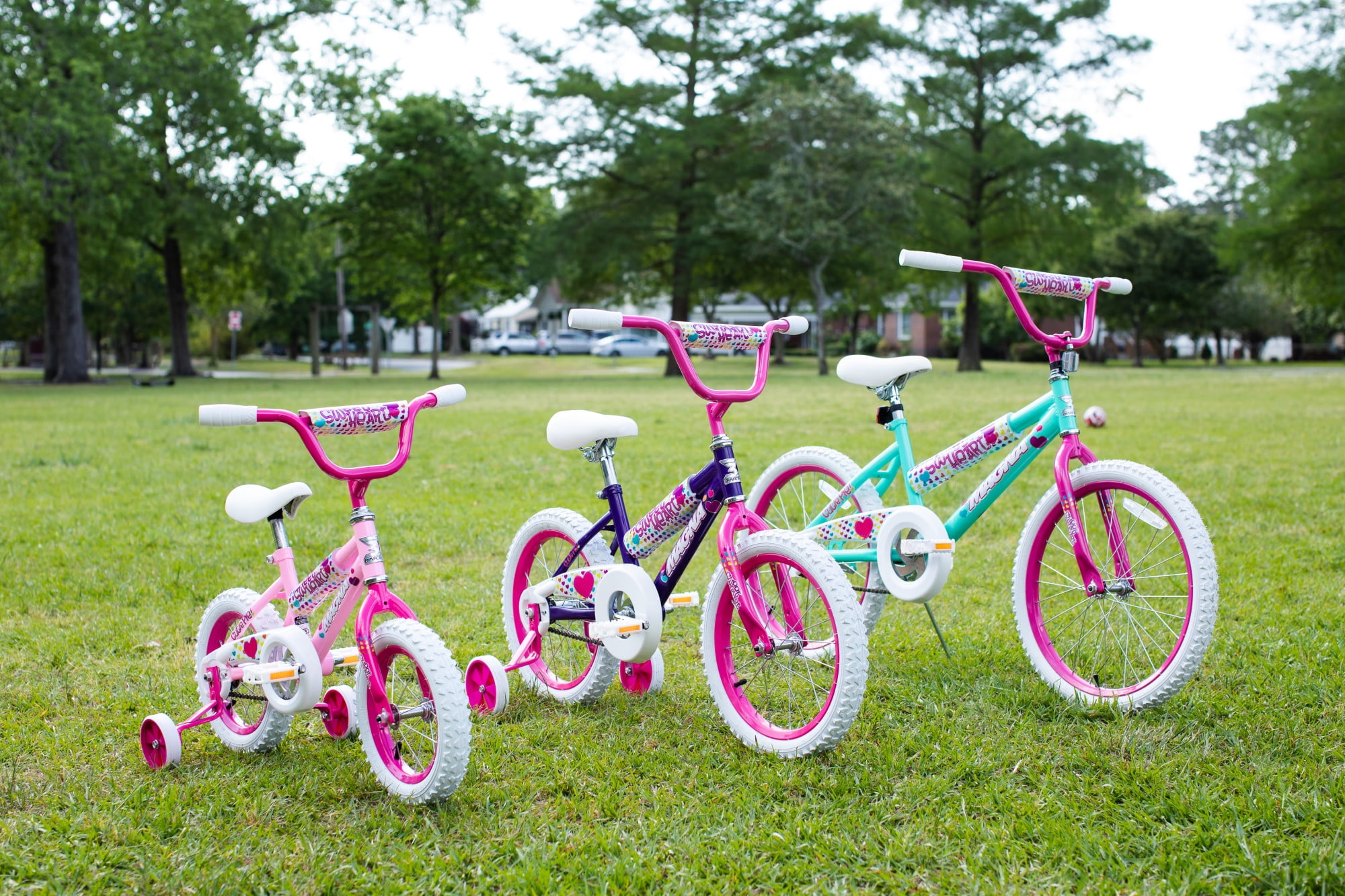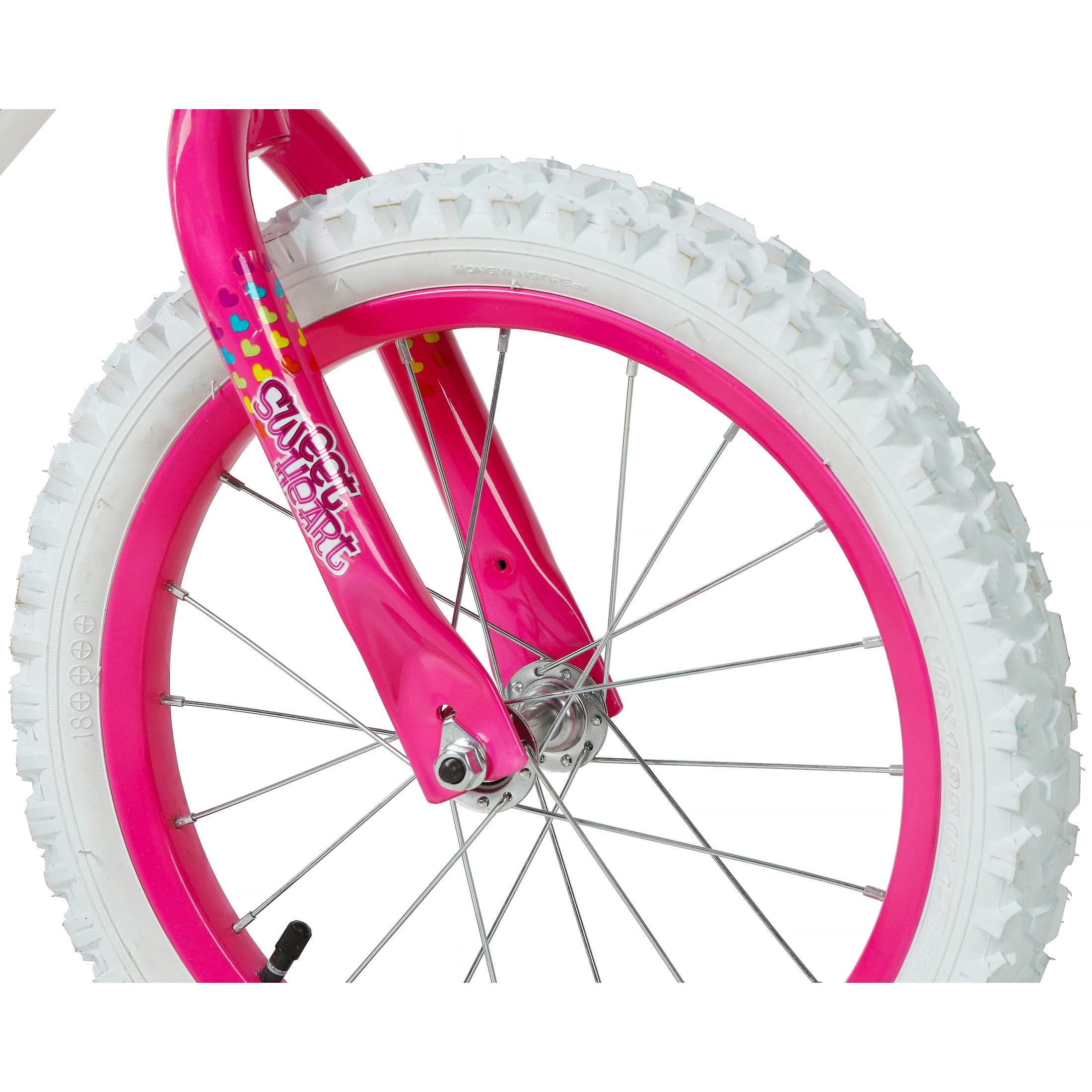 Your little one will experience nothing but the sweetest rides on the Magna Sweetheart 16-inch Girls Bike by Dynacraft. This bike is sure to capture attention with its eye-catching color scheme. The frame features a white paint finish accented by pink handlebars and training wheels. Colorful details and custom graphics on the handlebar pad, top tube pad, and chain guard are all decked out with pops of yellow, blue, and purple. Coaster brakes make stopping easy and removable/adjustable training wheels help ensure a fun and steady ride for those just learning to ride. The 16-inch tires make this a great option for young riders ages 4-8 years. Spread some love in the neighborhood on the Sweetheart 16-inch Girls Bike.