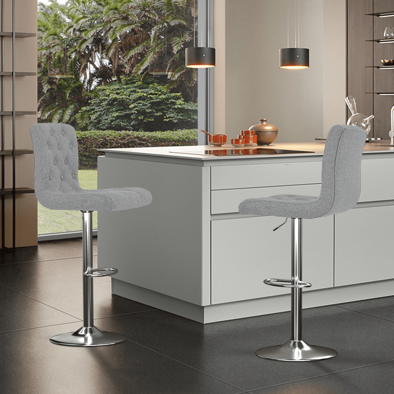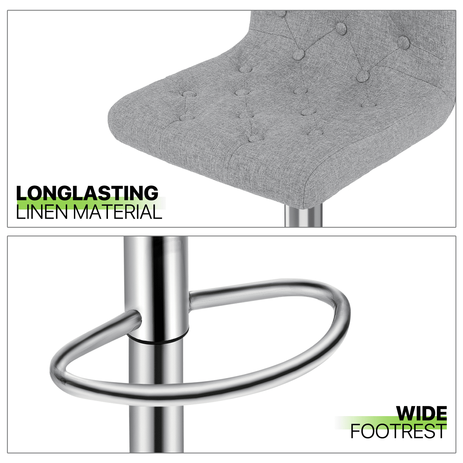 Brand: Magshion Product Type: Bar Stool Color: Grey Material: Linen Rivet; Chromed Steel Style: Contemporary Overall Size: (L)17.5″ (W)15.0″ (H)37.0″ Seat Height: 22.0″-30.0″ Seat Size: (L)16.5″ (W)12.5″ Seat Back Height: 15.0″ Weight Capacity: 250 lb Quantity: 2 Pcs Premium Materials Our bar stools are padded with high resilience sponge and covered with PU leather, the stools are ergonomically designed. This stool supports up to 250 lbs of evenly distributed weight. You can lean against the back of the stool and put your legs on the footrest for a better sitting position. Adjustable Height By raising the lever under the seat to adjust the heights easily. The lifting mechanisms works perfectly, you can adjust it to different heights and keep stable. Anti-skid and Protect Floors The sturdy round chromed steel base of our swivel bar stool has a rubber ring to prevent your floor from scratching. And rubber ring of our kitchen bar stools also prevent the harsh sound when moving the bar chairs. Longlasting Leather Although leather is an artificial product, aging brings out its natural patina, making it even more beautiful over time. Quick Assembly All installation tools you need are included. Each barstool only needs 5 minutes to finish the assembly.