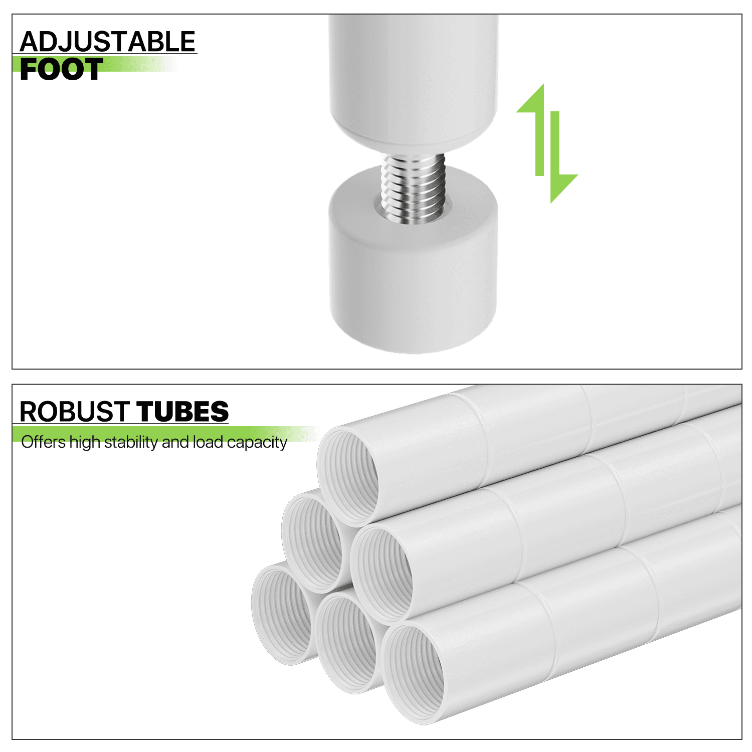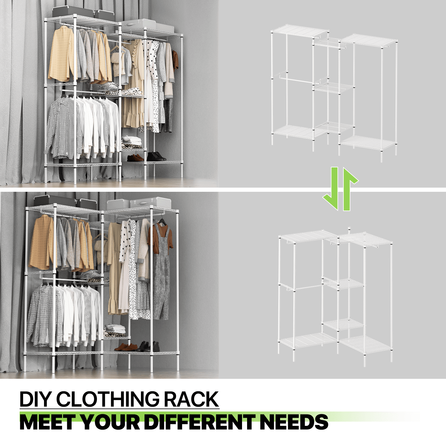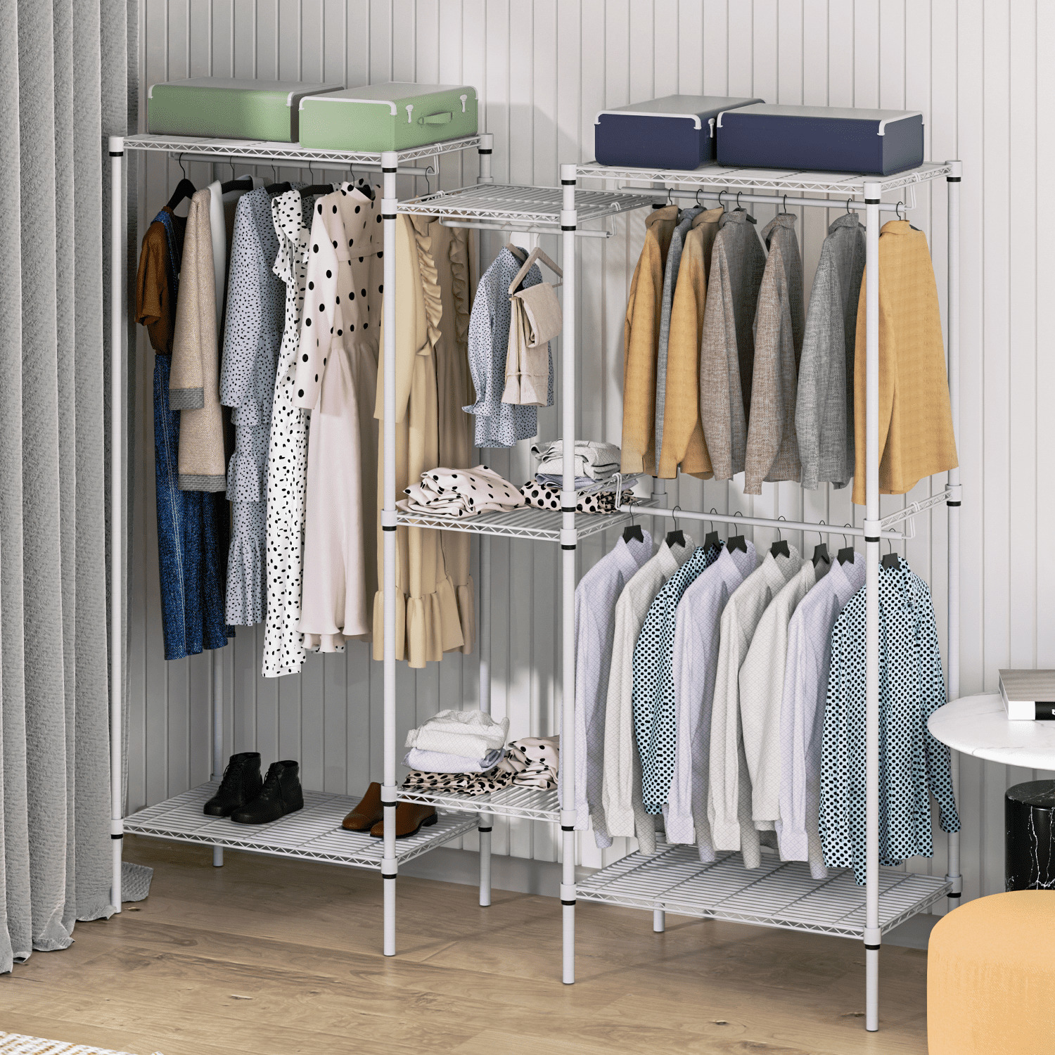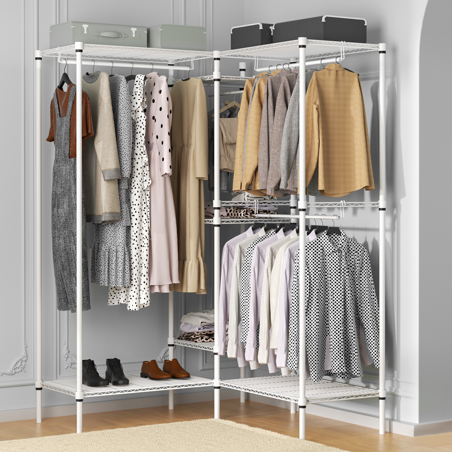 : Magshion : Clothes Racks & Garment Racks : White : Carbon Steel : (L)70.0″ (W)17.5″ (H)71.0″ : 7 Shelves : Slide Down & Snap On : 27.0″ : 17.5″ : 4 Pcs : 110 lbs : Freely Switch Hanging Section : Straight/L-Shaped/Separate Into 2 Racks This heavy duty clothing rack is made of high-grade carbon steel, it features stable and sturdy. And equipped with advanced anti-rust painting process, odorless and moisture-proof. High quality materials also ensure the service life portable clothes rack. The garment rack can be used to store and display a wide range of clothing items, including coats, jackets, dresses, pants, and shirts. They can also be used to hang bags or hats. This clothes rack has various installation methods to fit your different storage needs. L shape for small spaces like corner, apartment, bedroom. Straight-lined shape for walk-in closet and cloakroom clothing store. Also can be installed as 2 separate garment rack for laundry room etc. The clothes hanging rack have multiple equally spaced positions that can be adjusted with clips. The detachable hanging rail can be adjusted or removed according to the length of your clothes. Our carbon steel garment rack adopts the design of sliding sleeve locking system, it is easy to assemble with clear instruction. Hanging rods of clothing rack can hang long dresses, suits, pants, shirts and keep them winkle free. Wire shelves of clothing racks are perfect to organize and classify bedding, lining, luggage etc. This clothes rack helps to classify items and make items easy to find. Clothes racks can be visually appealing, particularly when used to create a stylish display of clothing items. This can be particularly useful in a retail setting or when hosting a clothing swap or pop-up shop.