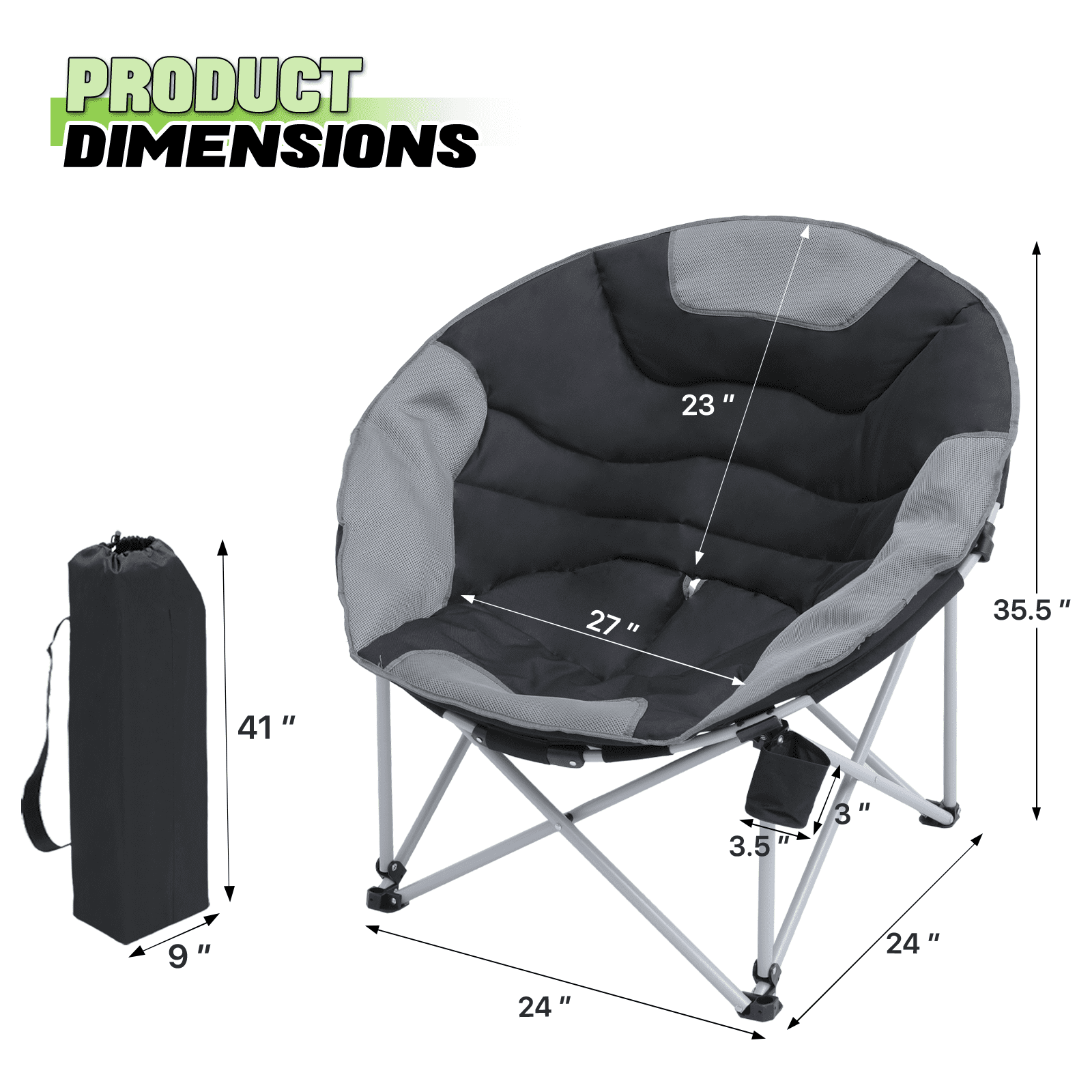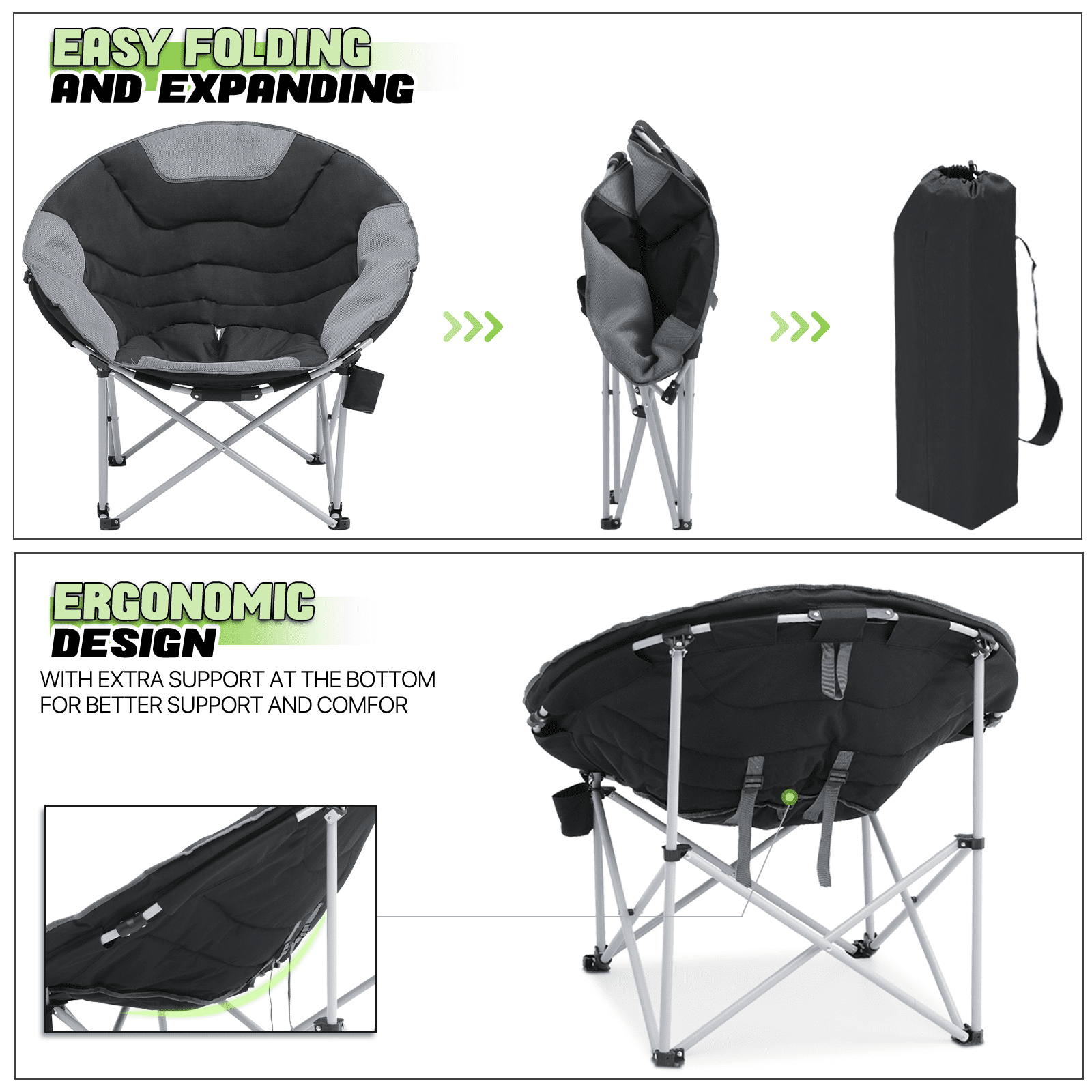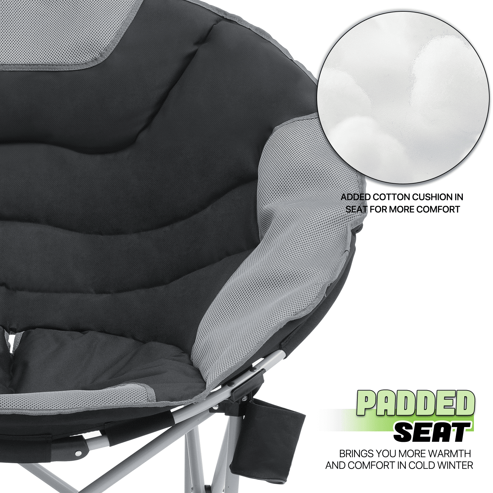 Magshion Padded Camping Chair, Oversized Camping Chair with Cup Holder and Carry Bag, Outdoor Folding Chair Moon Round Chair for Camping Hiking Fishing Picnic, Black/Grey