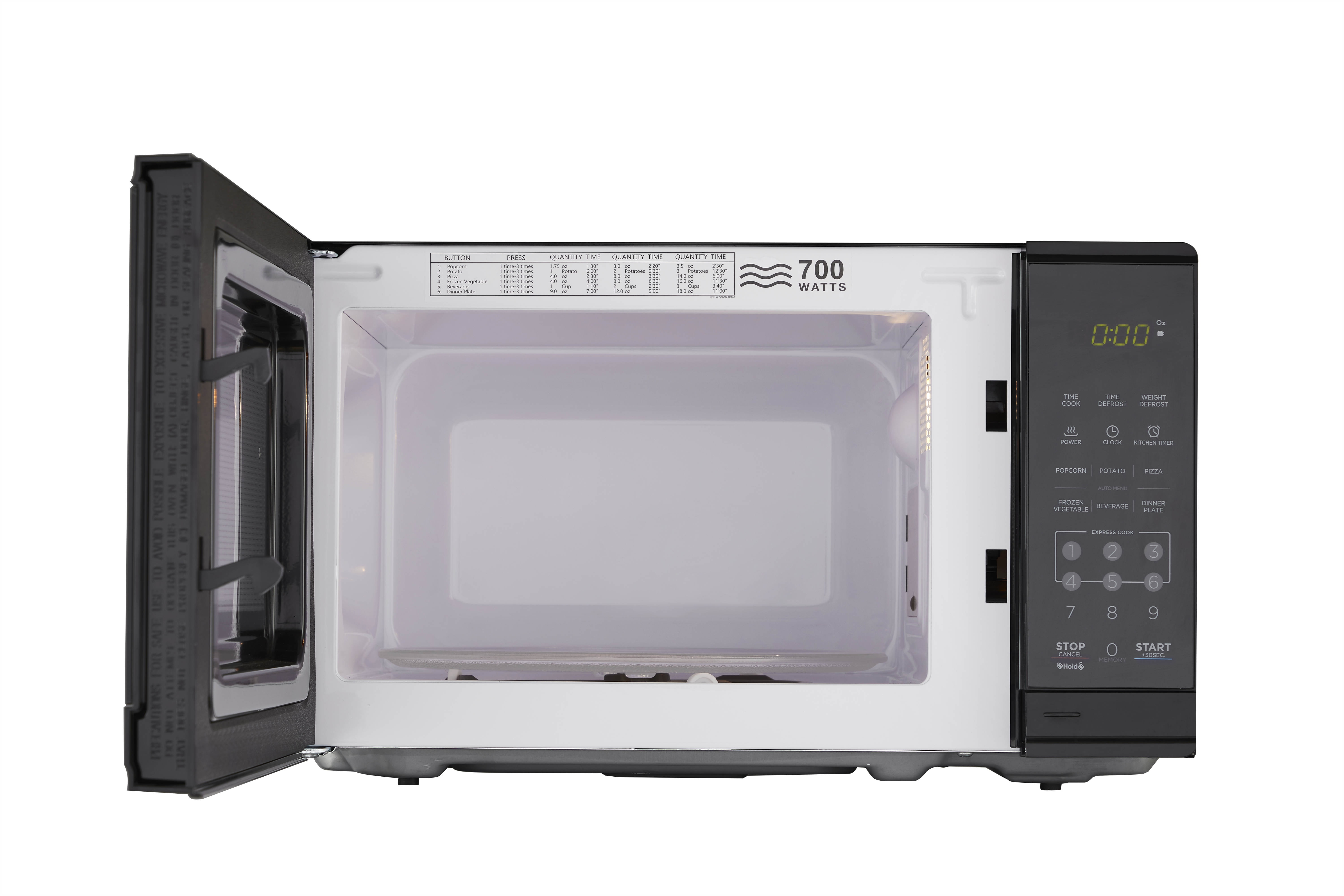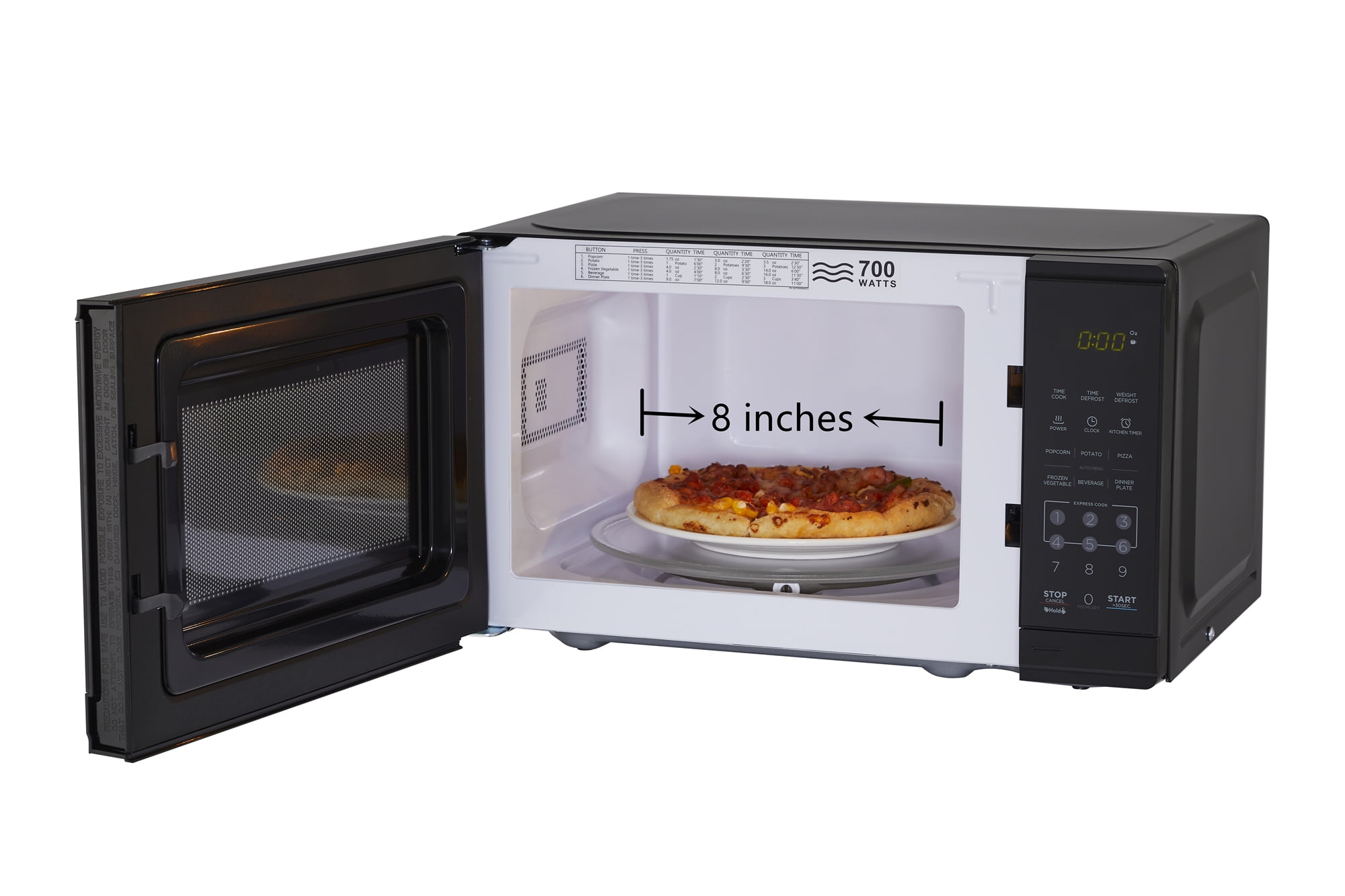 Mainstays 0.7 cu ft, 700 Watt microwave oven provides great value! It has the capacity to take care of cooking needs without taking up much counter space and also will compliment any kitchen style, no matter if it’s a home, a dorm or an office area. The compact cooking capacity takes care of cooking needs without taking up much counter space. It has 6 convenient pre-programmed menu options: Popcorn, Potato, Pizza, Frozen vegetable, Beverage and Dinner plate, that provide a great cooking versatility with simple setting. And you could find more cooking instruction for different weight or quantity cooking from the door sticker. The 700-Watt output power with 10 adjustable levels can brings optimal cooking and reheating results for variety of foods. Defrost by time and weight allow ingredients to thaw evenly and one touch 30 second start is a time saver. Digital clock is lit up on easy-to-read LED display. A child lock is also available to keep the little ones safe when the microwave oven is working. This microwave oven is an ideal cooking assistant and makes a wonderful housewarming and a wedding gift.