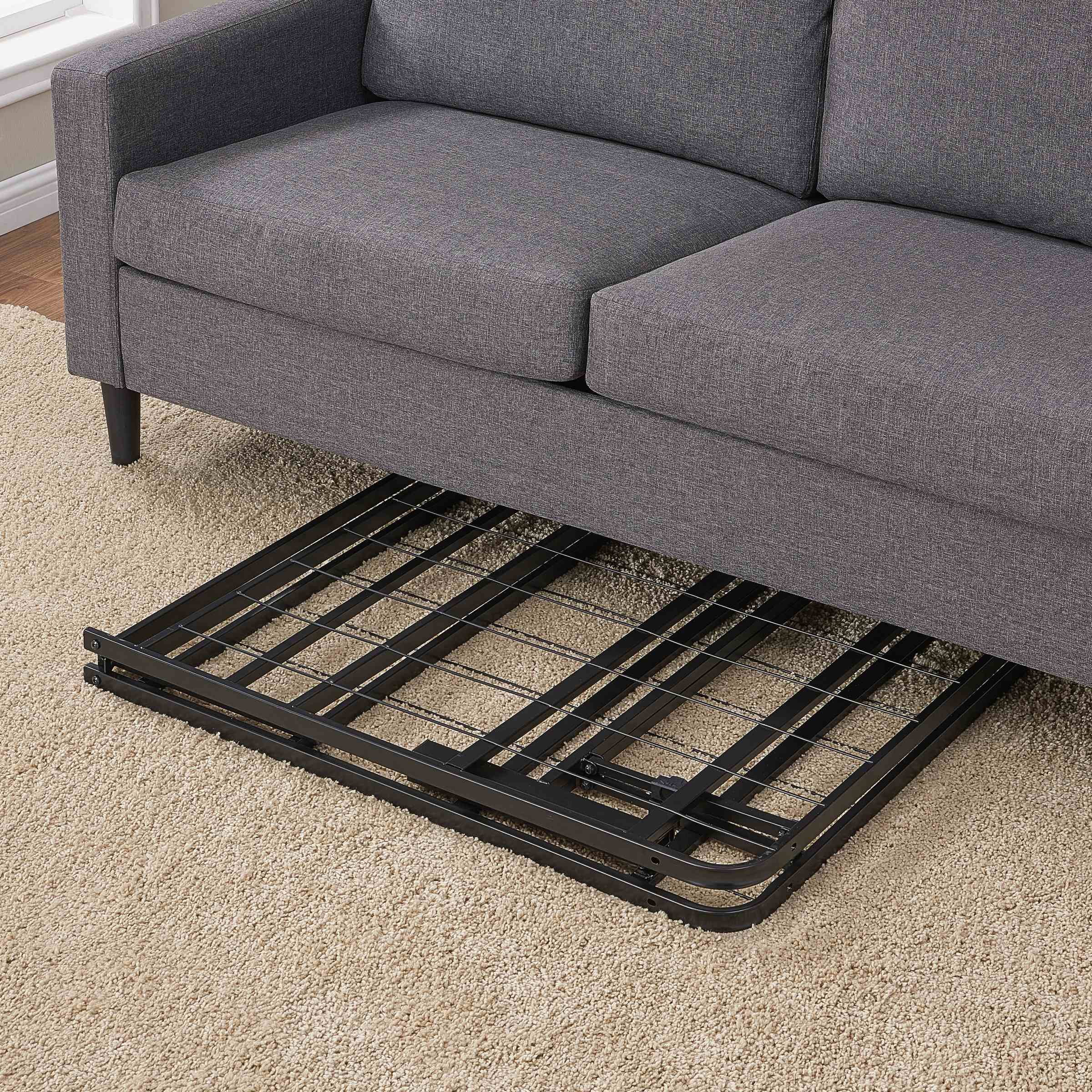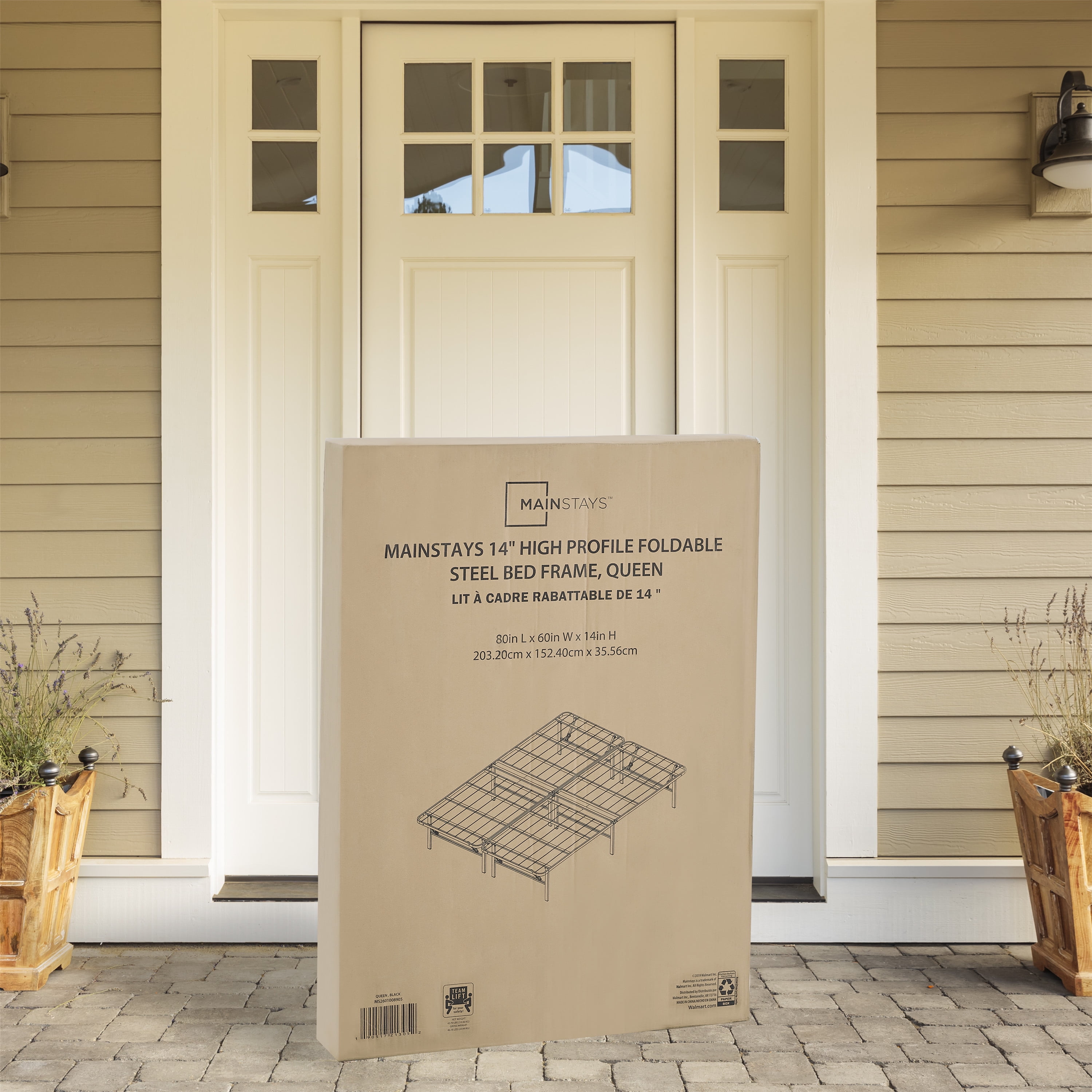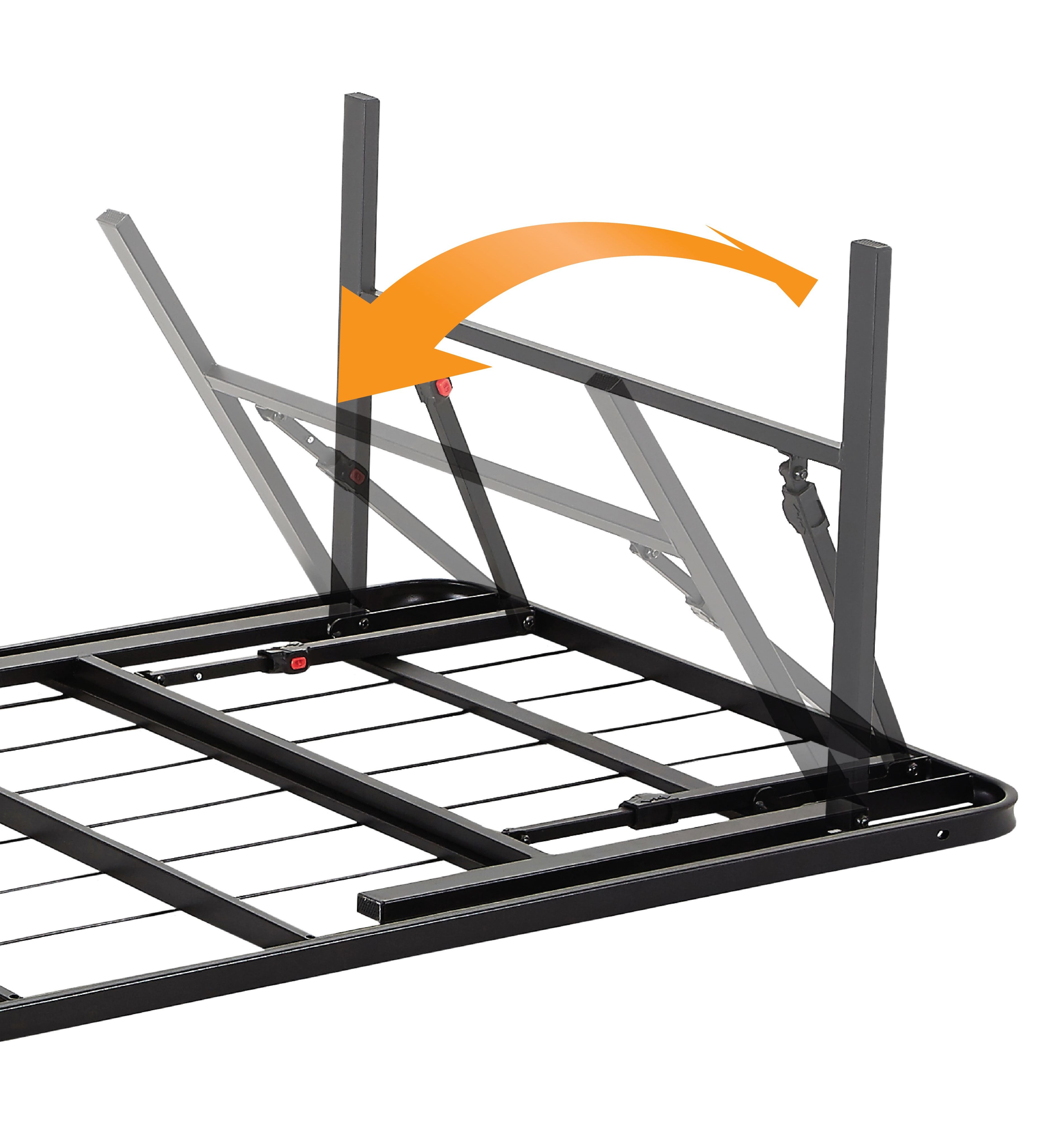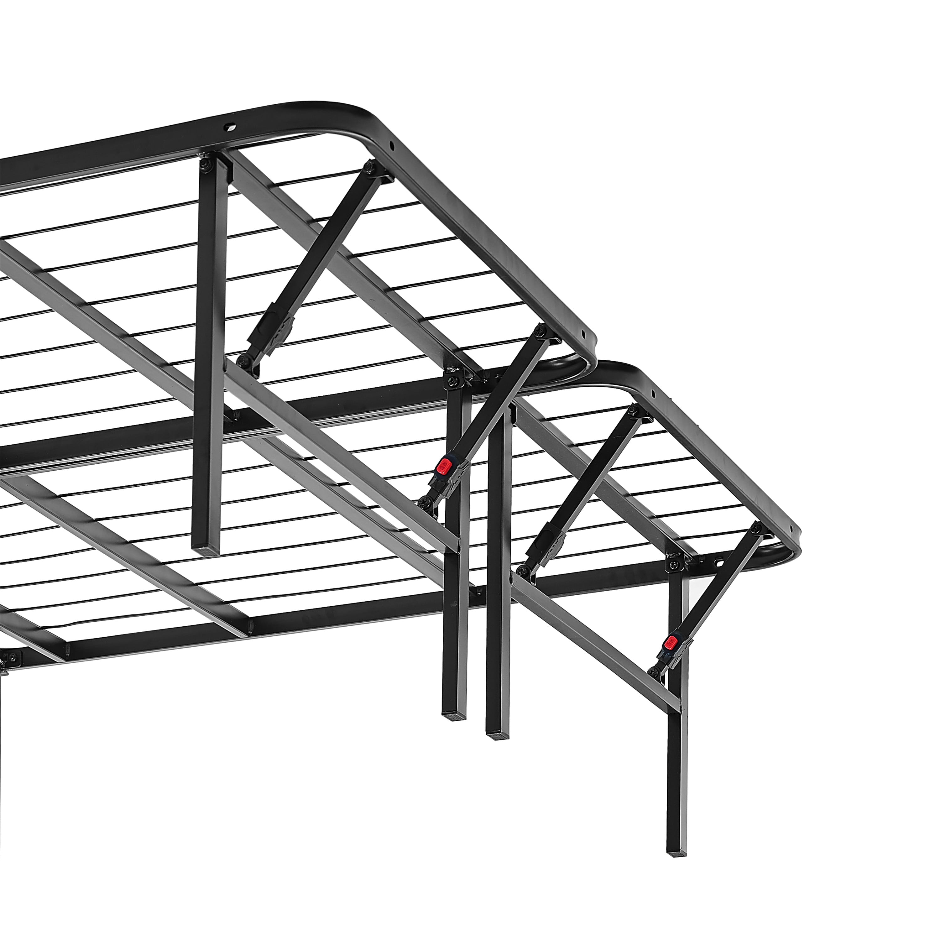 Mainstays 14” High Profile Foldable Platform Bed Frame, Queen, Black: Durable steel construction to stand up to wear and tear Featuring a classic powder-coated black steel finish Allows you to place your mattress directly onto the platform with no box spring required. Reliable support under innerspring, memory foam, and combination mattresses? Features a button locking system that keeps the bed fully sturdy, allows the frame to fold away for easy storage and transport Designed with capped feet to ensure no damage occurs to your floor Fast and easy to assemble with no tools required for set-up? Fits inside most standard bed frames Mattresses sold separately? Ideal for use in a guest bedroom, child or teen bedroom, or in your master bedroom Assembled Product Dimensions: Twin: 75″L x 39″W x 14″H (600 lb. weight capacity) Twin XL: 80″L x 39″W x 14″H (600 lb. weight capacity) Full: 75″L x 54″W x 14″H (1200 lb. weight capacity) Queen: 80″L x 60″W x 14″H (1200 lb. weight capacity) King: 80″L x 76″W x 14″H (1200 lb. weight capacity) California King: 84″L x 72″W x 14″H (1200 lb. weight capacity)? Shipping Product Dimensions: Twin Shipping dimensions: 40″ x 3.35″ x 38.8″ / Shipping weight: 29.67 lbs. Twin XL Shipping dimensions: 40″ x 3.35″ x 40.75″ / Shipping weight: 30.16 lbs. Full Shipping dimensions: 27.76″ x 5.7″ x 38.8″ / Shipping weight: 42.81 lbs. Queen Shipping dimensions: 30.71″ x 5.71″ x 41.14″ / Shipping weight: 46.16 lbs. King Shipping dimensions: 38.98″ x 5.71″ x 41.14″ / Shipping weight: 53.57 lbs. California King Shipping dimensions: 36.81″ x 5.71″ x 43.31″ / Shipping weight: 53.57 lbs.