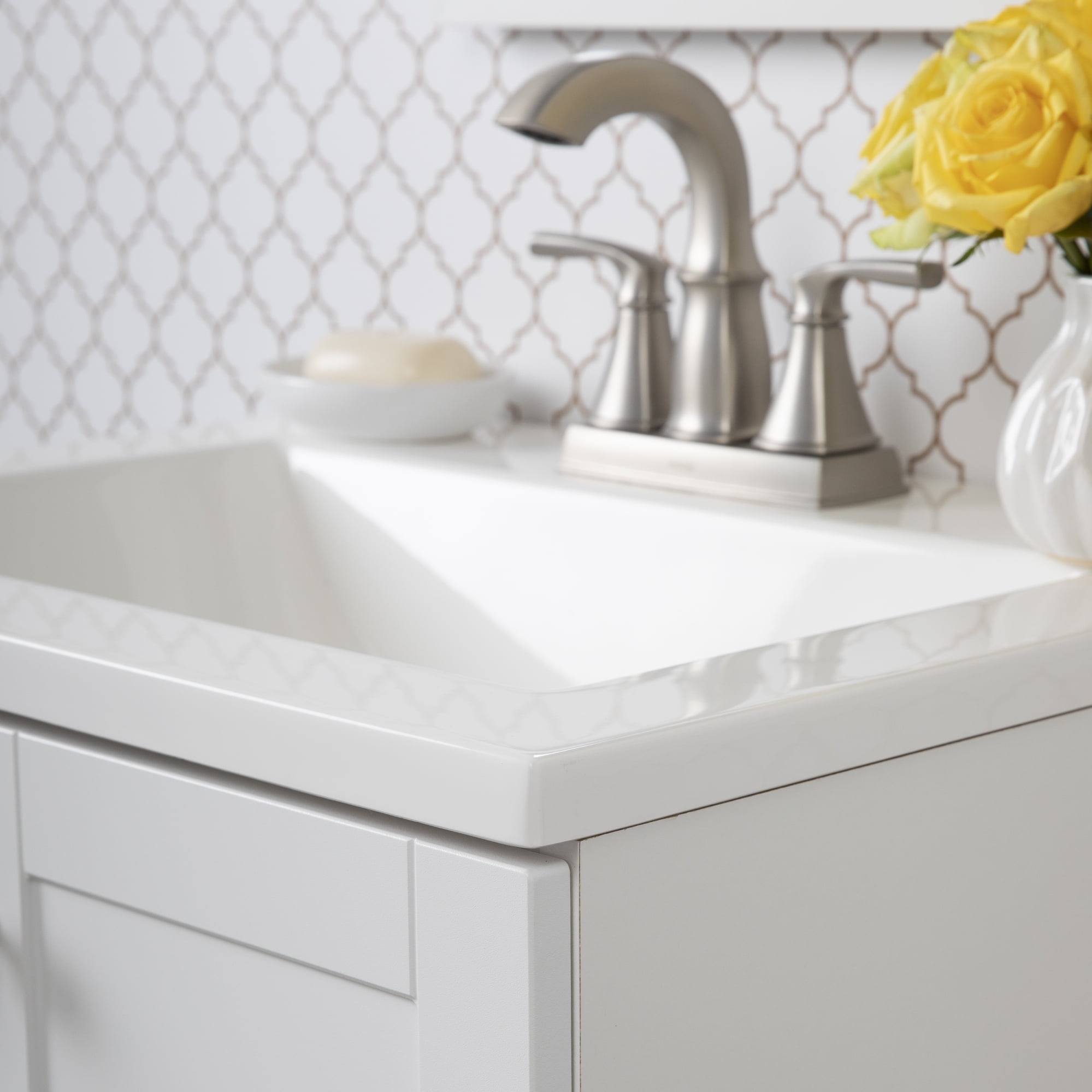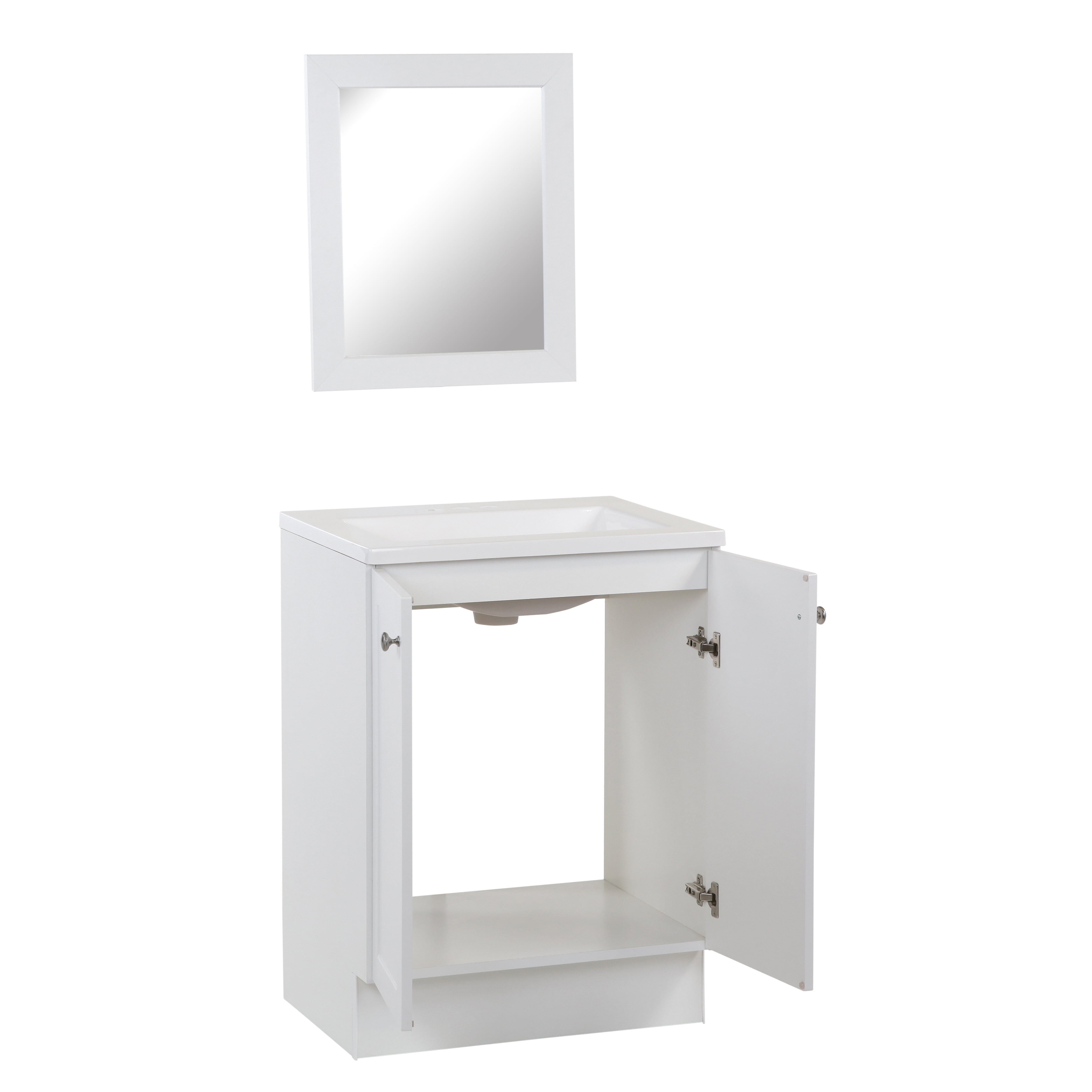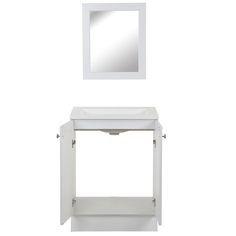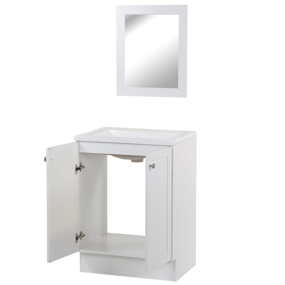 Inspire guests and introduce a new concept into your home with the Mainstays vanity in White. The transitional stylings of the 2 shaker style doors grant you the freedom to mix and match with your room decor, casting aside any fears or challenges that may come with styling your home. The brilliant White vanity is paired with a matching wall mirror and solid white vanity top with an integrated rectangular sink for a uniform appearance. Designed with open cabinet space for maximum storage capacity, the Mainstays vanity is easy to use and easy to install.