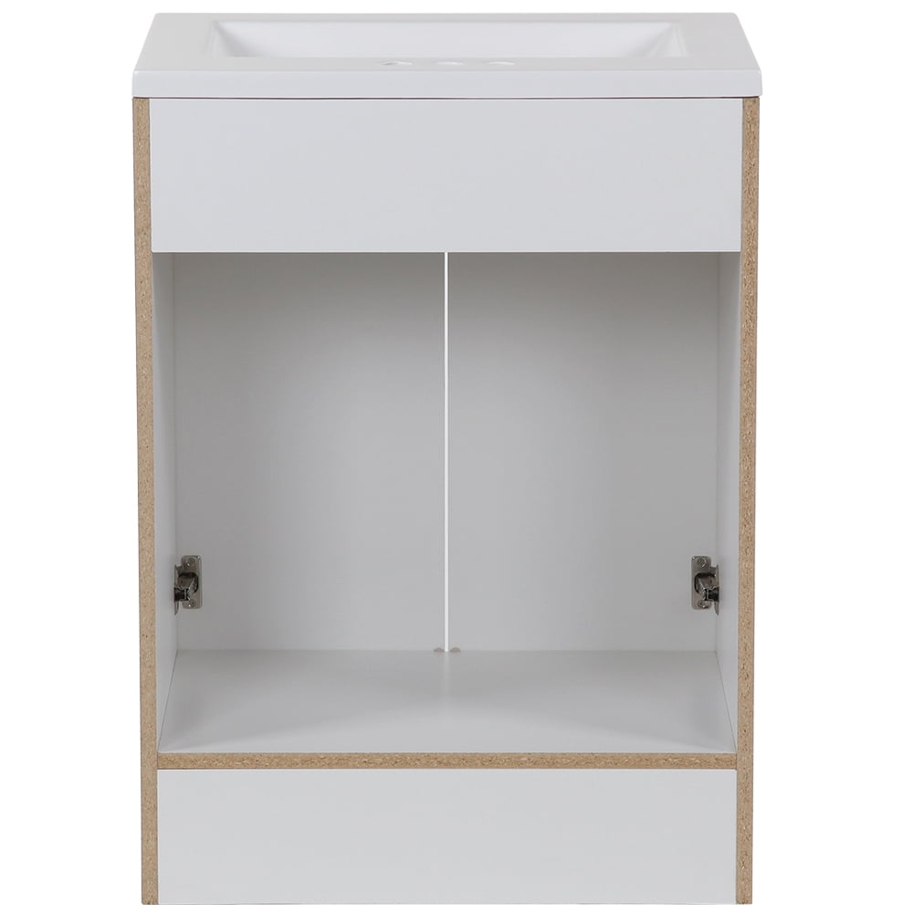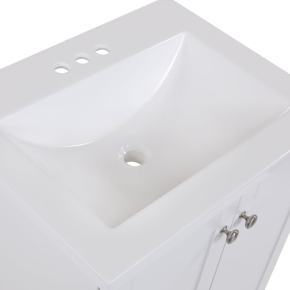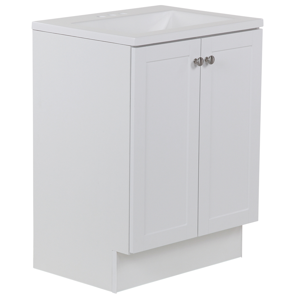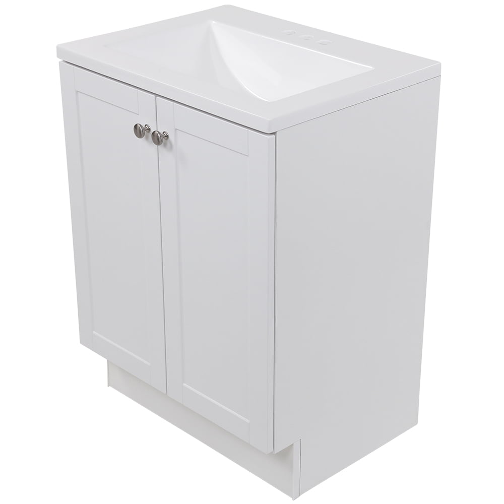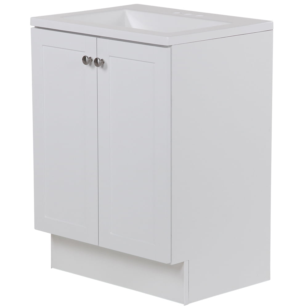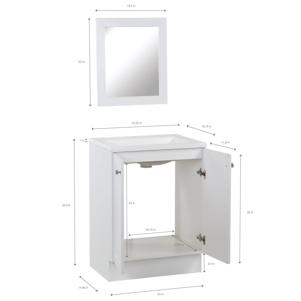 Assembled vanity dimensions are 24.25 in. W x 18.75 in. D x 32.93 in. H White vanity top and sink with 4.50 in. of behind the sink surface area for easy storage Open cabinet back for easy plumbing access, faucet and drain not included 2 versatile shaker style doors with 6-way adjustable hinges included for easy alignment Spacious behind-the-door area for all your bath needs The vanity cabinet is fully assembled and ready to install