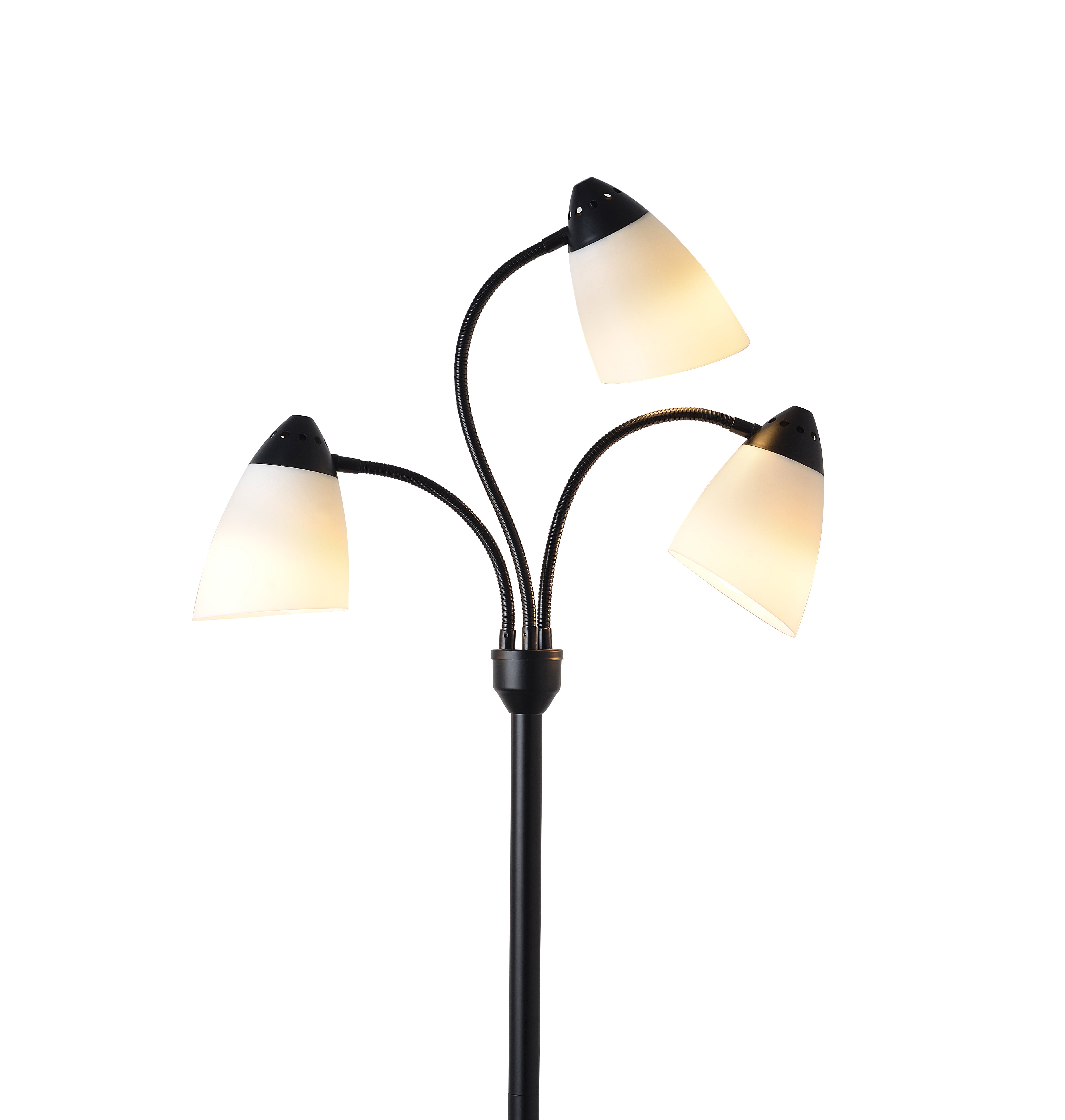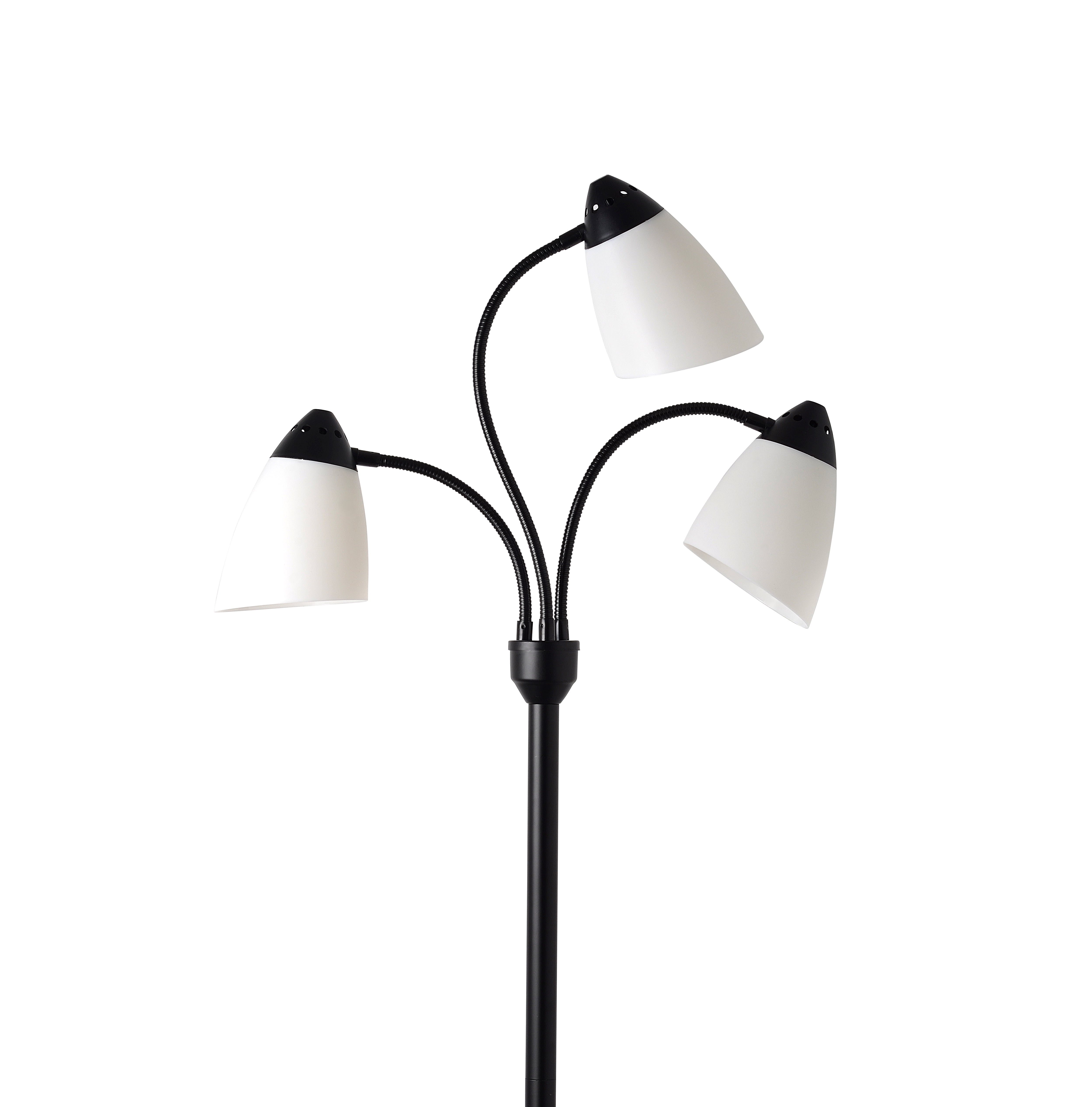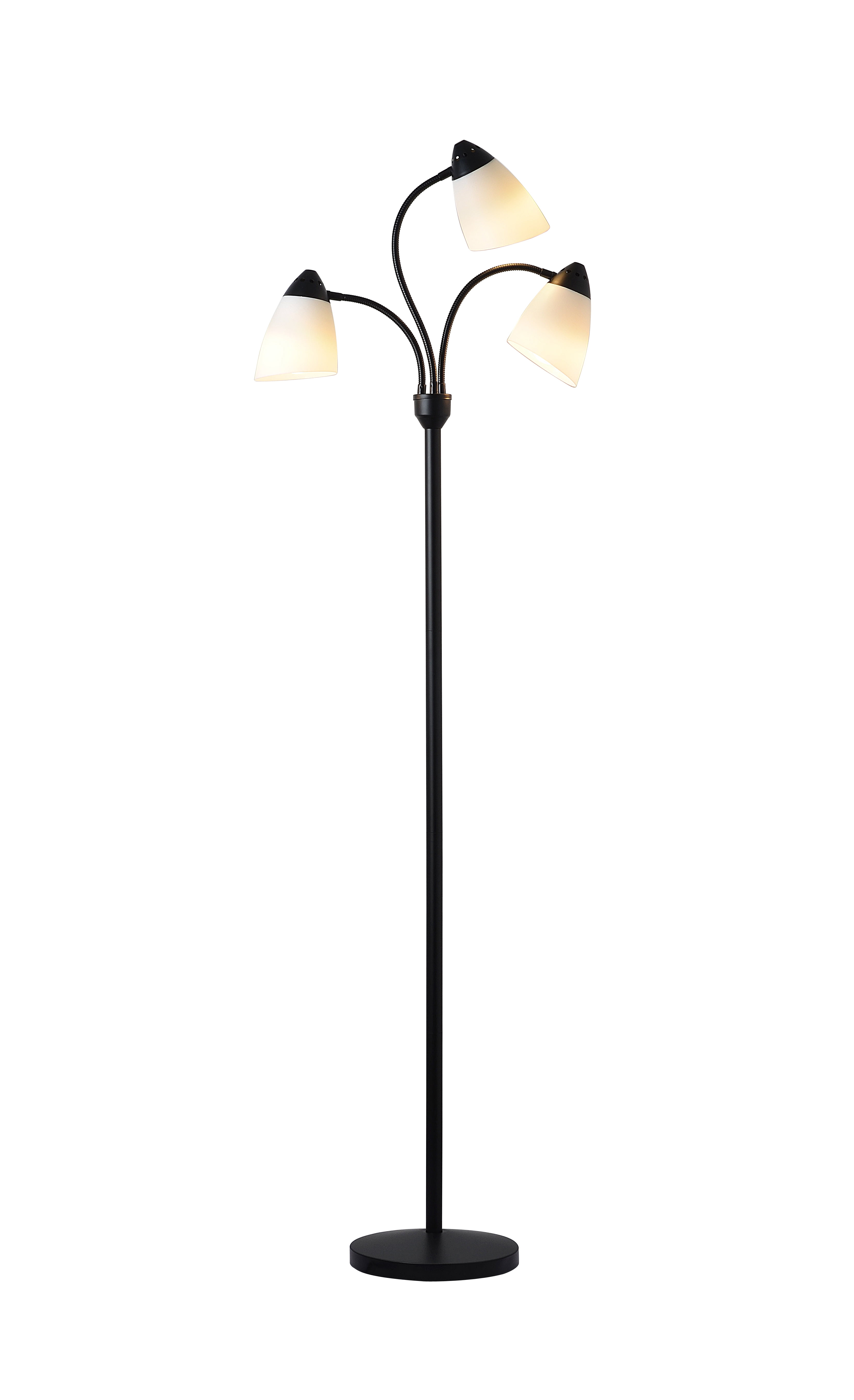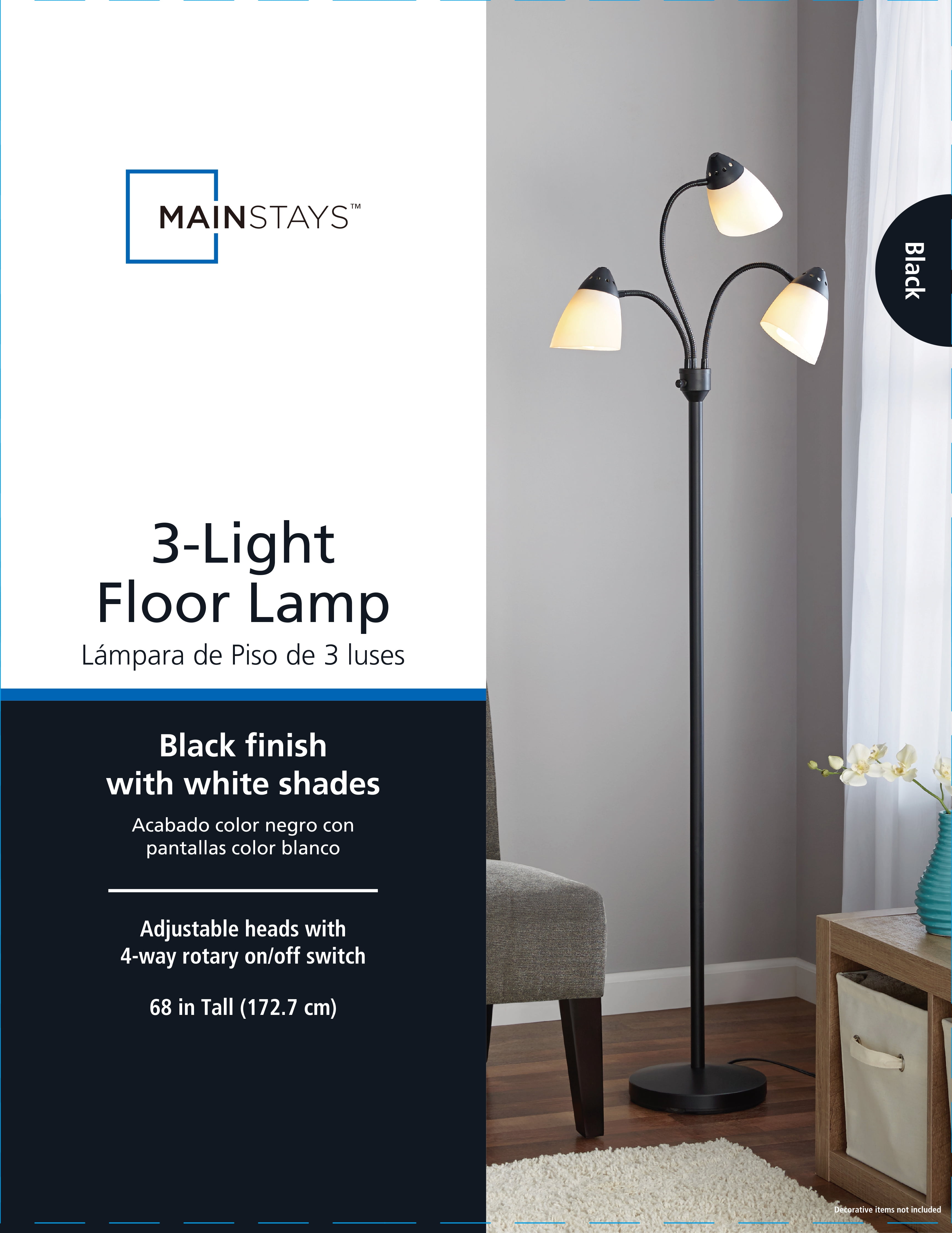 The Classic Silhouette Of The Mainstays 3-Headed Floor Lamp Proves That Classic Design And Functionality Can Go Hand In Hand. The 68 Inch Tall Lamp Includes Three Adjustable And Flexible Goose Neck Arms That Allow You To Have Full Control Over The Light’S Direction Anywhere It Sits. Each 5 Inch White Plastic Shade Houses A 9 Watt Led Bulb, Which Are Included So The Lamp Is Ready To Shine Upon Assembly. The Lamp Is Set On A Sturdy Metal Base While Remaining Lightweight And Easy To Move. This Lamp Is The Perfect Fit For Areas Big Or Small, Whether It’S A Living Room, Bedroom, Office, Or College Living Space.
