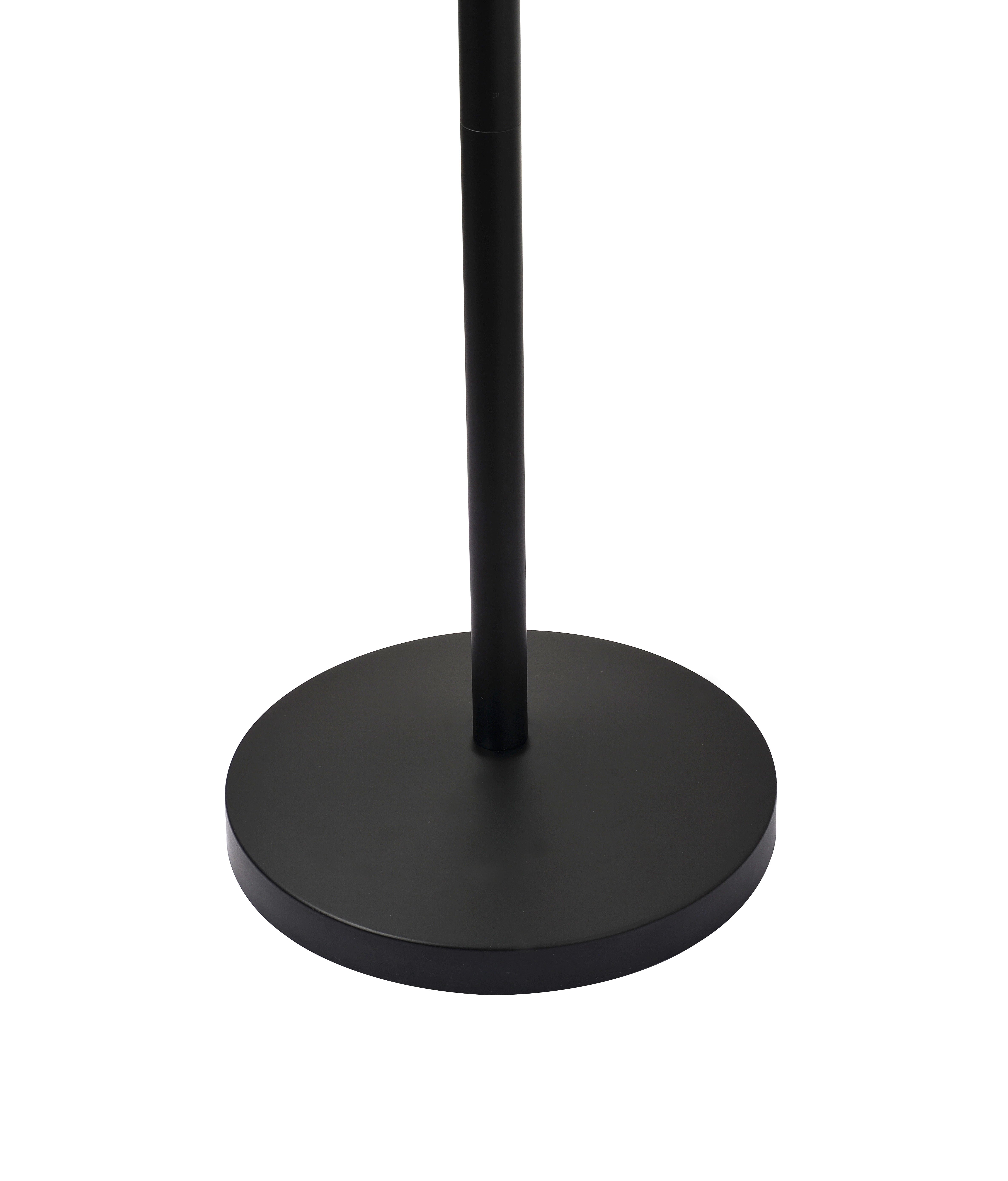 Mainstays 3 Head Floor Lamp with LED Bulbs Included Black plastic body. Adjustable and flexible goose necks. 68” height. 9 watt LED bulbs included (3). 3 white plastic shades. Sturdy metal base. Black cord. Easy to use 4-way rotary switch: one light/two lights/3 lights/off Plastic shade size: 5” x 5” x 1.25” Metal base diameter: 6” x 1.25”