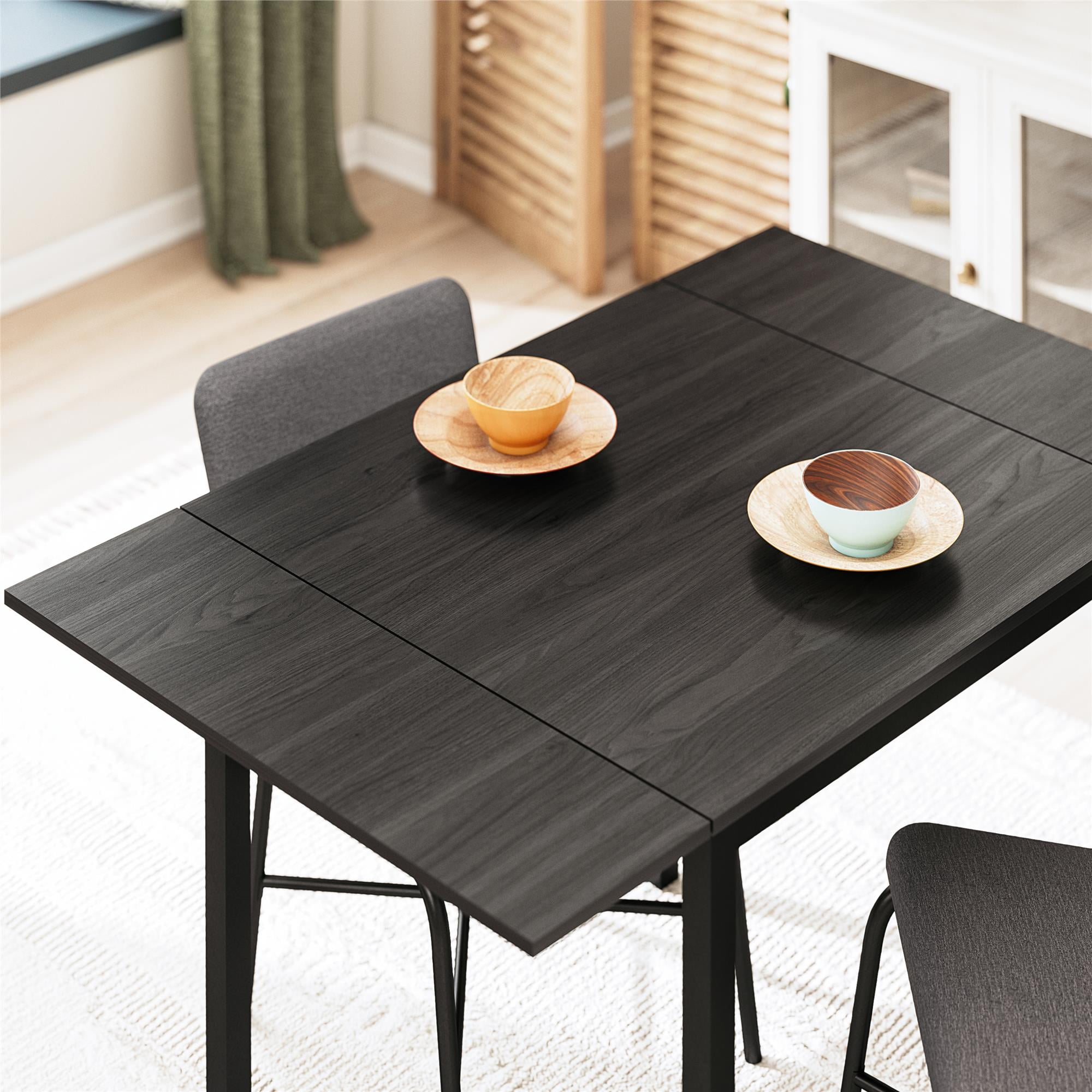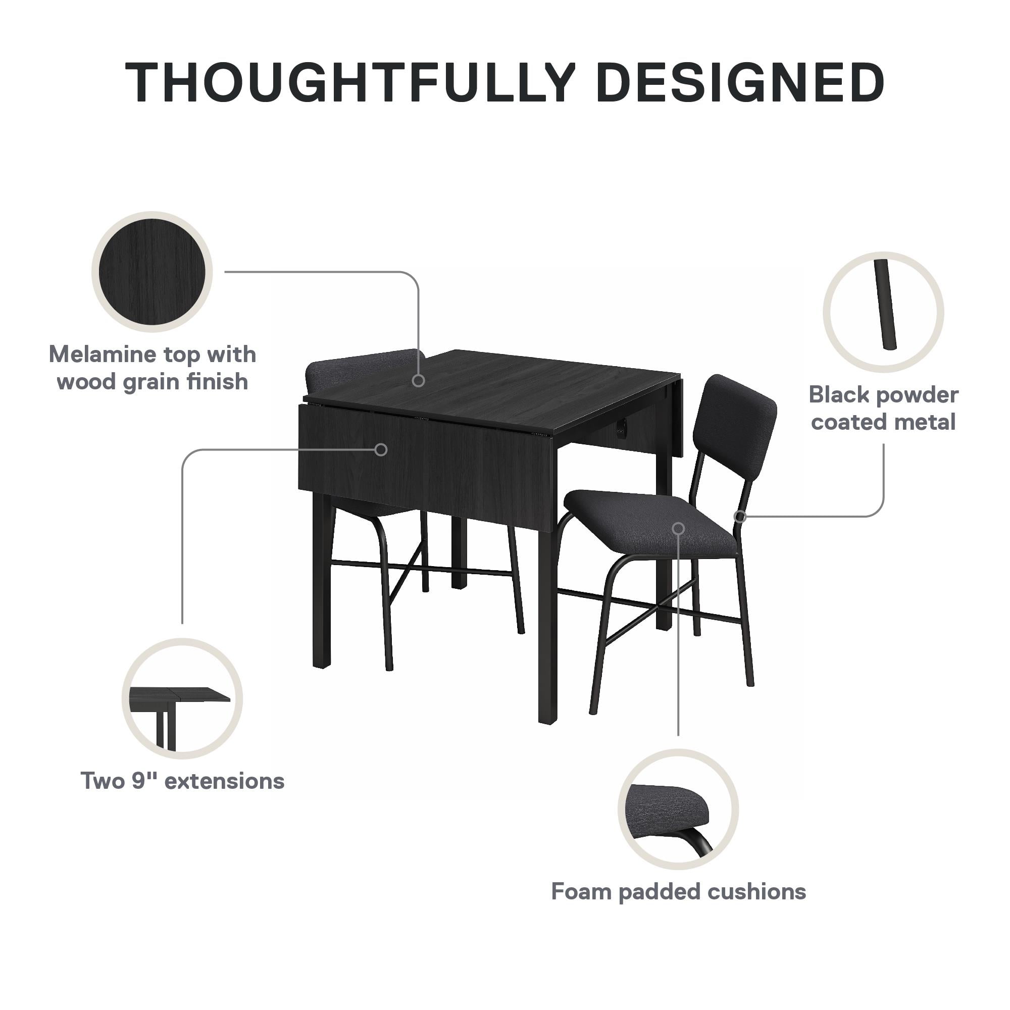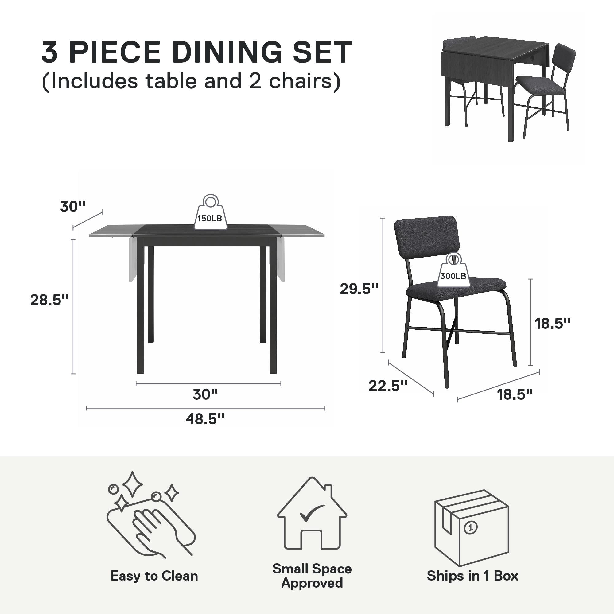 SPACE SAVING 3-PIECE DINING SET: Our extendable dining table set includes a 30″W x 30″D square table with 2-sided folding extensions, fully expanding to 48.5″W x 30″D, and 2 dining chairs – perfect as a small dining room set for small spaces or apartments FLEXIBLE DINING SOLUTION: The drop leaf kitchen table set easily converts from a cozy breakfast nook for two to a sizable dinette for entertaining guests. Ideal as a kitchen and dining room set, the small drop leaf dining table with chairs fits any corner COZY, STURDY, CASUAL: Foam-padded seats and back cushions offer comfort, and the powder-coated metal frame delivers long-lasting stability. Each dining chair supports up to 300 lbs., while the strong table holds up to 150 lbs., ensuring hardy everyday use SLEEK DESIGN: Enjoy the chic black melamine woodgrain finish tabletop, complemented by robust black metal legs and dark gray fabric upholstered chair cushions, giving your dining room table set a clean look with a low-maintenance and simple-to-clean setup ASSEMBLES FAST: Entire set ships in one box for easy assembly. Table – (Closed): 30″L x 30″W x 28.5″H. (Fully open): 48.5″L x 30″W x 28.5″H. (Partially open): 40″L x 30″W x 28.5″H. Chair: 19″L x 22.5″W x 29.5″H. Net weight: 69 lbs. 1-year limited warranty