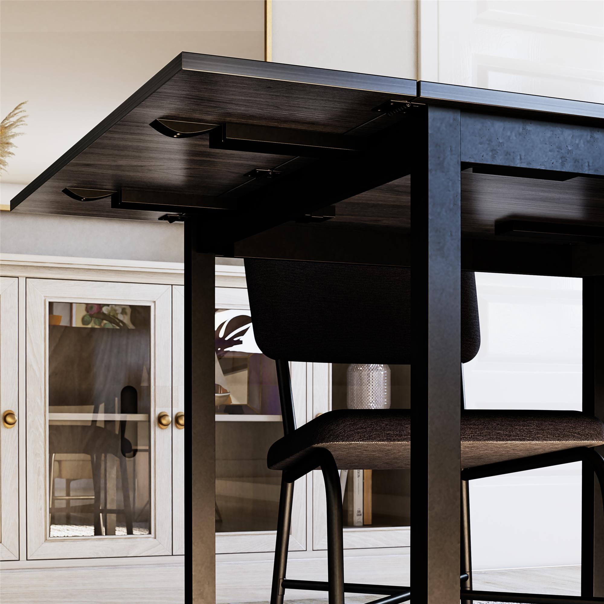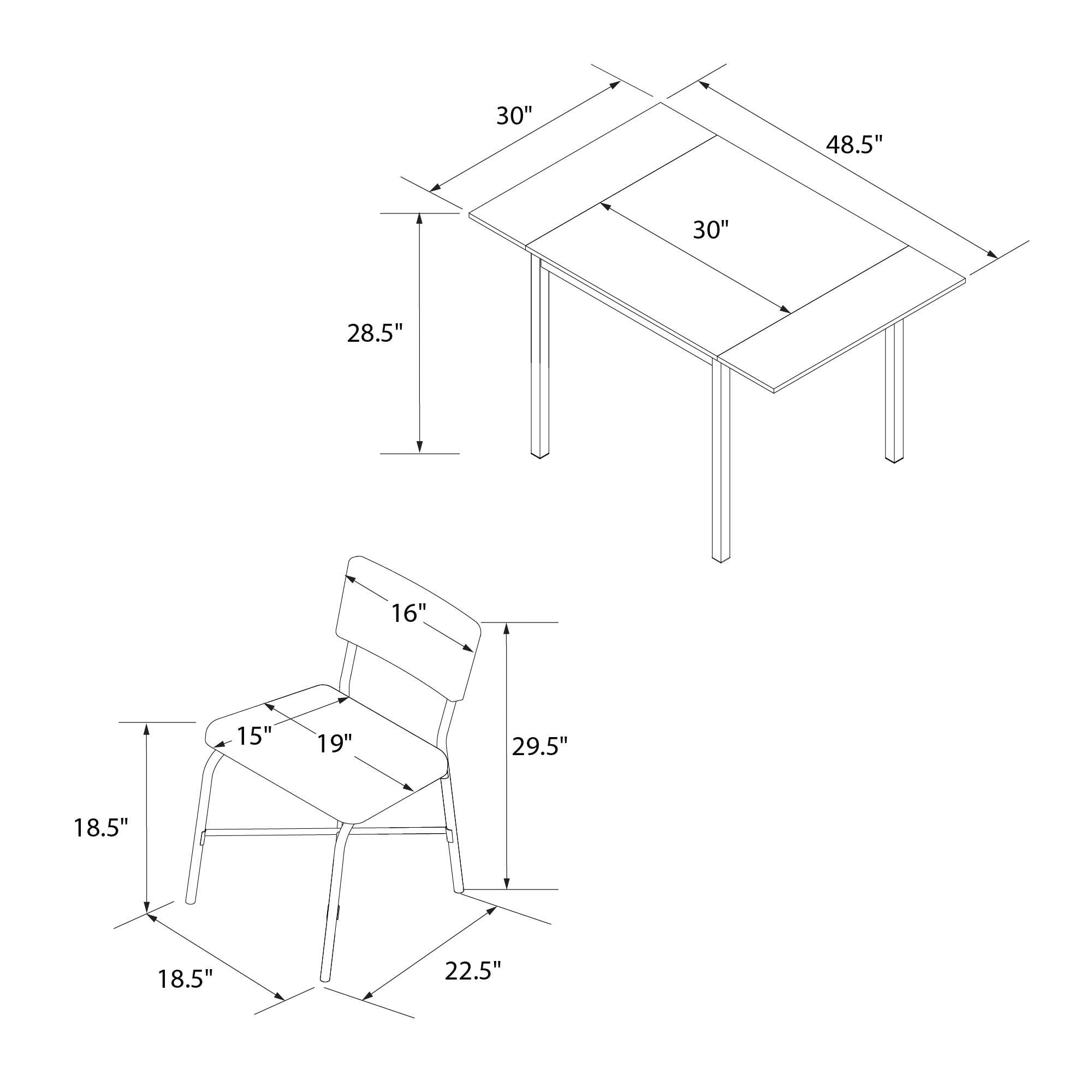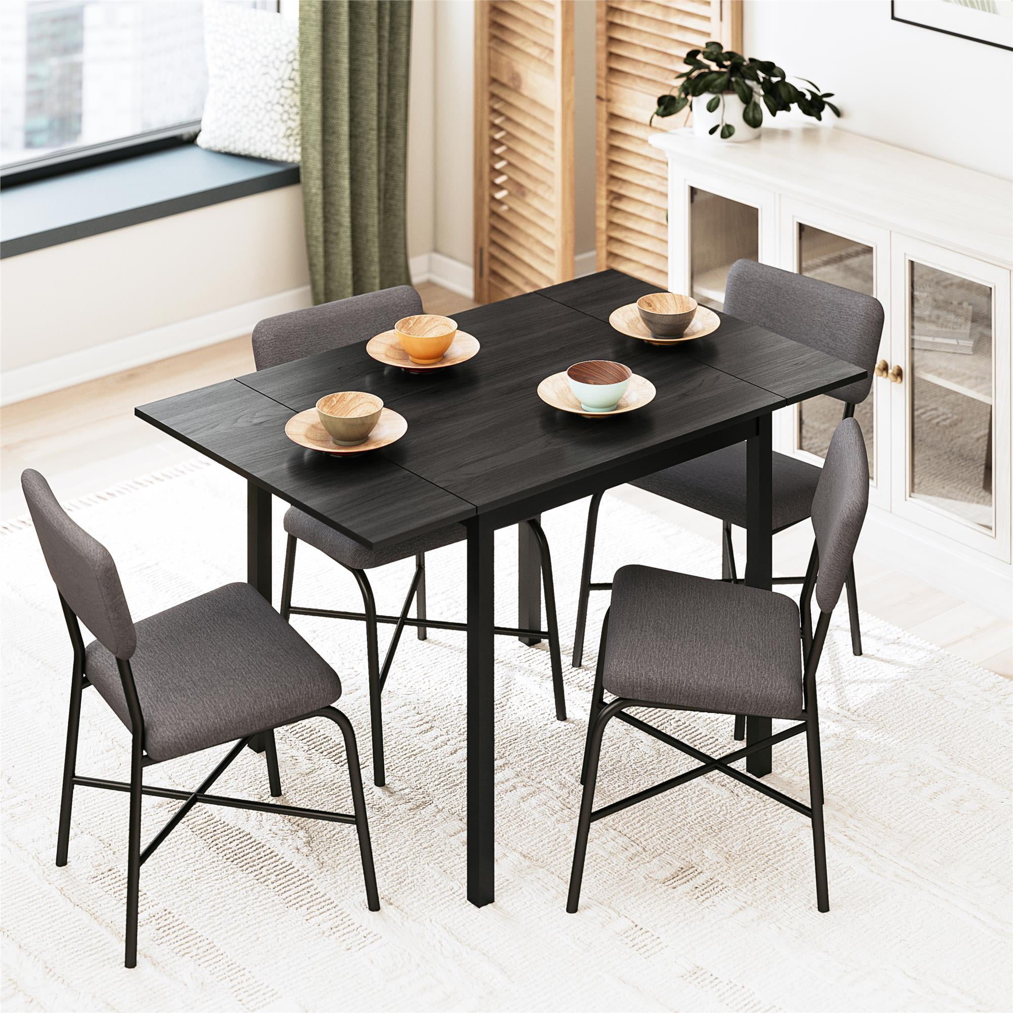 SPACE SAVING 3-PIECE DINING SET: Our extendable dining table set includes a 30″W x 30″D square table with 2-sided folding extensions, fully expanding to 48.5″W x 30″D, and 2 dining chairs – perfect as a small dining room set for small spaces or apartments FLEXIBLE DINING SOLUTION: The drop leaf kitchen table set easily converts from a cozy breakfast nook for two to a sizable dinette for entertaining guests. Ideal as a kitchen and dining room set, the small drop leaf dining table with chairs fits any corner COZY, STURDY, CASUAL: Foam-padded seats and back cushions offer comfort, and the powder-coated metal frame delivers long-lasting stability. Each dining chair supports up to 300 lbs., while the strong table holds up to 150 lbs., ensuring hardy everyday use SLEEK DESIGN: Enjoy the chic black melamine woodgrain finish tabletop, complemented by robust black metal legs and dark gray fabric upholstered chair cushions, giving your dining room table set a clean look with a low-maintenance and simple-to-clean setup ASSEMBLES FAST: Entire set ships in one box for easy assembly. Table – (Closed): 30″L x 30″W x 28.5″H. (Fully open): 48.5″L x 30″W x 28.5″H. (Partially open): 40″L x 30″W x 28.5″H. Chair: 19″L x 22.5″W x 29.5″H. Net weight: 69 lbs. 1-year limited warranty