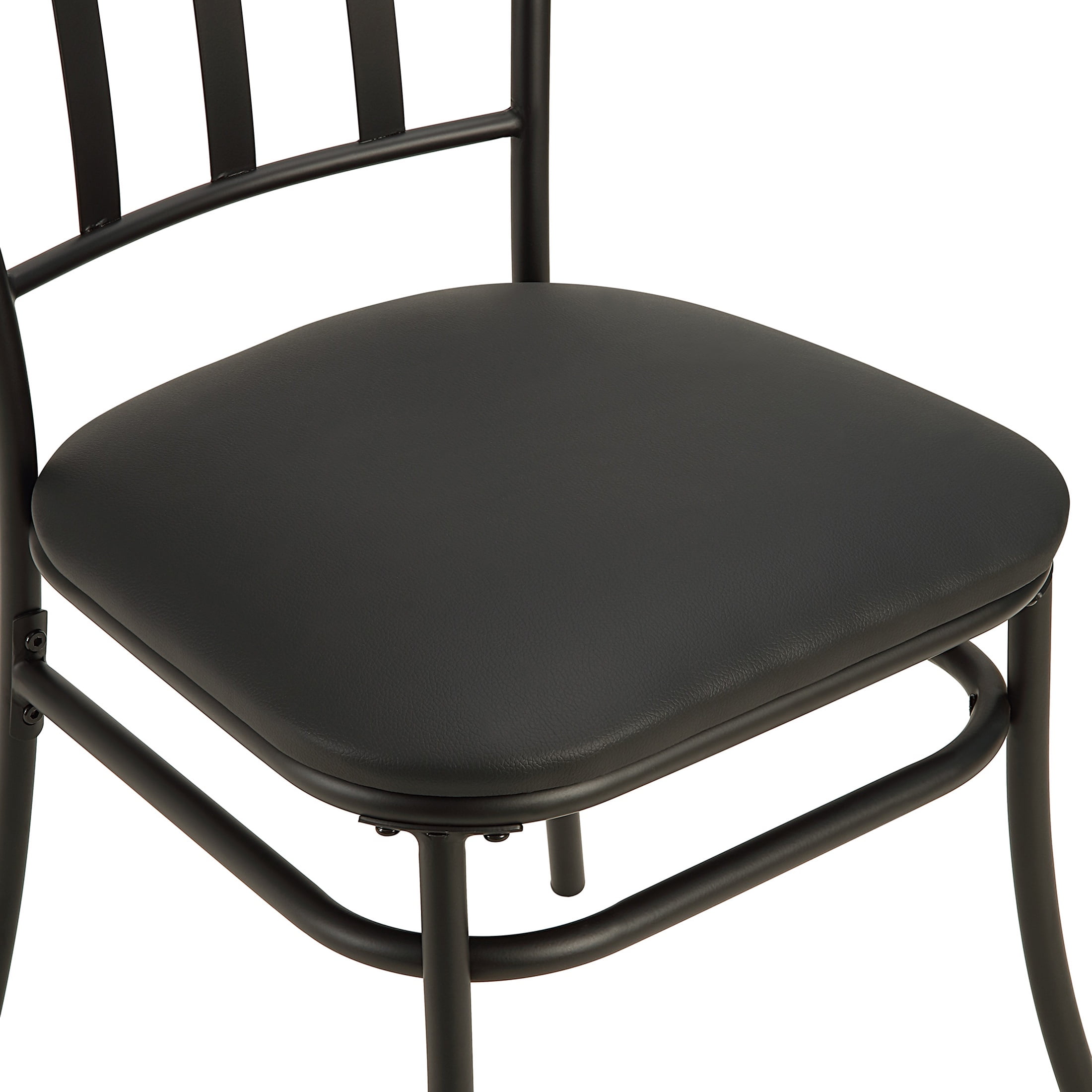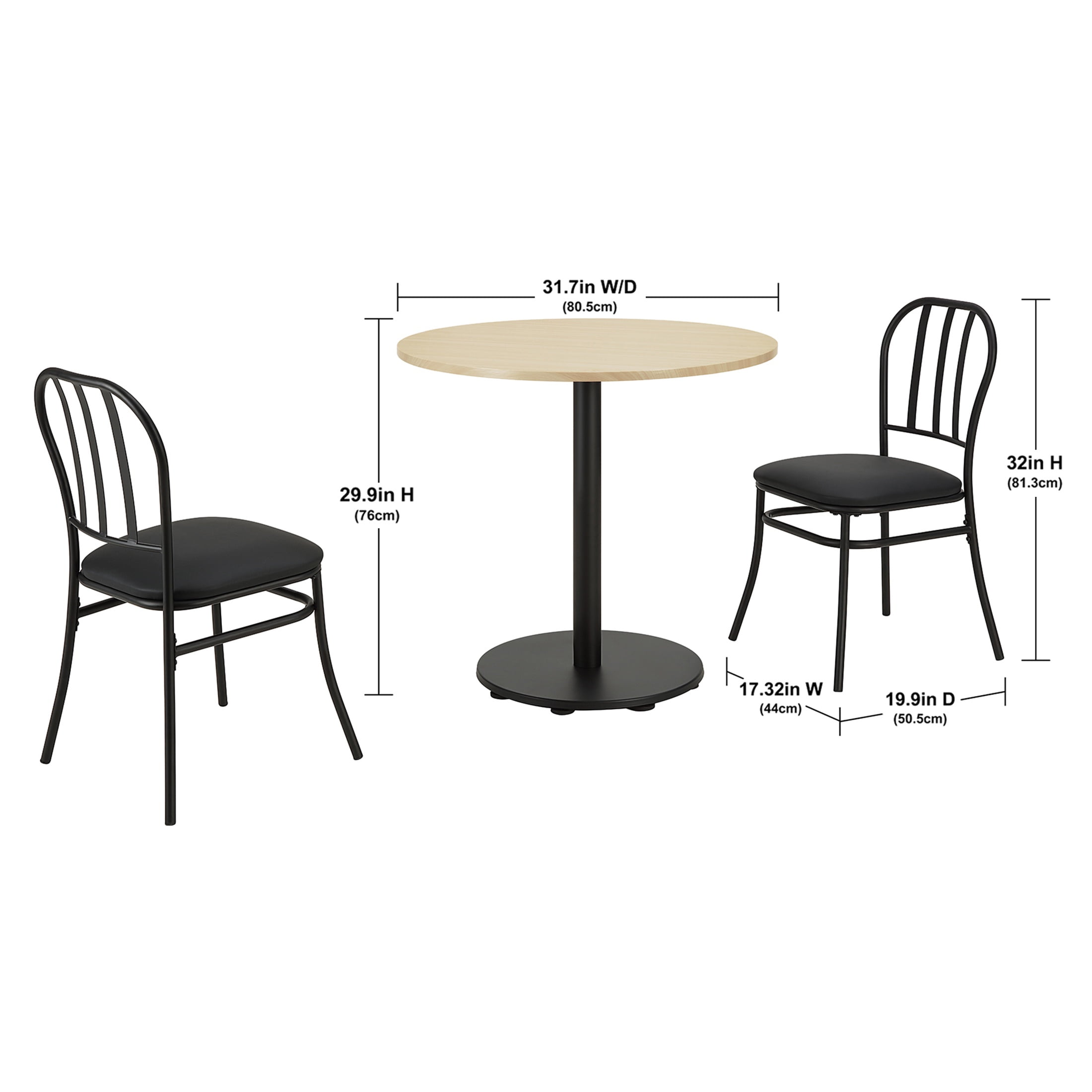 Mainstays 3 Piece Indoor Dining Bistro Set, Wood Table Top, Two Black Seat Chairs Comes with 3 piece indoor bistro set 1 Table with wood veneer top 2 Chairs with black polyester seat Durable steel frame for a long life Chair weight capacity 300lbs Table weight capacity 50 lbs Arrives in 1 box