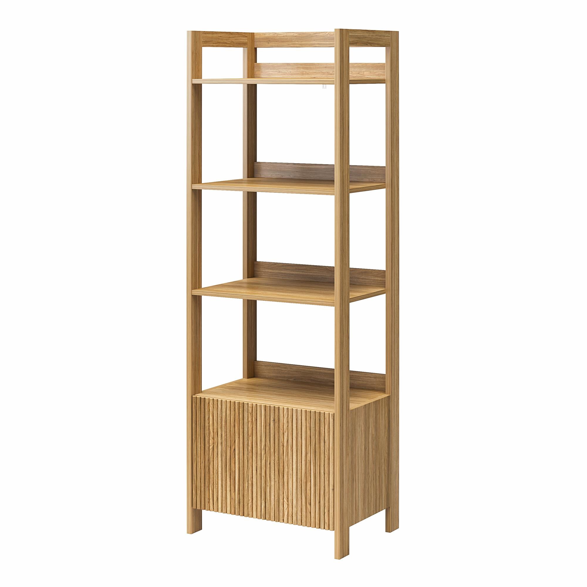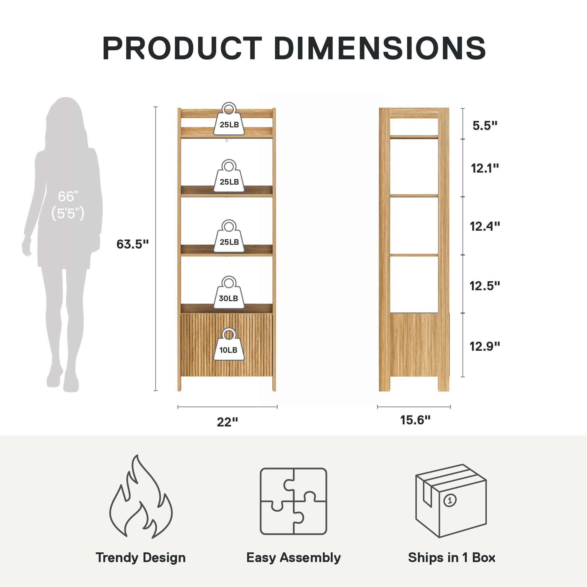NARROW BOOKSHELF FOR LIVING ROOM, HOME OFFICE, STUDY, DINING ROOM OR ENTRYWAY: Optimize storage and enhance your décor with the chic Mainstays 4-Tier Bookcase, crafted from durable engineered wood with a natural teak finish MODERN BOOKCASE WITH AMPLE DISPLAY SPACE: Four open shelves provide ample space for displaying books, collectibles, or decorative items, while the reeded fluted drawer offers hidden storage SECURE AND STABLE 4-SHELF BOOKCASE: Features drawer slides for smooth access and a wall anchor to prevent tipping; IMPORTANT: Unit MUST be secured to wall; Carefully follow assembly manual for proper installation of included anti-tip safety bracket FUNCTIONAL AND ELEGANT LADDER BOOKSHELF: Fits seamlessly into modern or Mid-century modern aesthetics, with straightforward assembly instructions; Constructed from durable MDF engineered wood with woodgrain laminate; 1-year limited warranty included FREESTANDING STORAGE UNIT SPECIFICATIONS: The tall organizer ships in one box and requires assembly by two adults; Assembled Dimensions: 22.05″ W x 63.39″ H x 15.63″ D; Max weights: Shelves: 25-30 lbs. each; Drawer: 10 lbs.; Assembled weight: 55.34 lbs.