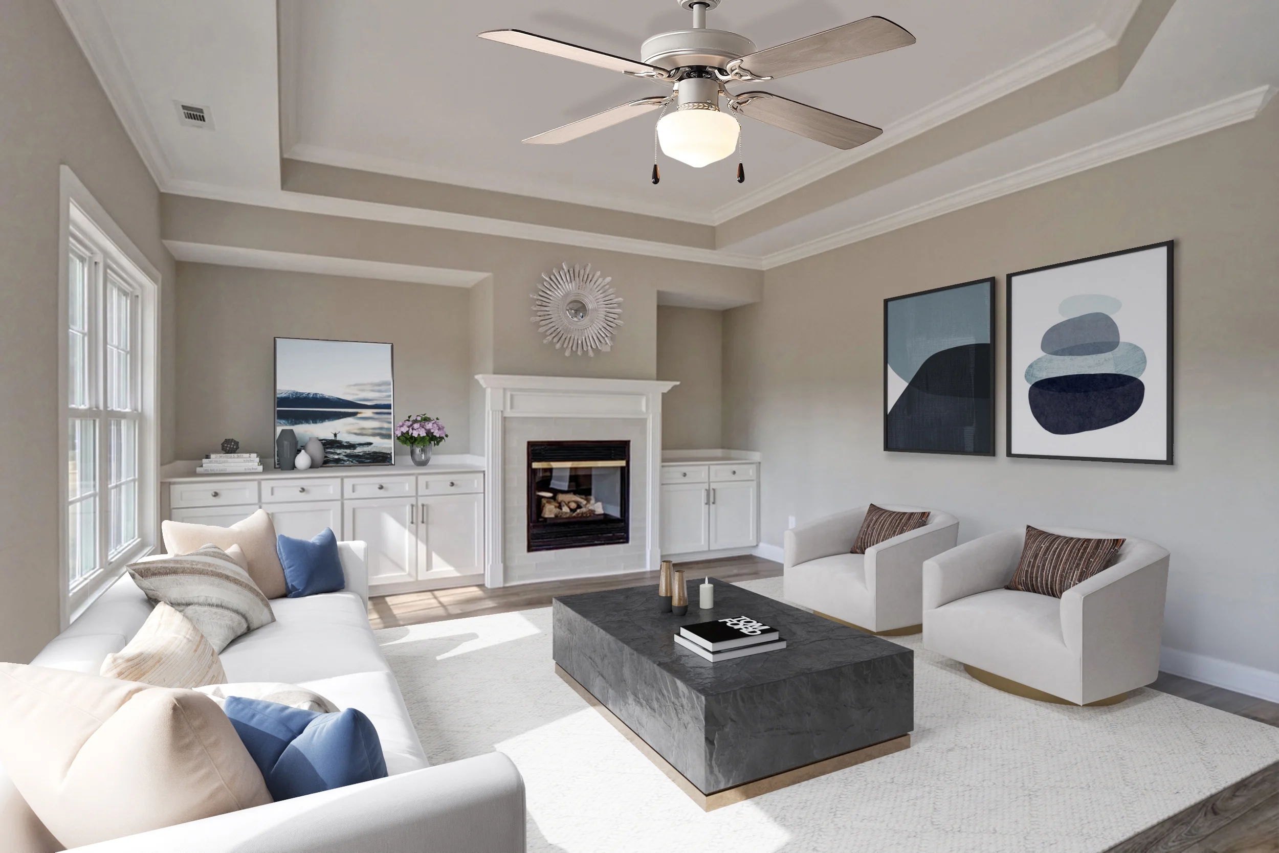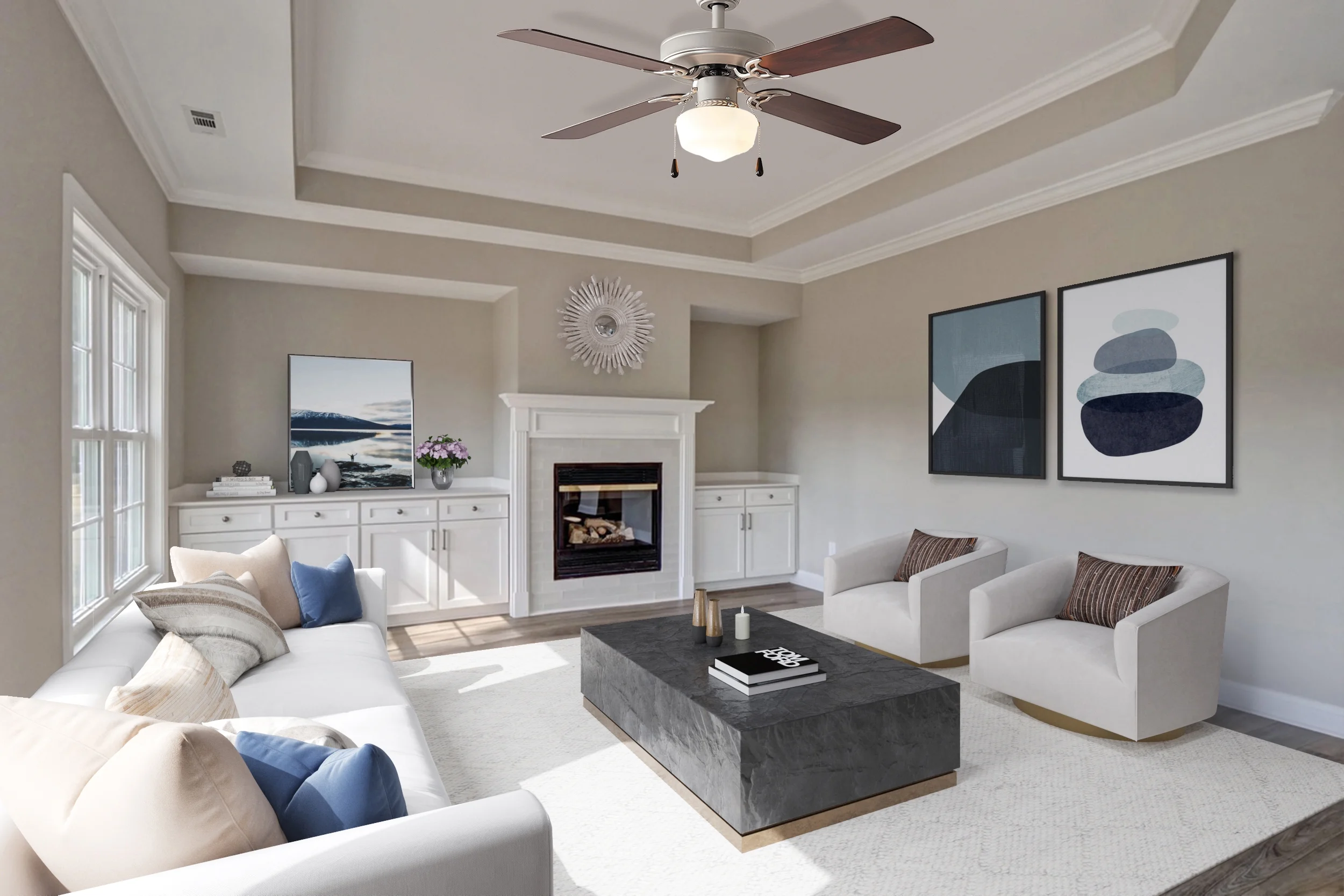Indoor use Satin nickel color QUIET, REVERSIBLE MOTOR: Conveniently quiet, 3 speed – reversible motor for year-round comfort FOUR REVERSIBLE FAN BLADES: Get the perfect finish match with our reversible ceiling fan blades. TRI-MOUNT HANGING OPTIONS — A multi-position fan with 3 hanging options; Standard option offers a 4.5-in downrod (included); Hugger option suitable for low profile; Angle option allows for hanging on vaulted ceilings with a longer downrod (sold separately) 42 INCH DIAMETER PERFECT FOR SMALL & MEDIUM SIZED ROOMS: Perfect for rooms around 15 x 15 feet such as living rooms, bedrooms, dining rooms or family rooms. EASY ON AND OFF: Traditional pull chains included for easy “on and off” adjustments