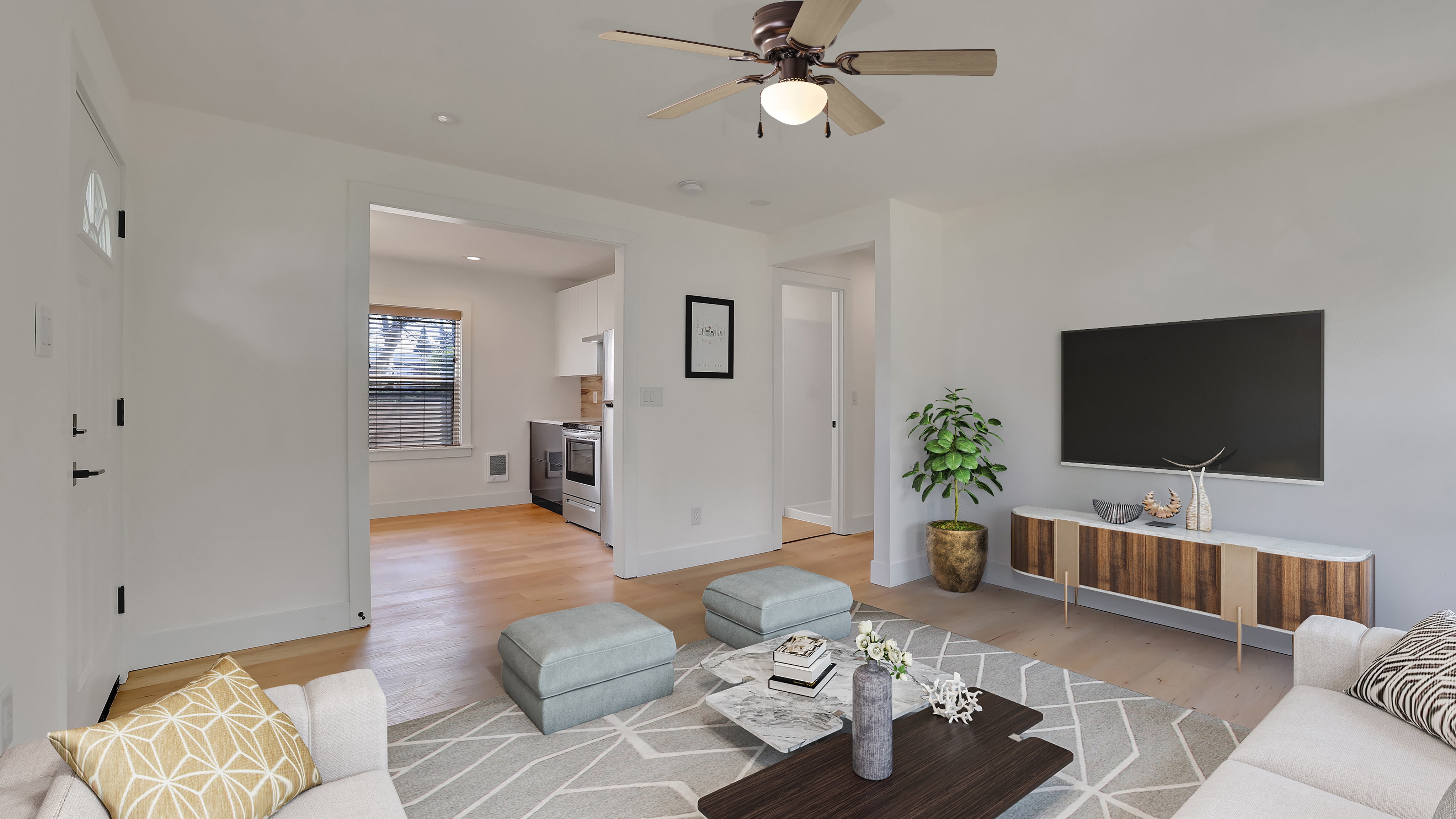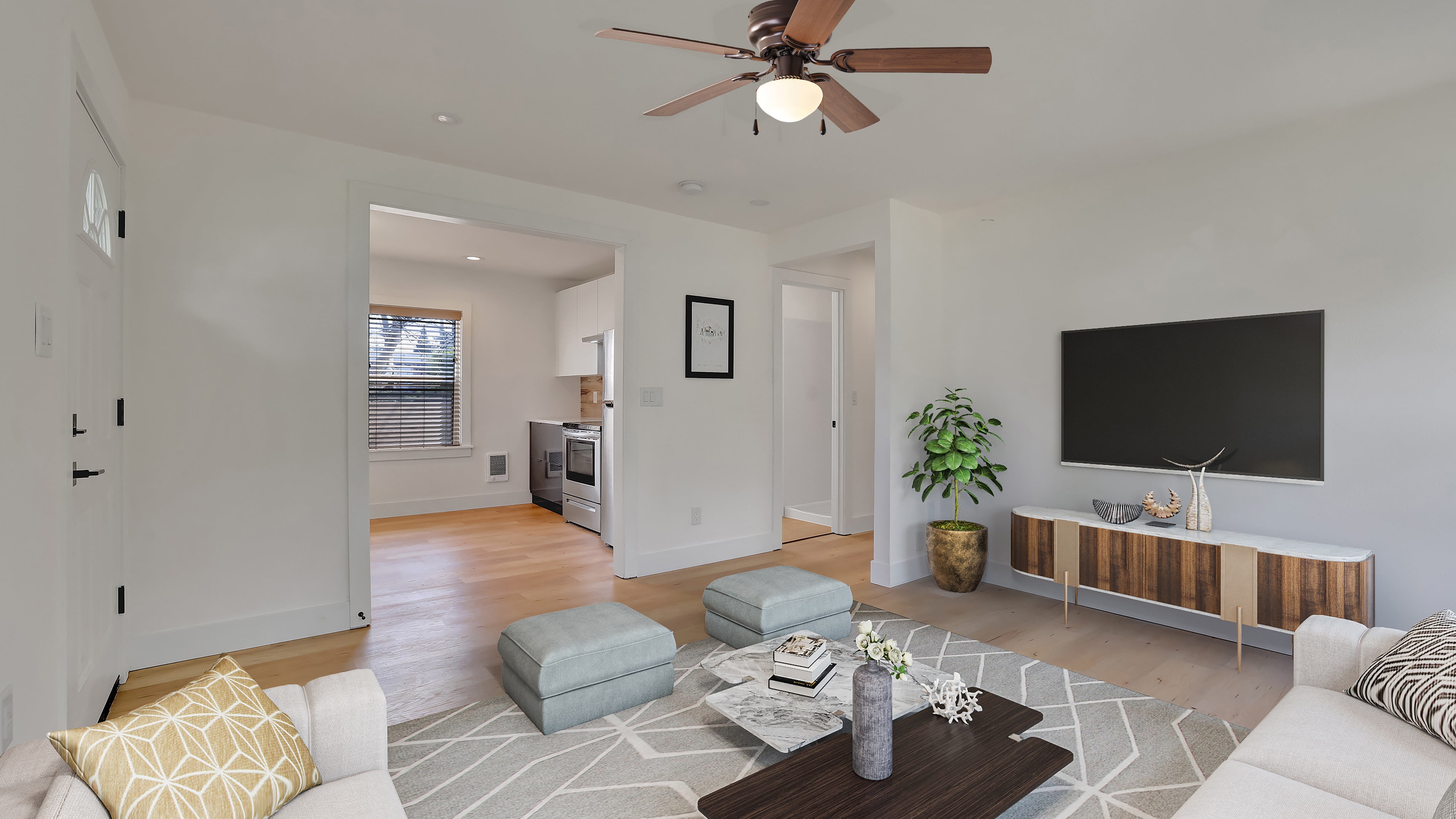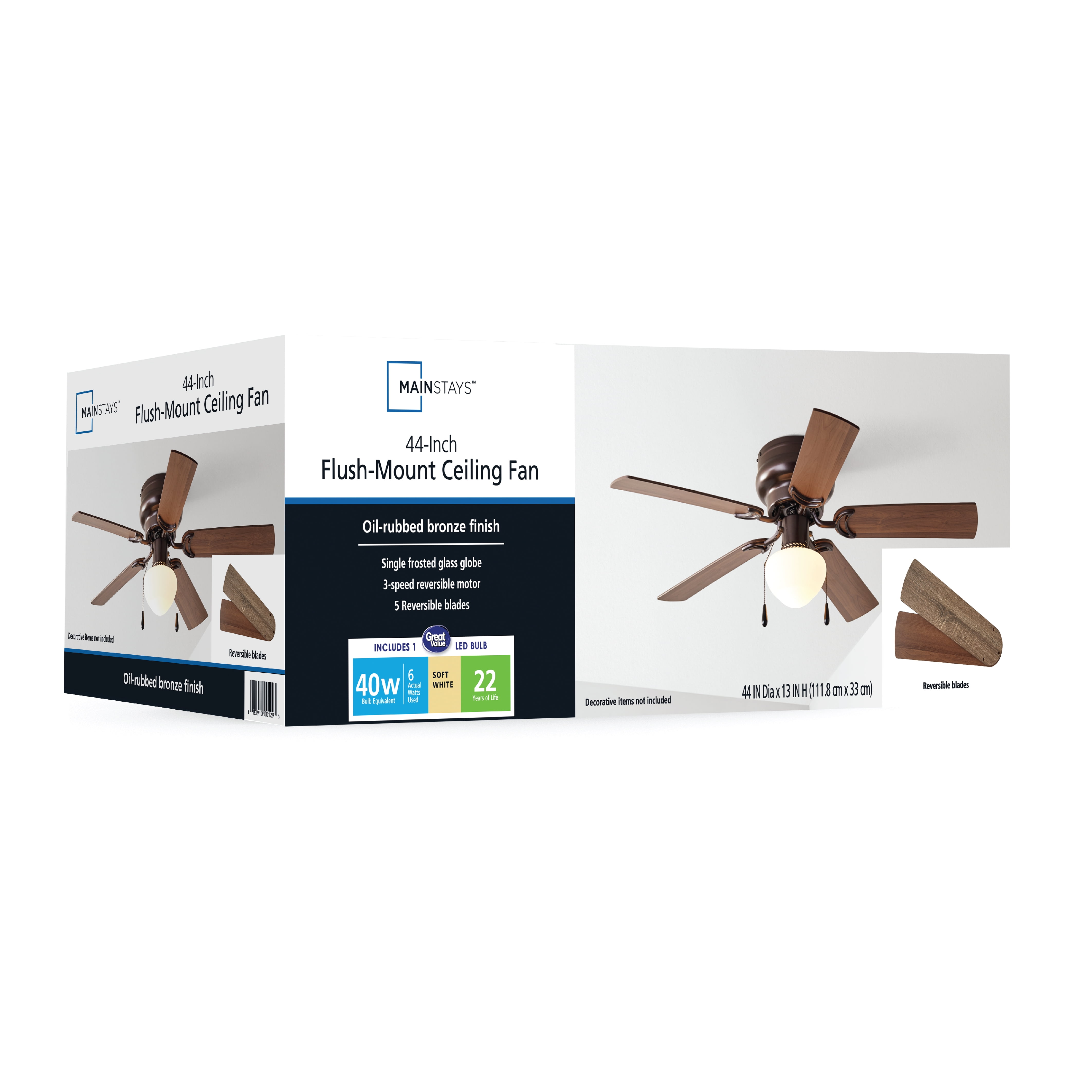 Update a room with this Mainstays 44-inch indoor ceiling Fan. Its ability to match nearly any existing setting due to its traditional style and bright finish make it the perfect addition to any room. This ceiling fan has multiple features that ensure function and versatility. Including 5 reversible blades and two pull switches for easy on, as well as off. Low ceilings are no problem as this ceiling fan can fit in these rooms as well. It is also easy to assemble and comes with a single light.