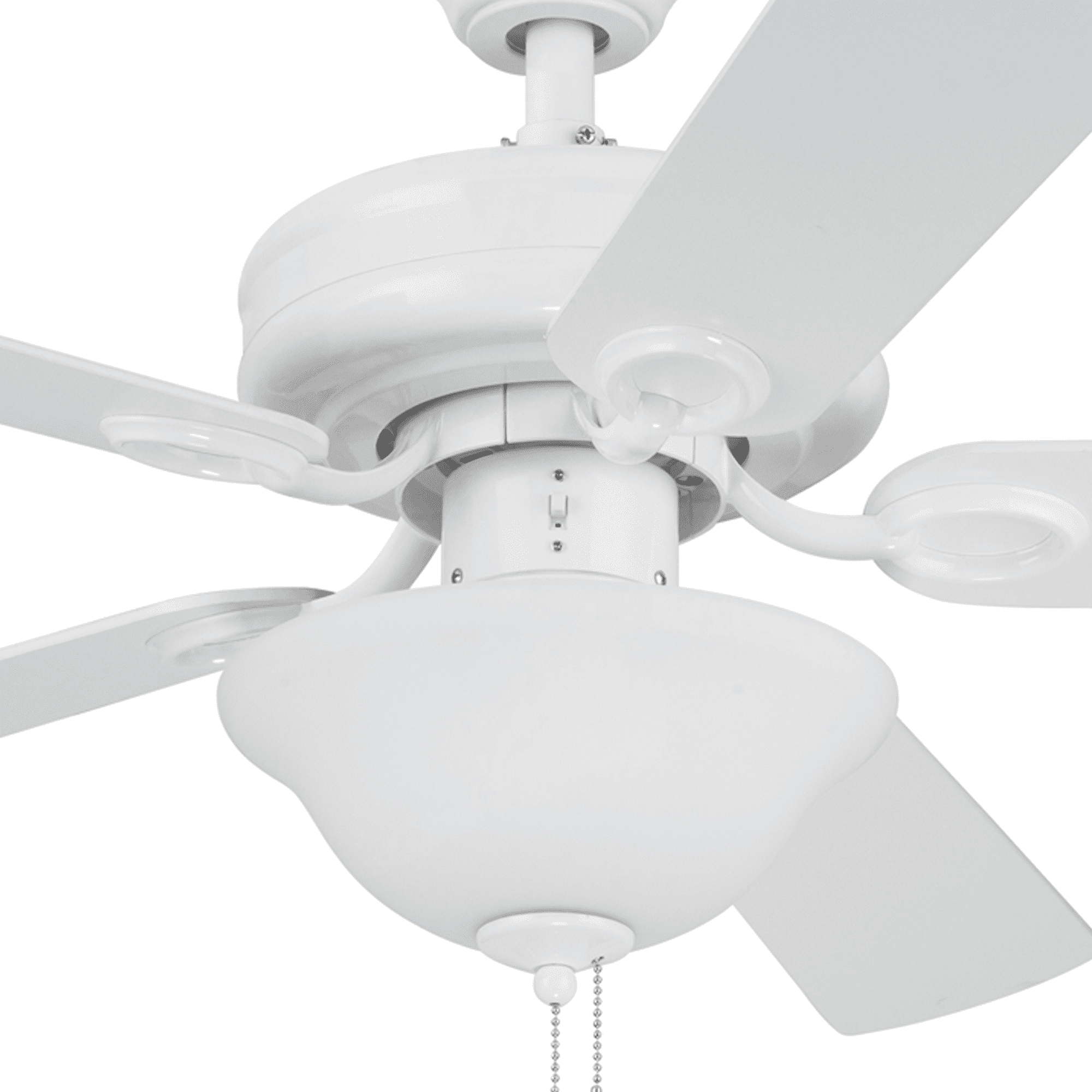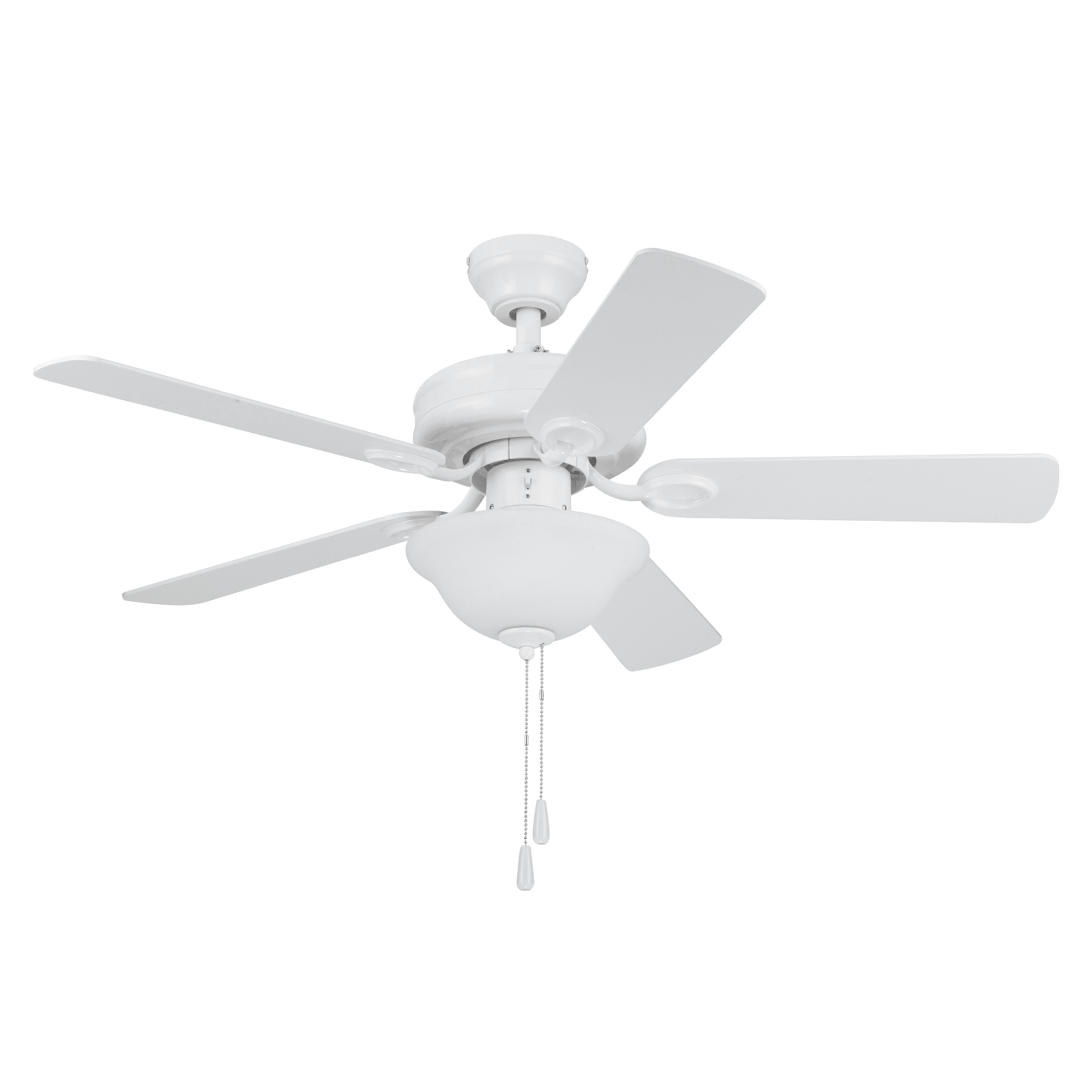 This classic style fan features stylish details and pairs well with most home décor. This white ceiling fan has a lightly frosted, open bowl shade to provide beautifully filtered lighting. The traditional 5-blade design provides comforting, adjustable airflow while the LED lights provide ideal lighting for the area. Easily control your ceiling fan’s 3 speeds and turn the light on and off with the traditional pull chains. Use the reversible airflow switch to easily allow you to change the direction of the fan to properly distribute air. During warmer months, this fan will provide a cooling effect or when reversed during the cooler months, it will help distribute warm air. This ceiling fan was created with high-quality materials that are durable and long-lasting and comes with a limited lifetime warranty from the manufacturer. Specifications: Sizing: 44-in 5-blade indoor fan for rooms up to 100 sq. ft. Lighting: 2 x E26/A19 light bulbs included that provide 800 lumens, 8 watts, 2700k color temperature