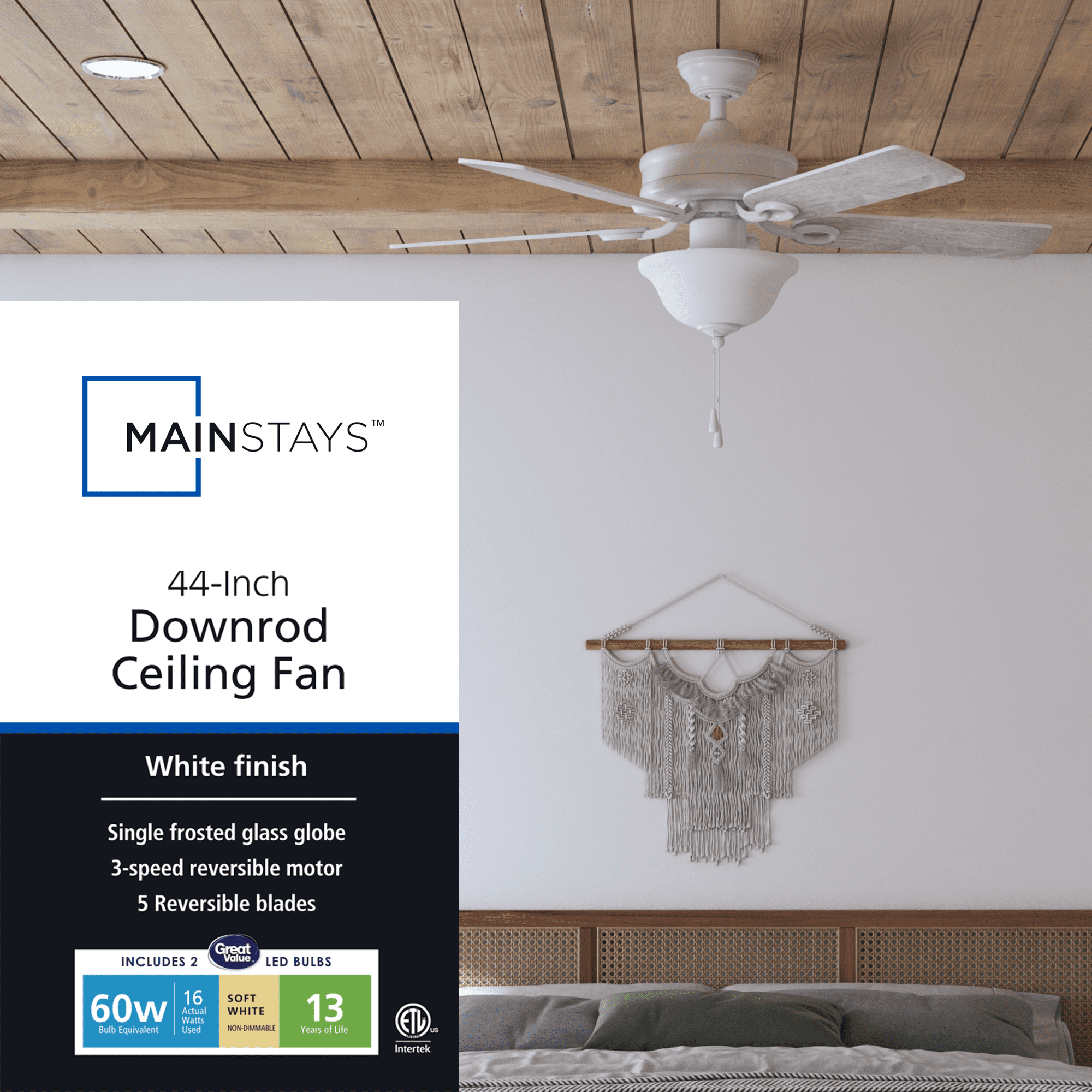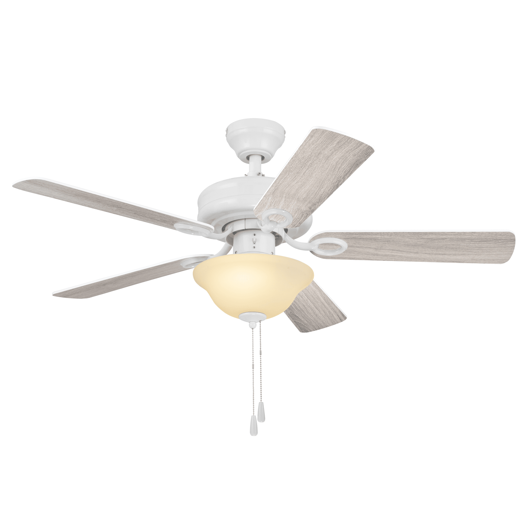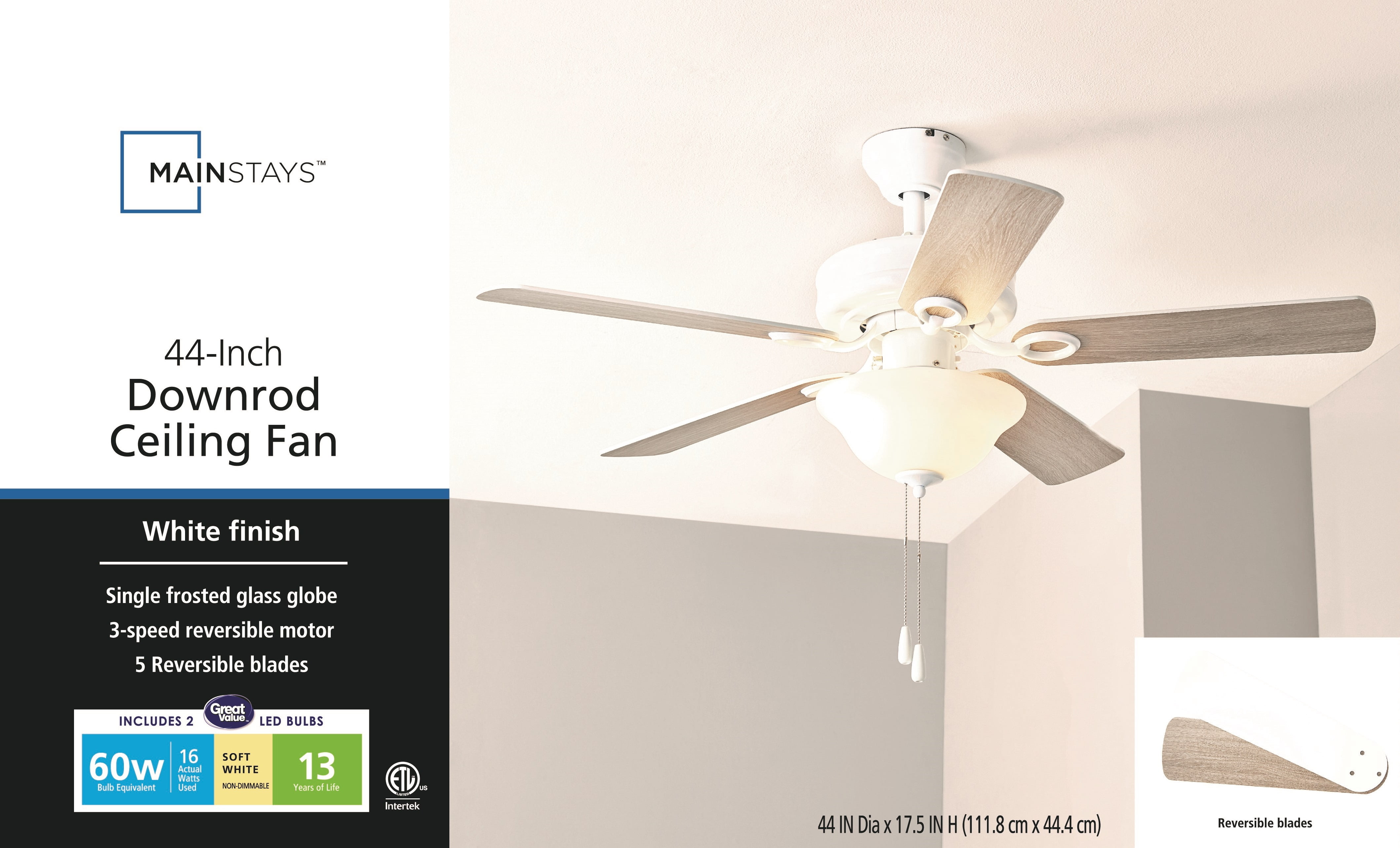 Keep Cool With The Correct Ceiling Fan Size: For ultimate performance, choose the best ceiling fan size for your room; This 44 inch indoor ceiling fan is ideal for smaller areas up to 100 sq. ft. such as bedrooms, kitchens, and other small spaces Tri-Mount Hanging Options: A multi-position fan with 3 hanging options; Standard option includes a 4 inch downrod; Flushmount option is for maximum head room; Angled mount option allows for hanging on vaulted ceilings with a longer downrod (sold separately) Crafted With High-Quality Material: The high-capacity motor delivers powerful airflow and quiet performance for years to come; This durable and modern ceiling fan is designed for long lasting comfort; ETL listed Reversible Fan For All Seasons: Improves air circulation in winter and summer; During summer, this ceiling fan optimizes airflow to enhance comfort; During winter, change the direction to evenly distribute warm air on low speed A Ceiling Fan For Indoor Rooms: This room fan is perfect for your living room, kitchen, bedrooms, or dens where increased airflow can make a room more comfortable Pull Chain Control: Control your Mainstays ceiling fan with the 2 pull chains; 1 chain operates the fan’s 3 speeds while the other turns the light kit on and off; Compatible with universal ceiling fan remotes (sold separately) Ceiling Fan With Light: Easily control your fan light with the convenient pull chain; LED bulbs (included) are energy-efficient and longer lasting; Includes a lightly frosted, open bowl shaped glass shade Dual-Finish Blades: This fan comes with a different finish on each side of the blades; Choose between Gray Oak and White; Pick the finish that best fits your space