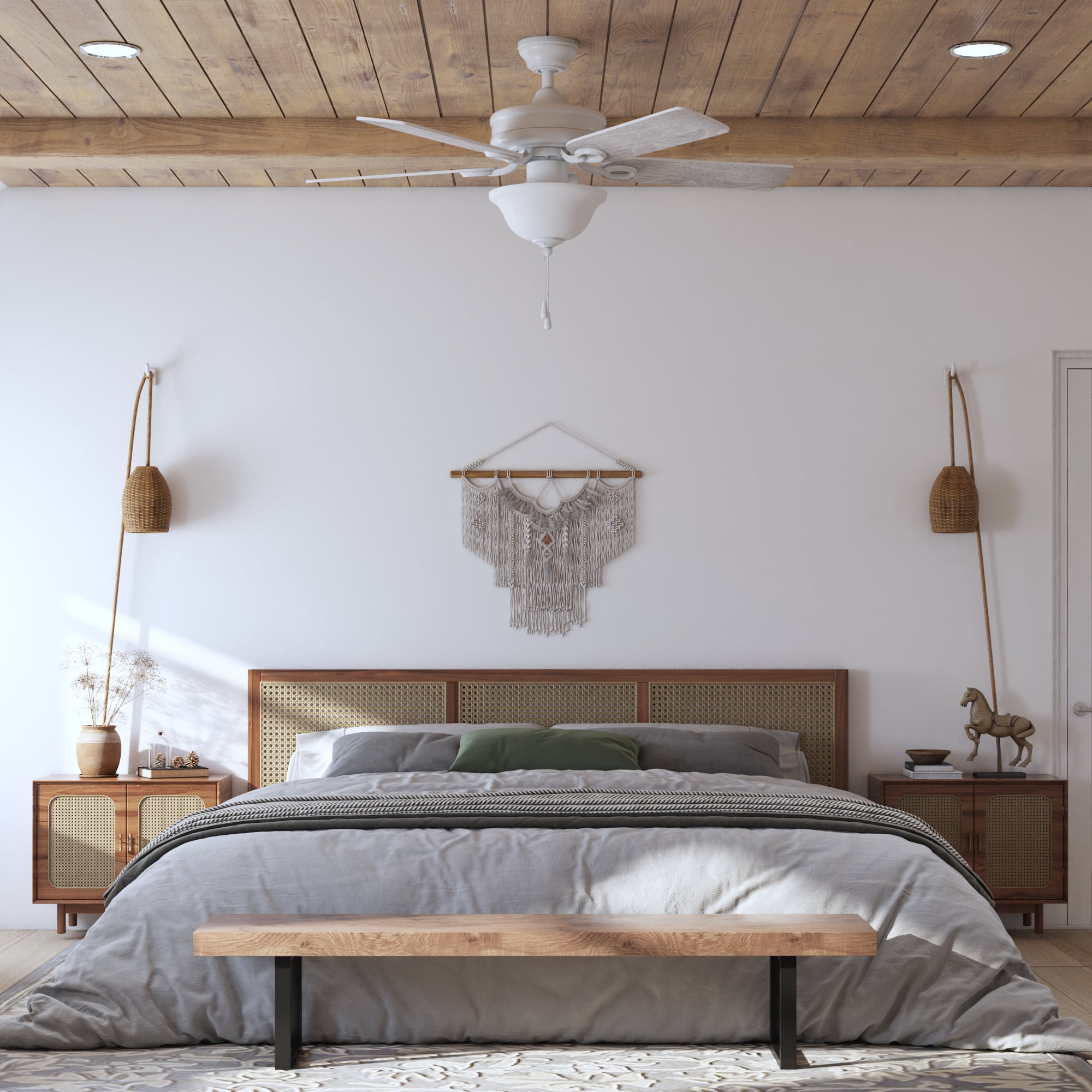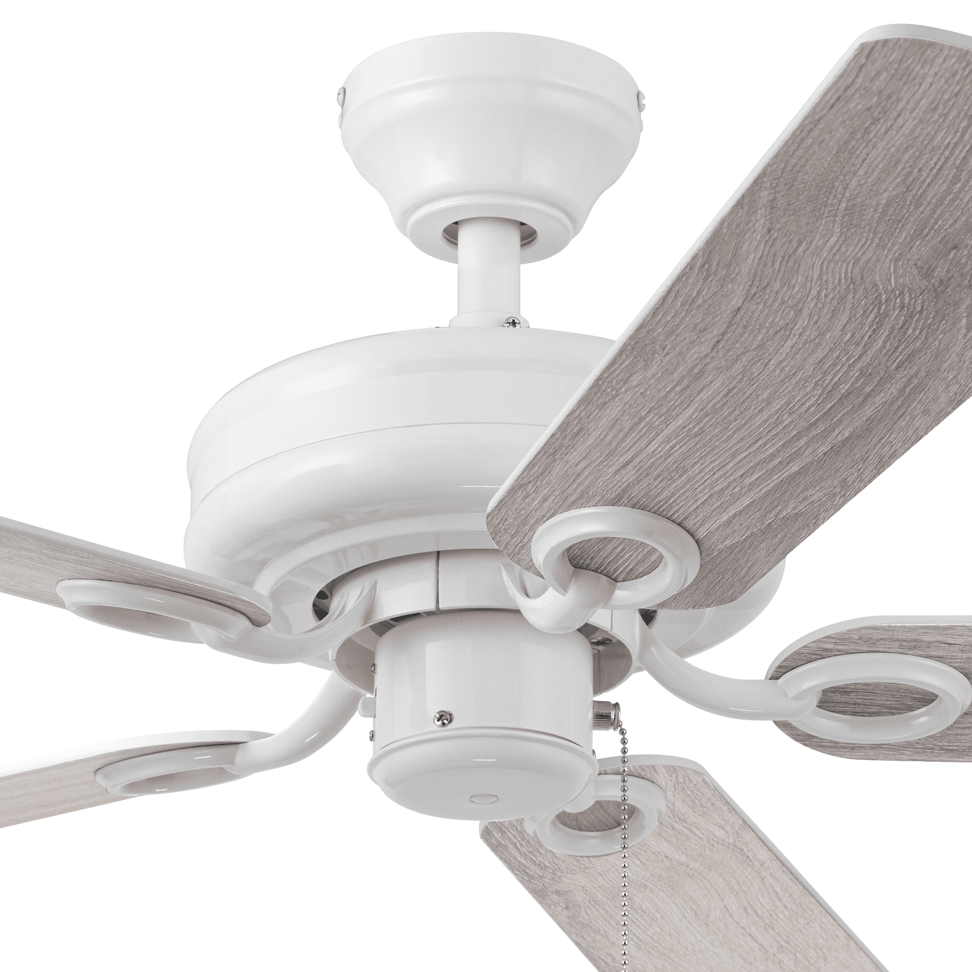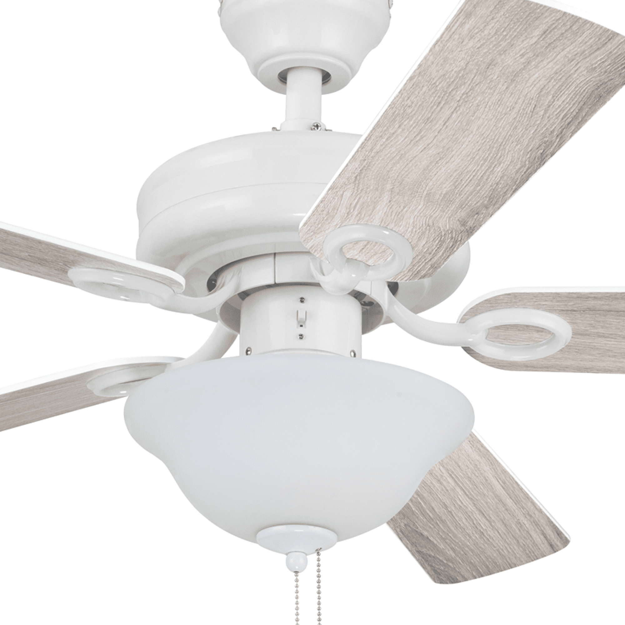 Keep Cool With The Correct Ceiling Fan Size: For ultimate performance, choose the best ceiling fan size for your room; This 44 inch indoor ceiling fan is ideal for smaller areas up to 100 sq. ft. such as bedrooms, kitchens, and other small spaces Tri-Mount Hanging Options: A multi-position fan with 3 hanging options; Standard option includes a 4 inch downrod; Flushmount option is for maximum head room; Angled mount option allows for hanging on vaulted ceilings with a longer downrod (sold separately) Crafted With High-Quality Material: The high-capacity motor delivers powerful airflow and quiet performance for years to come; This durable and modern ceiling fan is designed for long lasting comfort; ETL listed Reversible Fan For All Seasons: Improves air circulation in winter and summer; During summer, this ceiling fan optimizes airflow to enhance comfort; During winter, change the direction to evenly distribute warm air on low speed A Ceiling Fan For Indoor Rooms: This room fan is perfect for your living room, kitchen, bedrooms, or dens where increased airflow can make a room more comfortable Pull Chain Control: Control your Mainstays ceiling fan with the 2 pull chains; 1 chain operates the fan’s 3 speeds while the other turns the light kit on and off; Compatible with universal ceiling fan remotes (sold separately) Ceiling Fan With Light: Easily control your fan light with the convenient pull chain; LED bulbs (included) are energy-efficient and longer lasting; Includes a lightly frosted, open bowl shaped glass shade Dual-Finish Blades: This fan comes with a different finish on each side of the blades; Choose between Gray Oak and White; Pick the finish that best fits your space