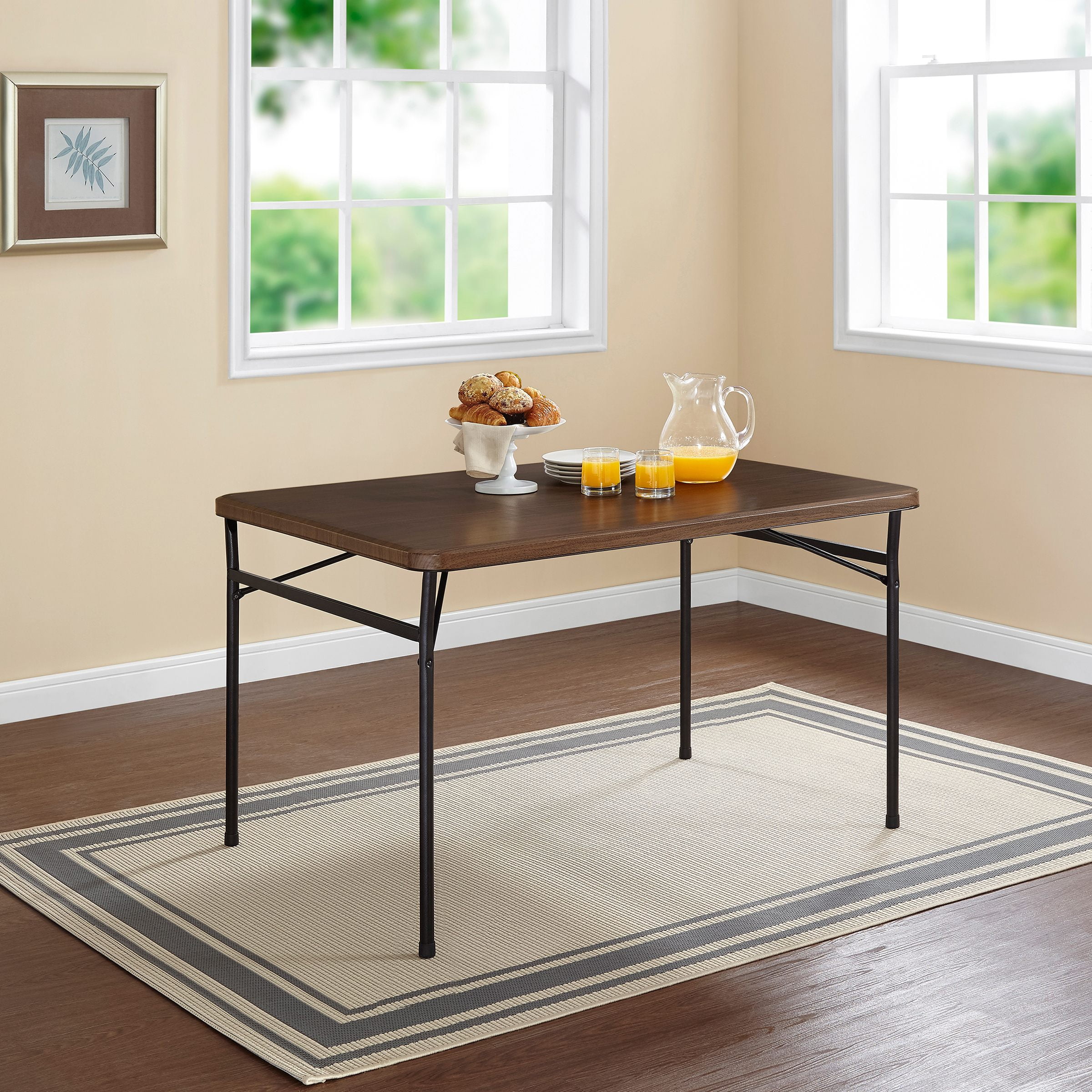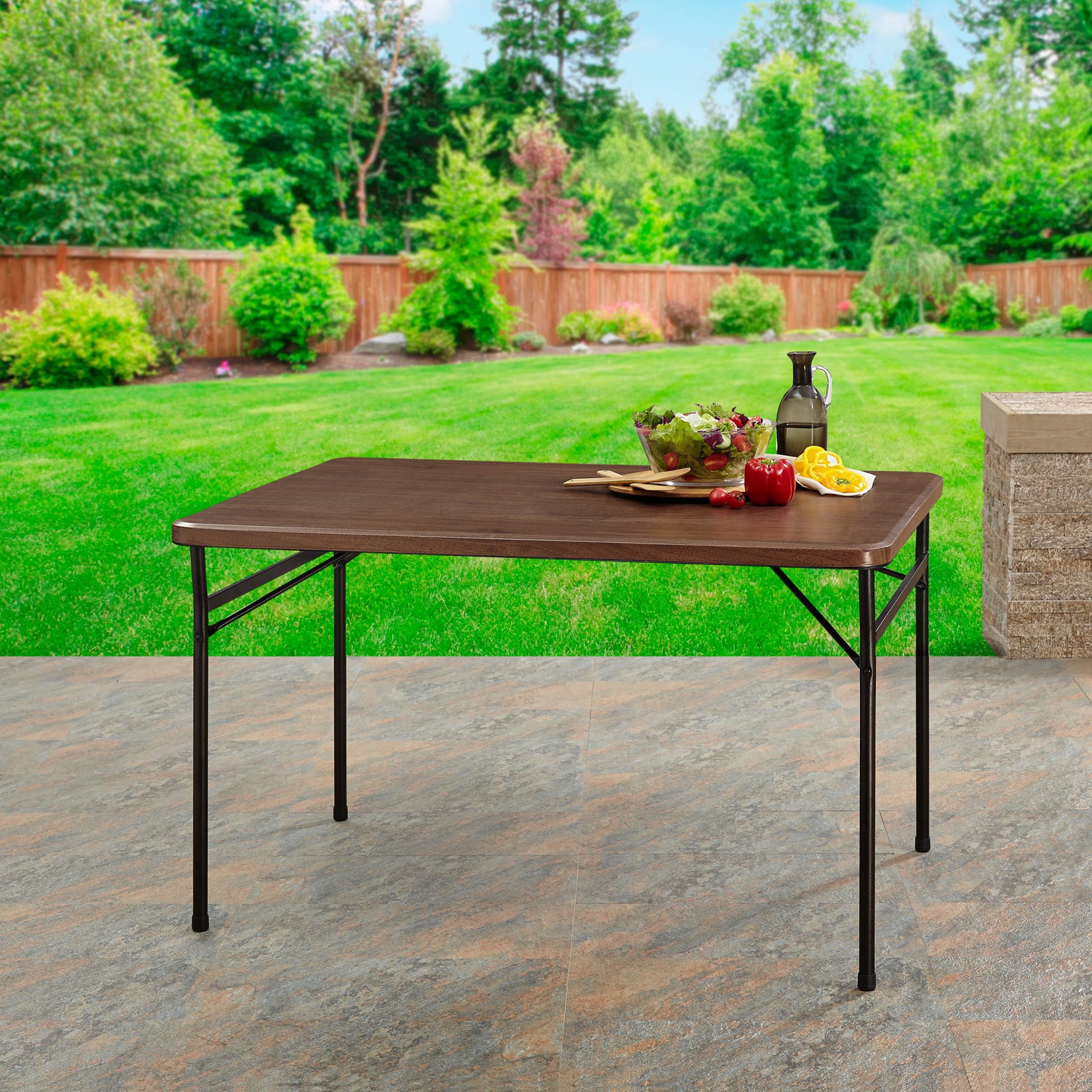 Product Dimension:48″ W x 34″ D x 29″ H Comfortably seats 6 adults Ultra-convenient table folds away to near-flat for easy storage and transport to anywhere you need some extra table space Rich walnut finish coordinates with almost any decor Reinforced metal frame and metal legs for added durability Rubber stoppers on the legs for added grip on floor surfaces Appropriate for use indoors or outdoors Easy-to-clean surface Number Of Pieces: 1 x folding table