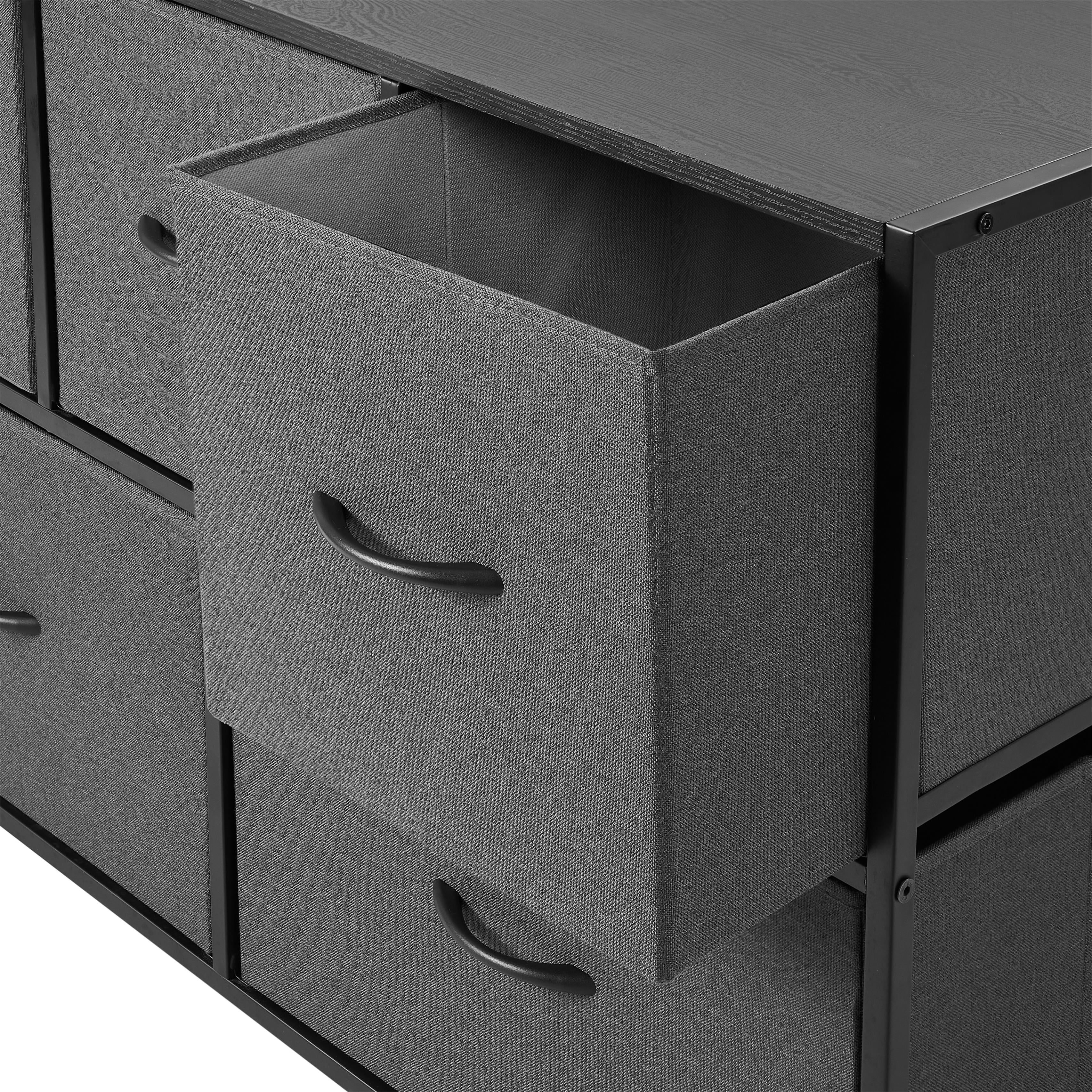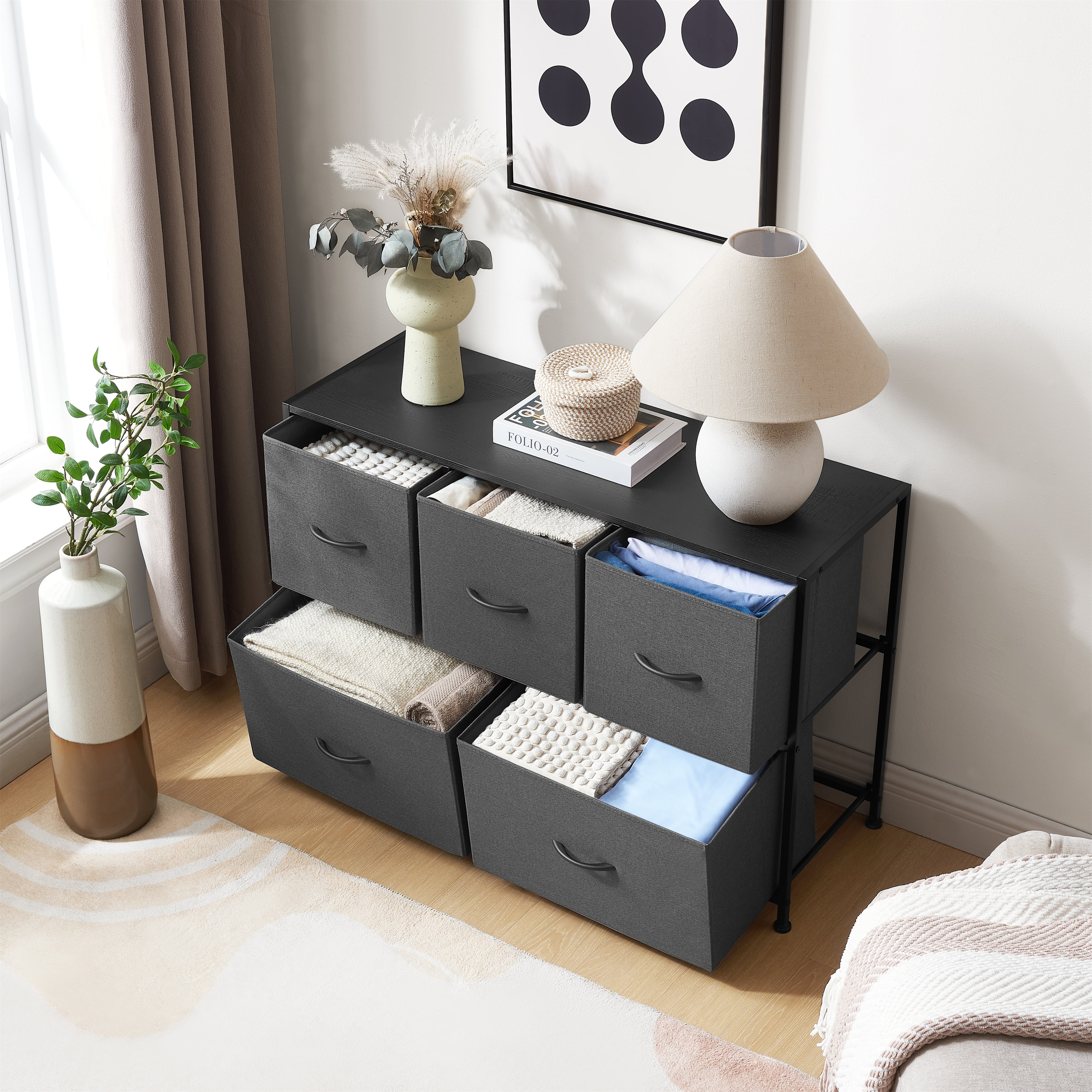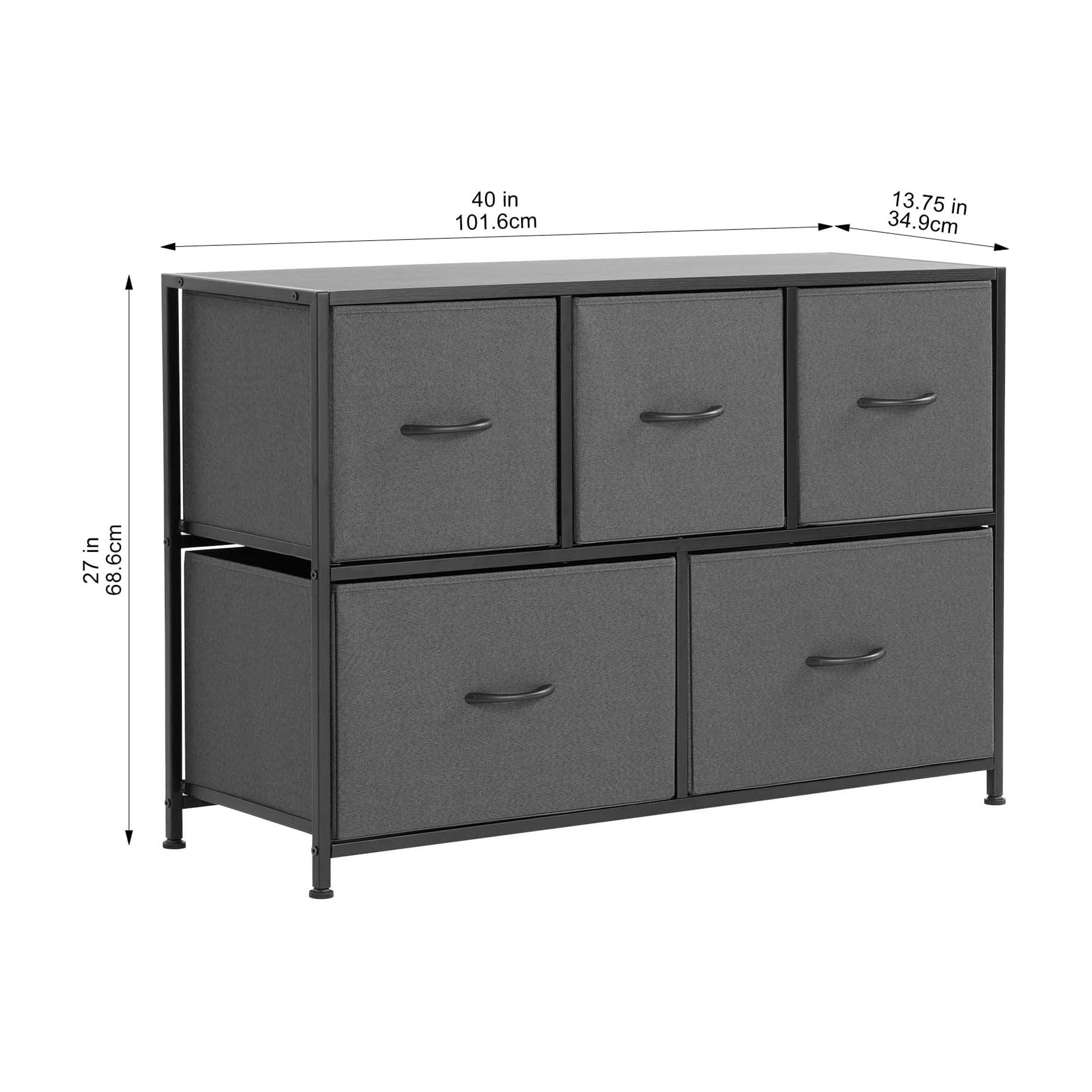 Brand: Mainstays Dresser Type: Horizontal Dresser Color: Grey Frame Material: Steel Top Material: PB Overall Size: 40″W x 13.75″D x 27″H Number of Drawers: 5 Assembly Required: Yes Recommended Rooms: Bedroom; Living Room; Office; Entryway High-capacity Storage Dresser:The 5 Drawer Horizontal Fabric Dresser offers ample space to classify and store your daily essentials, ensuring a tidy and well-organized room. The engineered wood top surface can also be utilized as a catch-all table for books, cups, or decorative items. Versatile Functional Dresser: This small dresser for closet is a practical and versatile storage organizer that maximizes storage space in your home. It seamlessly fits into various settings including the bedroom, living room, or office. Whether used as a tall side table, nightstand, or cabinet drawer, it will be undoubtedly stand out wherever it is placed. Sturdy & Durable Dresser: Constructed with a high-quality steel frame and premium non-woven fabric, this storage dresser ensures a long lifespan. The thick engineered wood board provides excellent support for your daily necessities, while the metal foot guarantees stability. Convenient Designed Dresser:The 5 drawers can be easily removed and folded for effortless organization and retrieval of items. The handles make opening and closing the drawers a breeze. Additionally, the small dressers for bedroom are equipped with 4 adjustable plastic feet to protect your floors from scratches, making it adaptable to uneven surfaces and carpets. The tough non-woven fabric drawers are breathable and harmless, suitable for individuals of all ages. Easy Assembly Dresser:The package includes all necessary tools and accessories, along with detailed instructions, making assembly a quick and hassle-free process. Should you experience any issues with the quality of it, our customer support team is readily available to assist you. Customer ServiceNumber: 1-855-597-1828