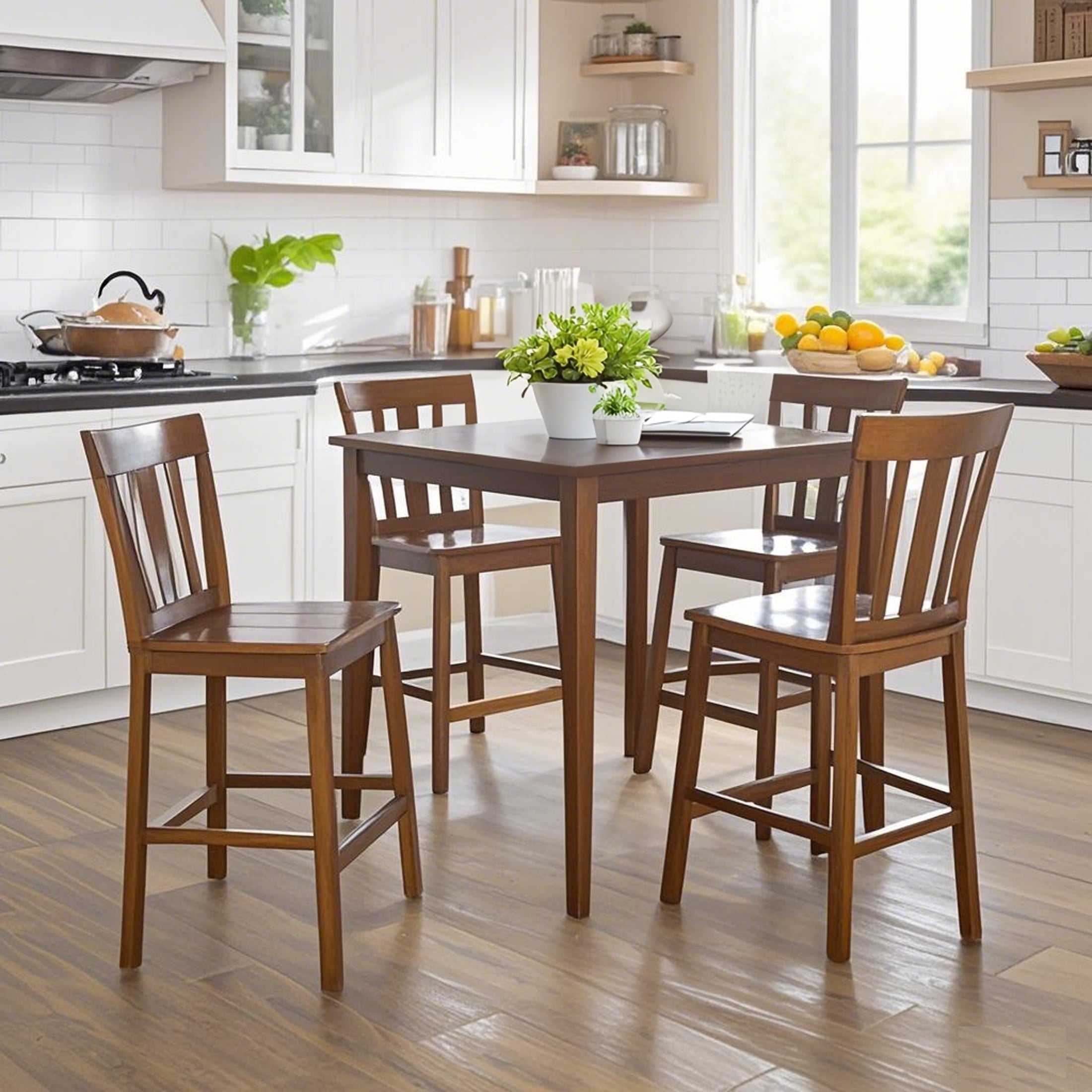 Beautifully elevate your kitchen or dining room space with the contemporary design and stylish finish of the 5-piece Mainstays Cherry Counter Height Dining Set. Featuring a sturdy square table and seating for 4, this everyday counter height table measures 35.75″ Height, boasting a modern counter-height ideal for your contemporary home. Comfortably seat your whole family on substantial chairs measuring Seat Height 23.8″, the perfect bistro height to add unique design to your space. Feel confident in the table’s 100% rubber wood construction and chair fabrication of a rubber wood frame and durable plywood backrest. Easy to assemble in the comfort of your home, the Set is ideal for smaller spaces that cannot accommodate a low, large dining room set and is perfect for a cozy nook or corner of your kitchen. Suitable for any room where you and your family gather to enjoy mealtime. More great products could be found here below: Mainstays 5-Piece Mission Counter-Height Dining Set Mainstays 5 Piece Faux Marble Dining Set Mainstays 5-Piece Round Mid-Century Modern Dining Set Mainstays Round Mid-Century Modern Dining Table Mainstays Mid-Century Modern Dining Chairs, Set of 4 Mainstays 3-Piece Bistro Dining Set