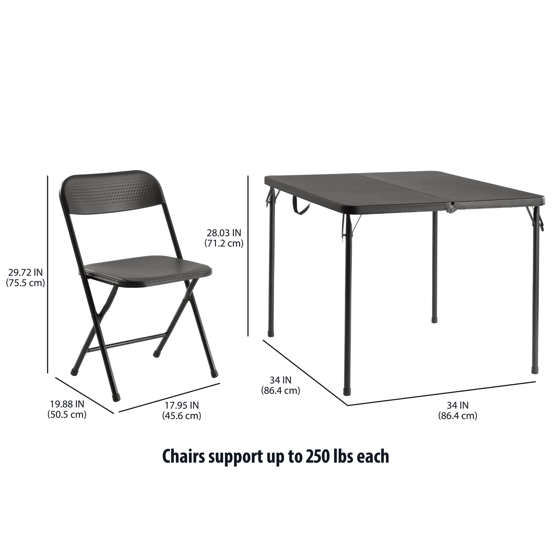 Table Dimensions: 34″ W x 34″ L x 28.03″ H; Chair Dimensions: 17.95″ W x 19.88″ D x 29.72″ H. Content: 1 table and 4 chairs Multi-Functional Foldable and Portable Comfortably seats 4 adults Rubber stoppers on the legs for added grip on floor surfaces Appropriate for use indoors or outdoors Strong durable powder-coated metal construction Easy-to-clean resin surface