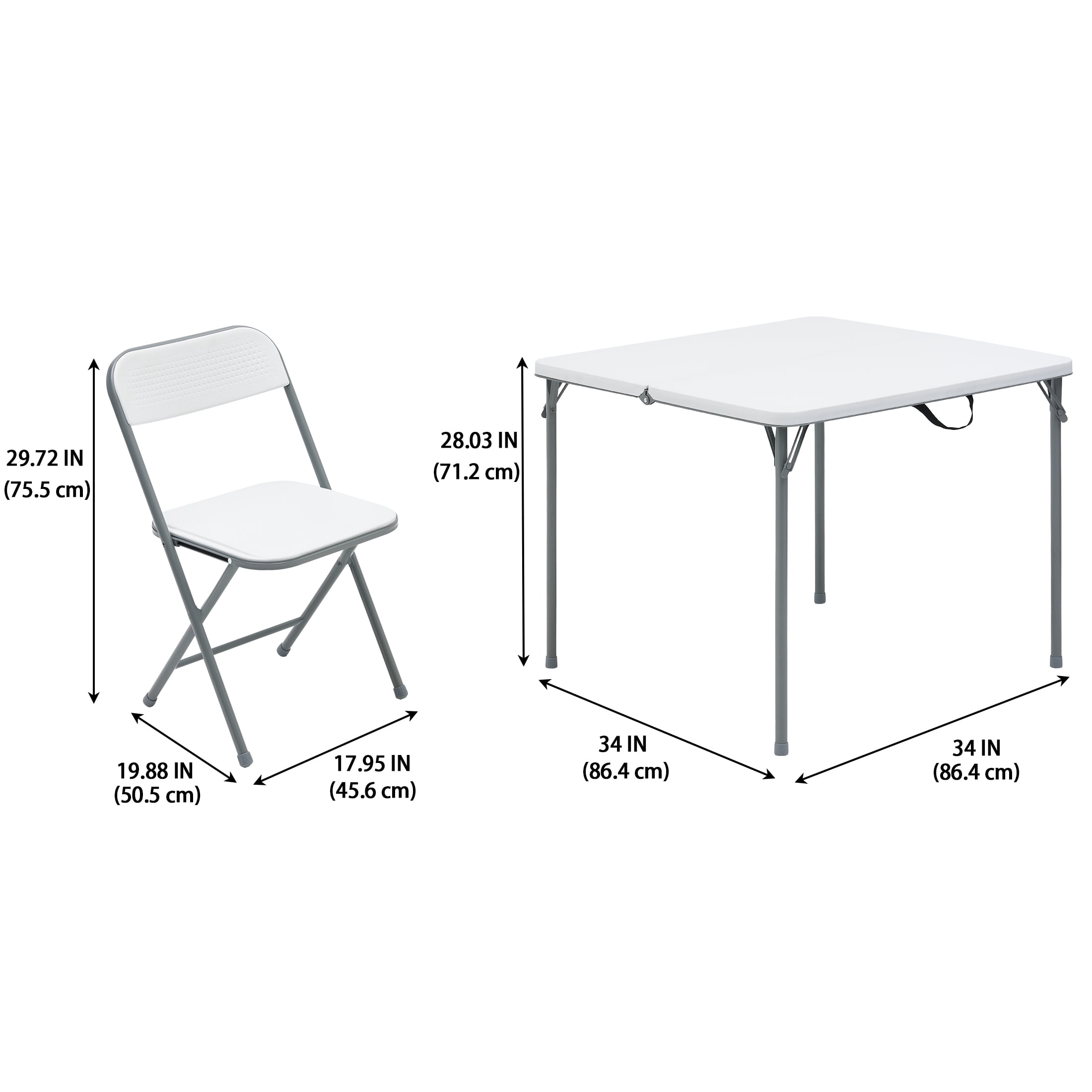 Table Dimensions: 34″ W x 34″ L x 28.03″ H; Chair Dimensions: 17.95″ W x 19.88″ D x 29.72″ H. Content: 1 table and 4 chairs Multi-Functional Foldable and Portable Comfortably seats 4 adults Rubber stoppers on the legs for added grip on floor surfaces Appropriate for use indoors or outdoors Strong durable powder-coated metal construction Easy-to-clean resin surface