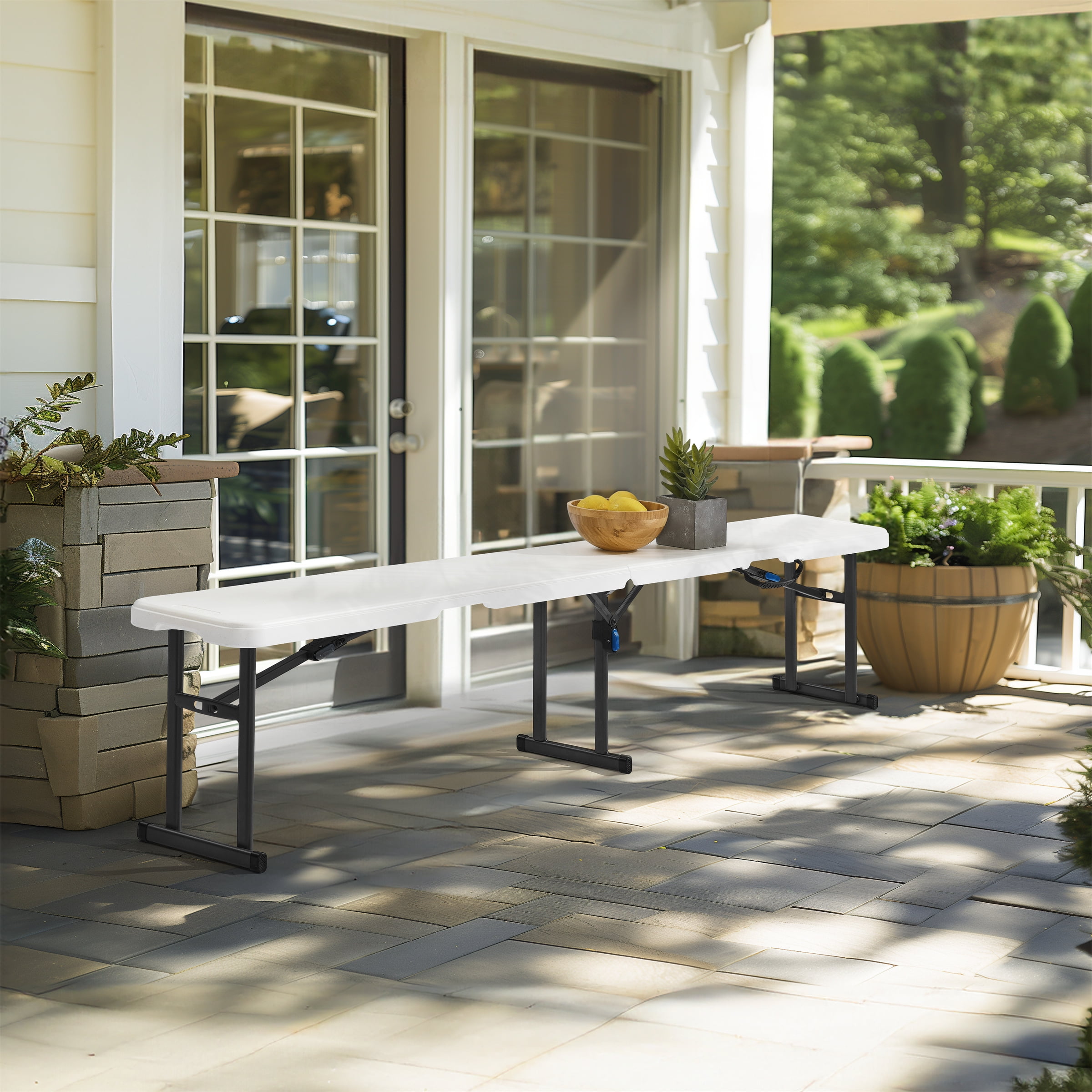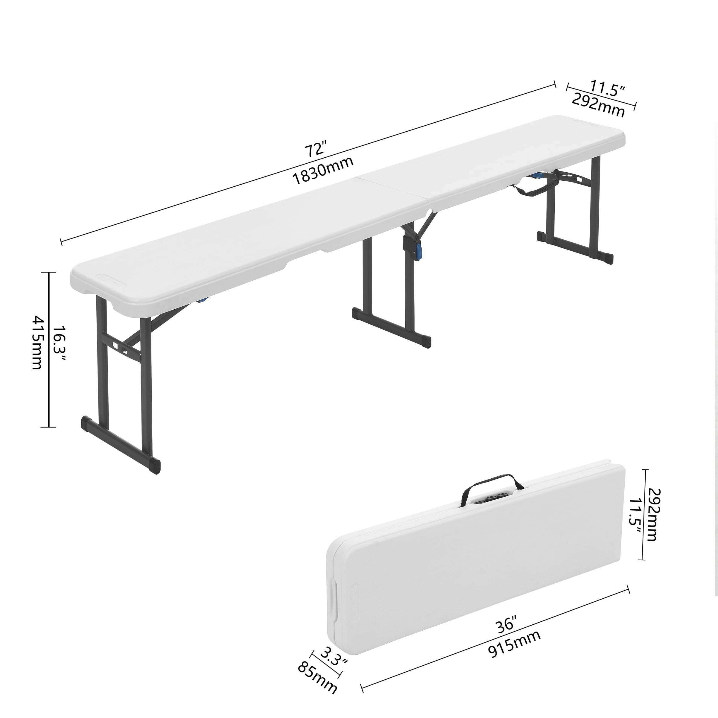 Lightweight design and convenient carry handle Half-folded for easy transport and storage Ergonomic pinch free buttons Features a button locking system that keeps legs open 600 lbs. distributed weight capacity UV-protected High-Density Polyethylene (HDPE) top Steel Frame with a power-coated steel finish Stain resistant and easy to clean Durable caps to prevent floor damage Indoor and Outdoor use Overall Dimensions: 72″(L) x 11.5″(W) x 16.5″(H) Bench Top: 1.65″ Thick Folded Dimensions: 36″ (L) x 11.5″ (W) x 3.9″(H) Seating Capacity: 3 adults Weight: 13.2 lbs. Color: Bright White Granite Material: HDPE Plastic, Steel No assembly required.