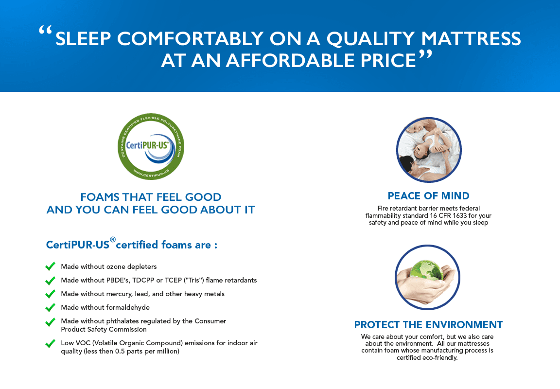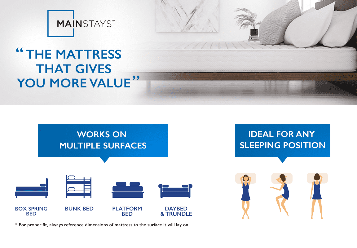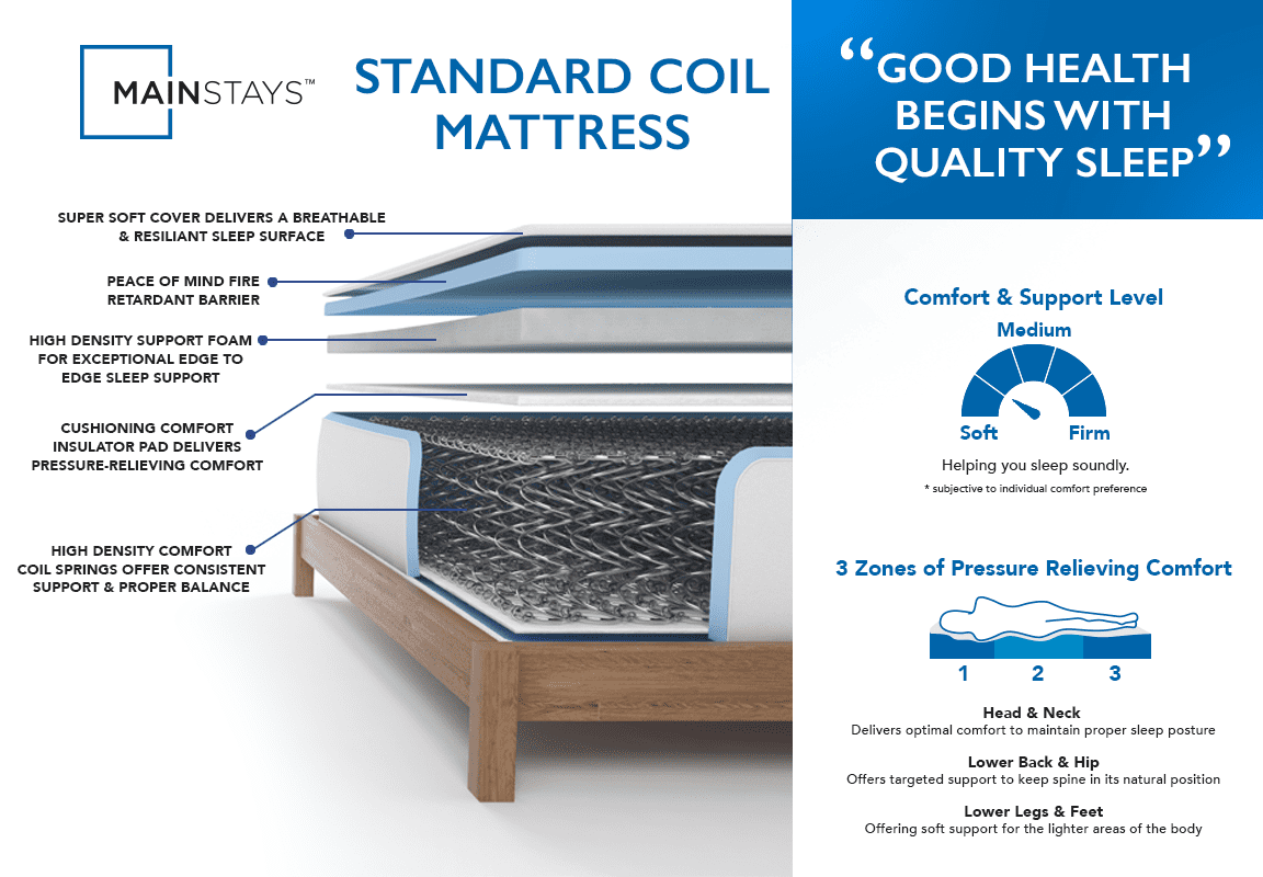 The Mainstays 6″ Coil Mattress offers comfort and convenience with its ergonomic design. It has a bright white color that stands out and looks crisp and clean. It features 13.5-gauge tempered steel coils that provide maximum support for a sound sleep that can be relied upon. It meets federal flammability standard CFR 1633, providing quality and safety. The Mainstays mattress is made with a certified eco-friendly foam manufacturing process that prevents volatile organic compounds from being released into the atmosphere during the production process. This twin-size mattress is compressed, vacuum-sealed and boxed for easy shipping. Made to last for many years, let the Mainstays 6″ Coil Mattress add comfort to your bedroom.