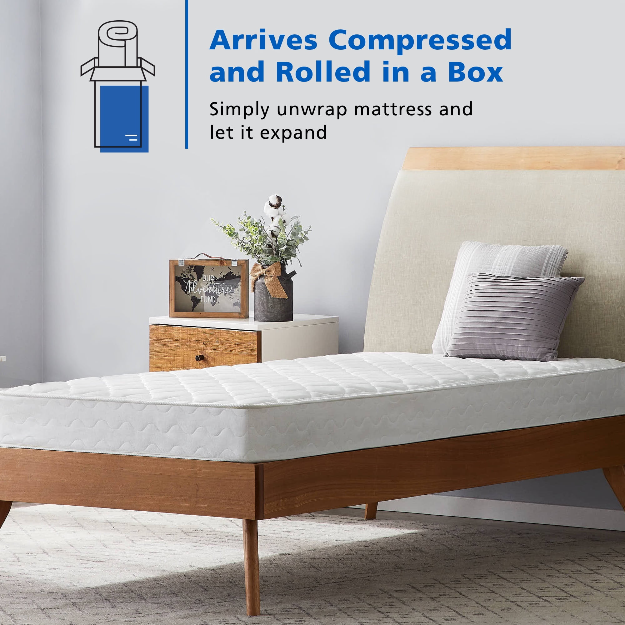 PERFECT FIT: The six-inch profile of this spring mattress is perfect for bunk beds, trundle beds, and dorm rooms FIRM SUPPORT: This firm mattress offers full-body support for any sleeper CHOOSE YOUR SIZE: Available in Twin, Twin XL, and Full configurations SHIP AND SLEEP: Ships compressed in a box right to your doorstep. Allow 48 hours for this mattress to fully expand before using CHOOSE YOUR FRAME: Compatible with platform frames or a traditional box spring PROTECTED PRODUCT: This product is backed by a one-year manufacturer’s warranty SEND IT BACK: Unopened mattresses in original packaging can be returned to a store or by mail. For unboxed, expanded mattresses, or out of the original packaging, contact Customer Support. ASSEMBLED PRODUCT DIMENSIONS: 74” L x 37.5” W x 6” H; weighs 20 pounds PACKAGE DIMENSIONS: 11″ L x 11″ W x 41″ H; weighs 20 pounds ASSEMBLY: No assembly required. MATERIALS: Polyester, rayon, polyurethane foam, polypropylene, olefin, steel coils PRODUCT COLOR: White PRODUCT SIZE: Twin Age Group: All Ages, Universal.