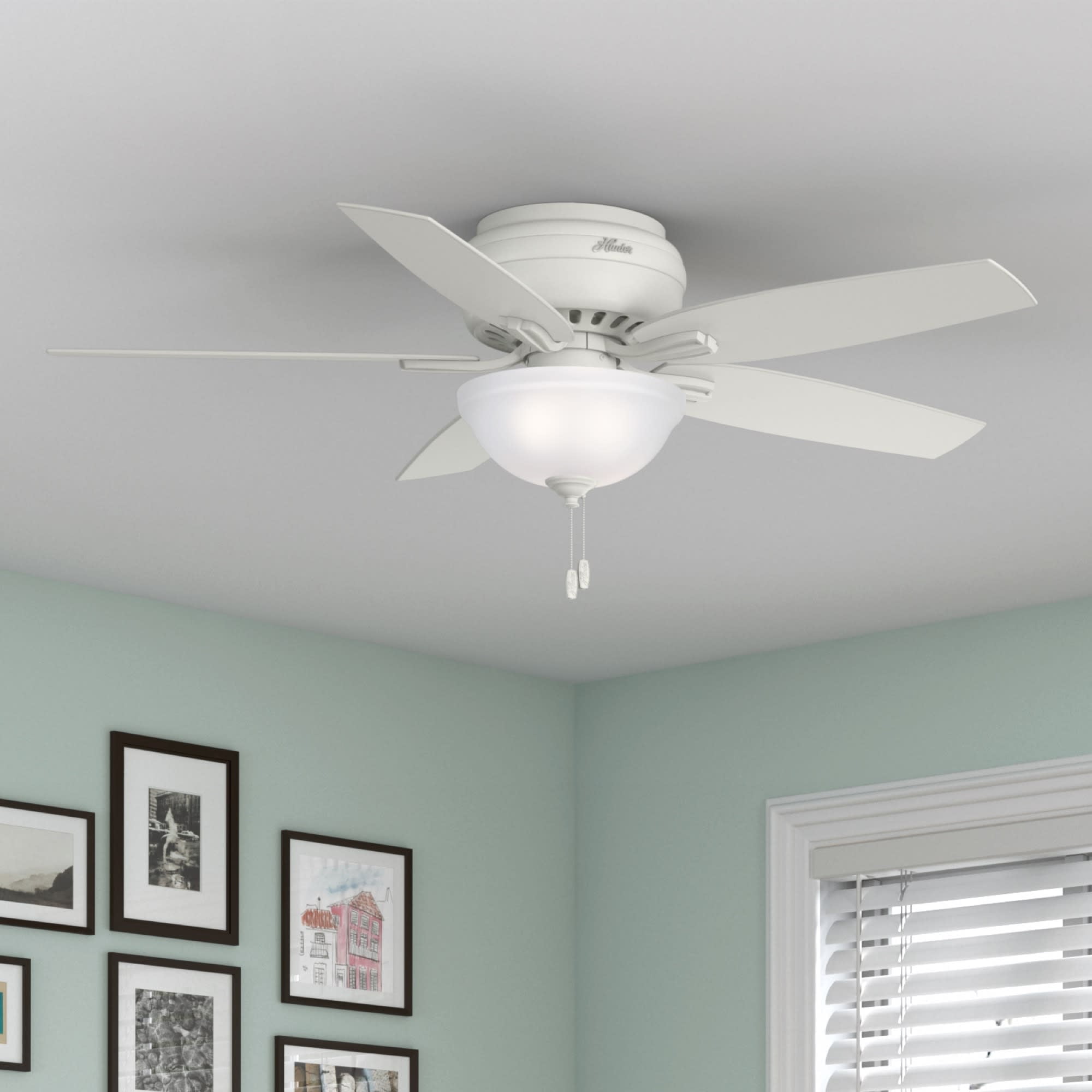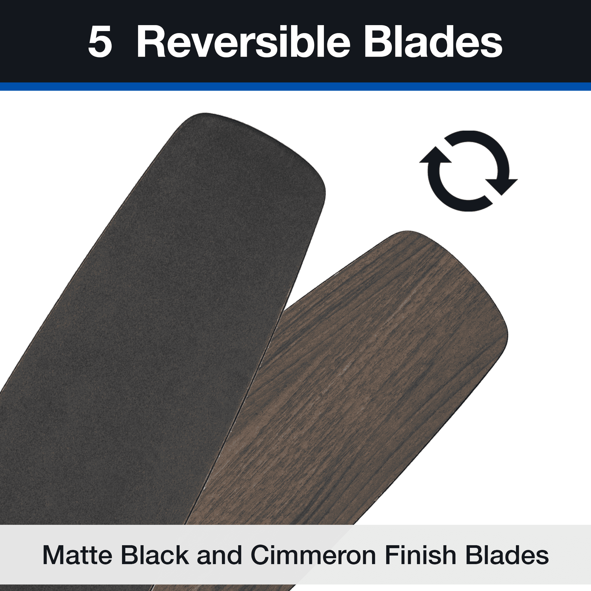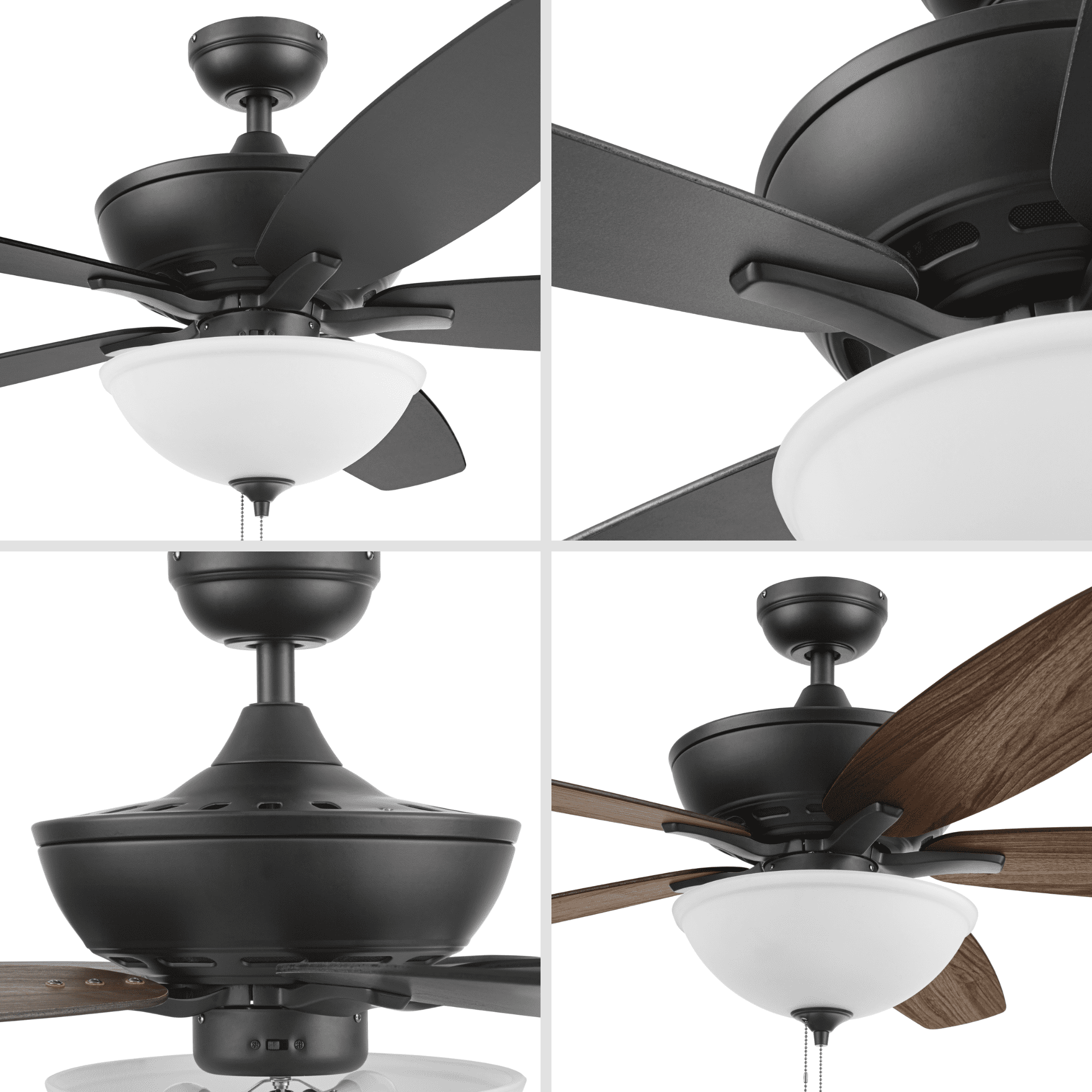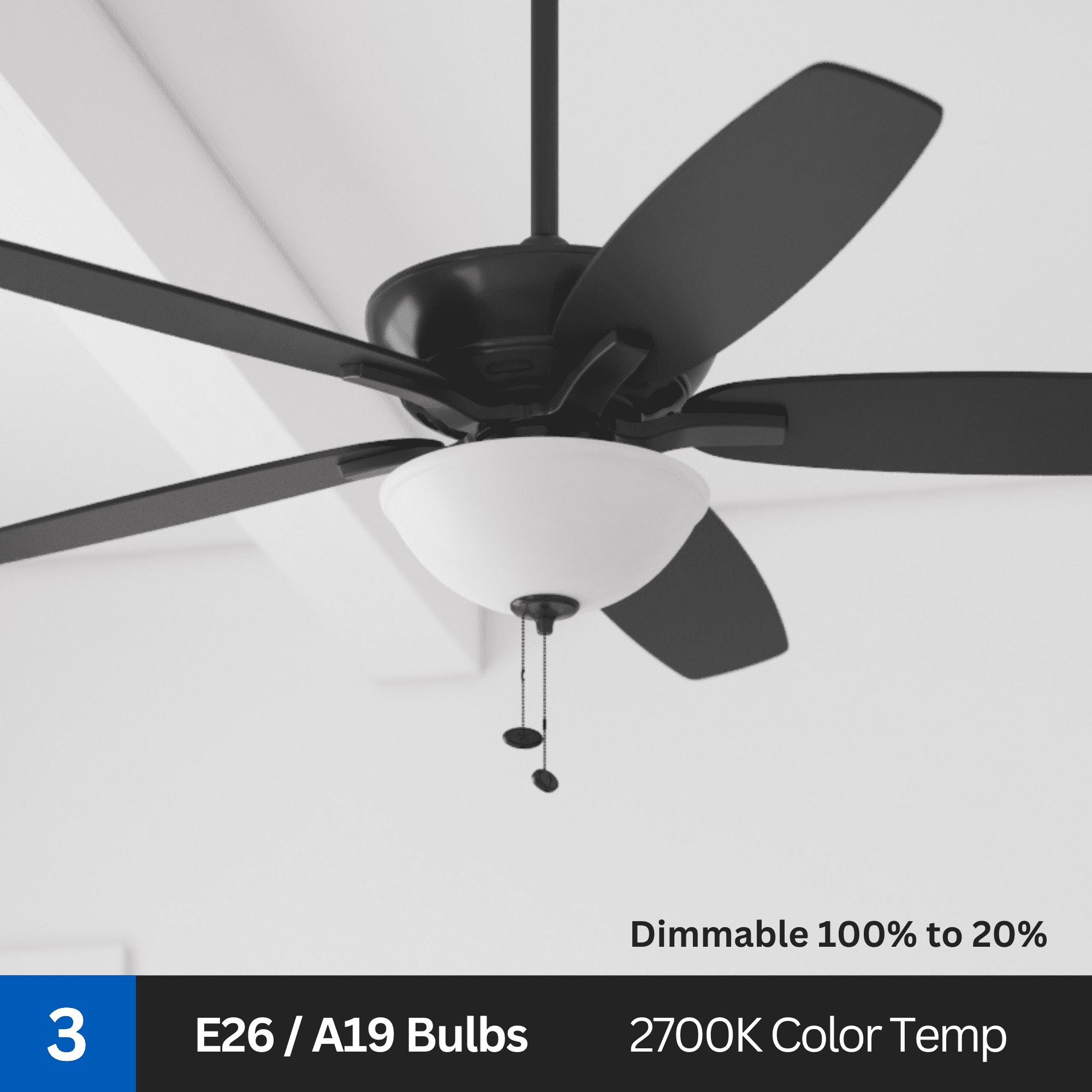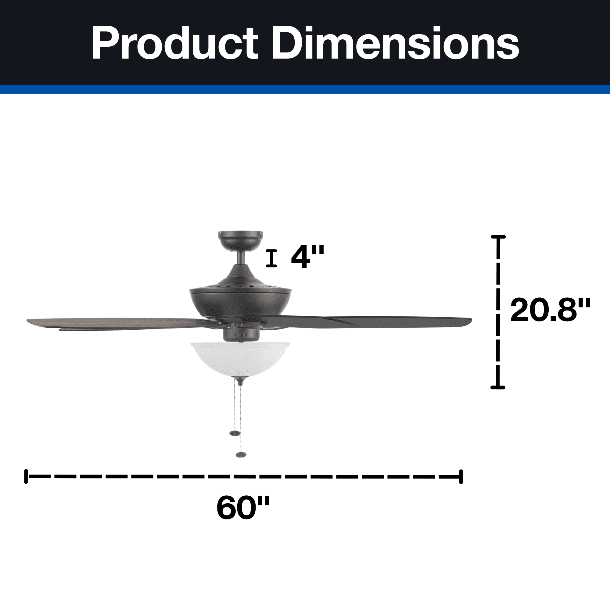 Mainstays 60″ Black Ceiling Fan with Light, 5 Blades, Reverse Airflow, Pull Chain Control Keep cool with the correct ceiling fan size: Ideal for larger areas over 400 sq. ft. such as porches, patios, and garages Classic blades: This traditional 5-blade fan provides ultimate airflow, delivering maximum circulation at high speed Tri-mount hanging options: Features 3 hanging options; standard with a 4-inch downrod, flushmount for maximum headroom, and angled mount for vaulted ceilings (longer downrod sold separately) Crafted with high-quality material: High-capacity motor delivers powerful airflow and quiet performance for years; ETL listed for safety Reversible fan for all seasons: Optimizes airflow in summer and evenly distributes warm air in winter on low speed A ceiling fan for indoor rooms: Perfect for living rooms, kitchens, bedrooms, or dens where increased airflow enhances comfort Pull chain control: Operate the fan’s 3 speeds and light kit with 2 pull chains; compatible with universal ceiling fan remotes (sold separately) Ceiling fan with light: Includes energy-efficient LED bulbs (included) and a lightly frosted glass bowl for beautifully filtered lighting Dual-finish blades: Choose between Cimmeron and Matte Black finishes to best fit your space