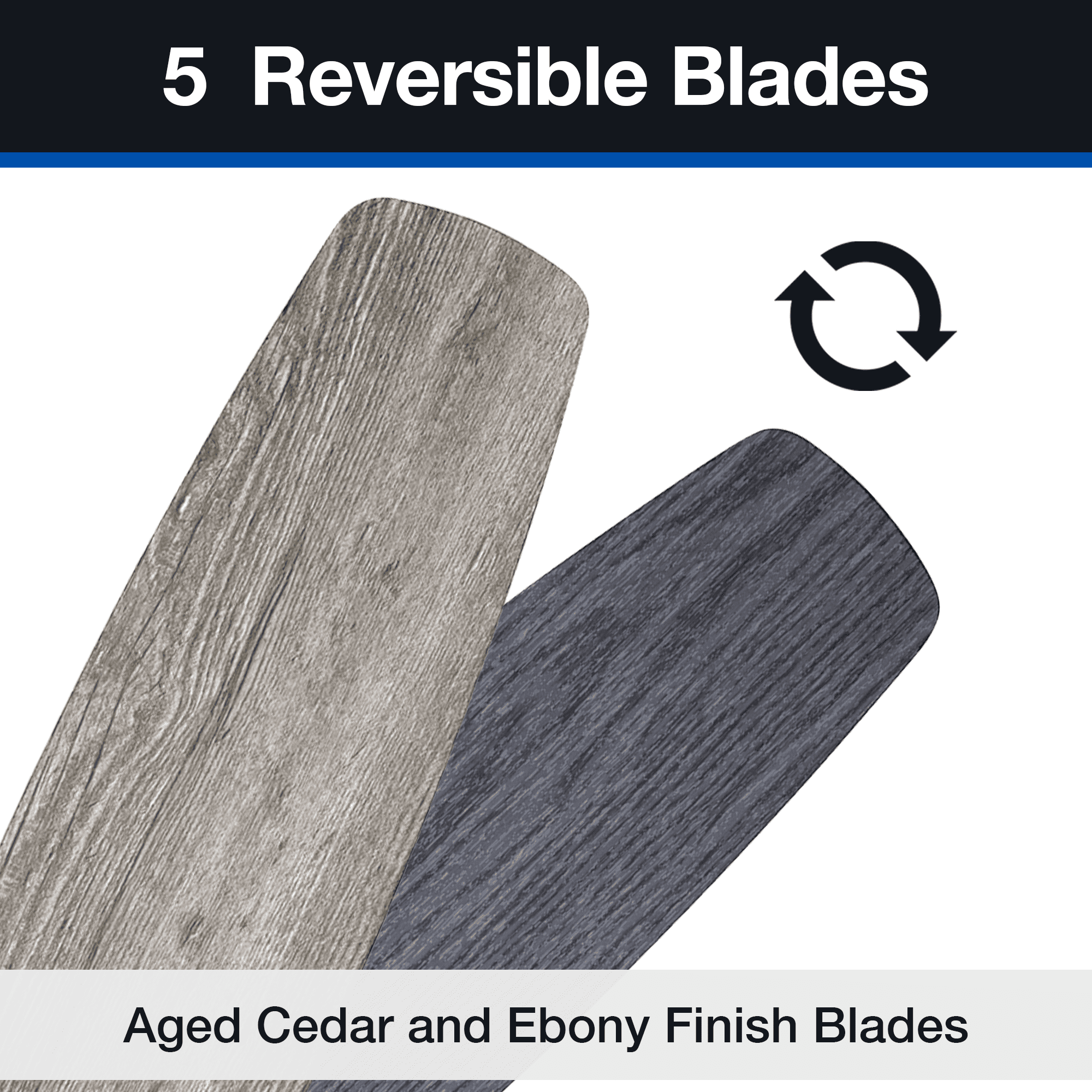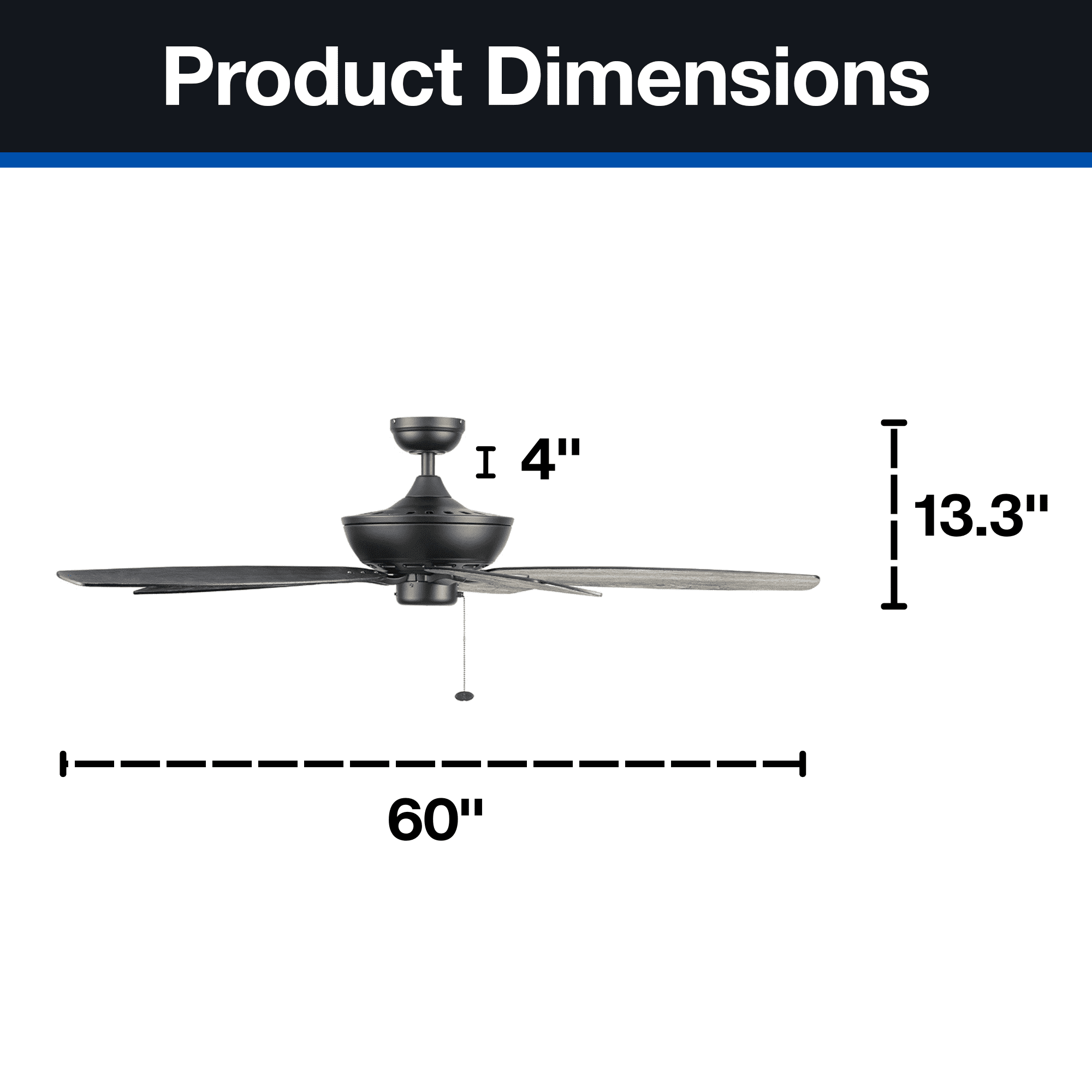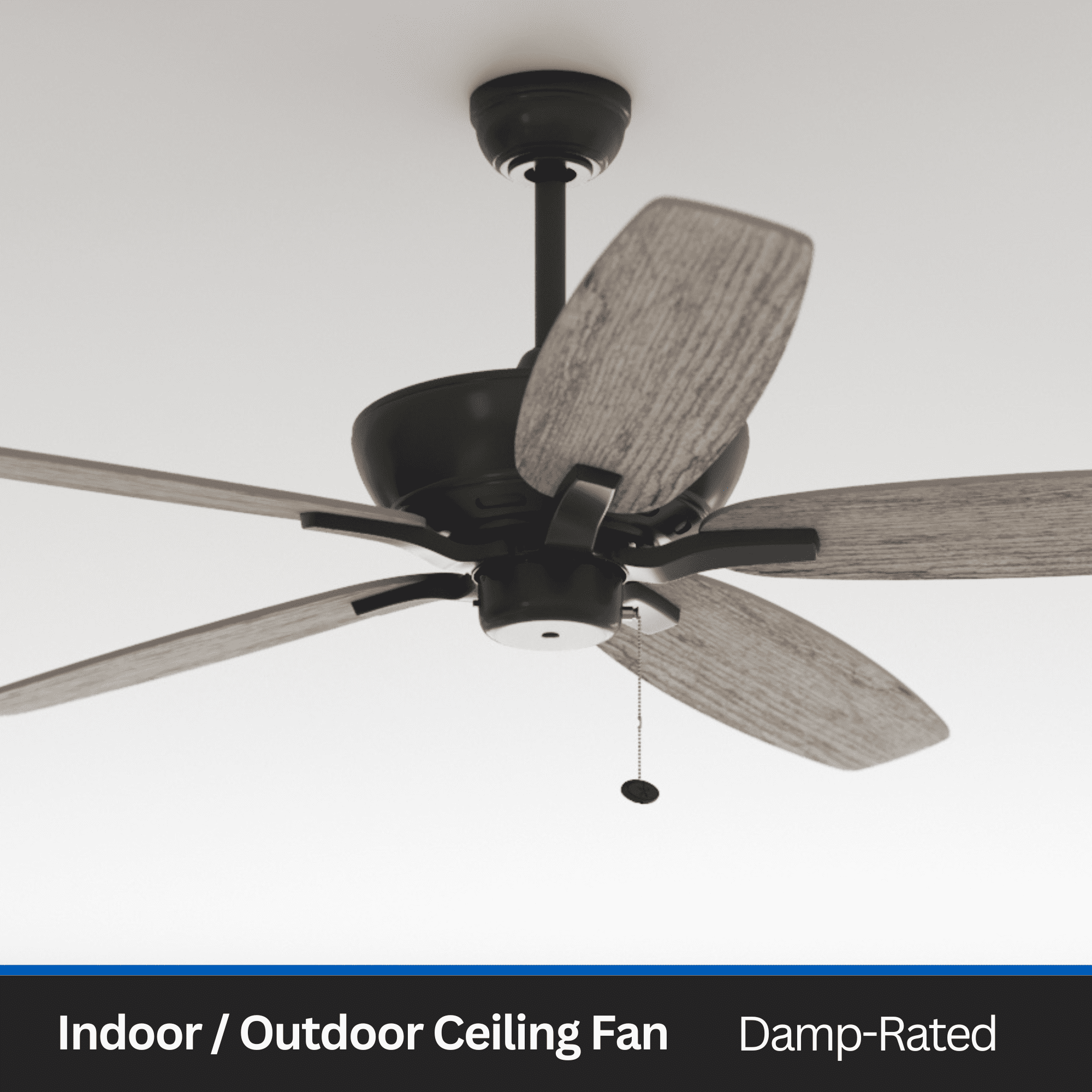 Keep Cool With The Correct Ceiling Fan Size: For ultimate performance, choose the best ceiling fan size for your room; This 60 inch indoor/outdoor ceiling fan is ideal for larger areas over 400 sq. ft. such as porches, patios and garages. Classic Blades: This traditional, 5 blade fan provides ultimate airflow; These fan blades deliver maximum circulation at high speed Tri-Mount Hanging Options: A multi-position fan with 3 hanging options; Standard option includes a 4 inch downrod; Flushmount option is for maximum head room; Angled mount option allows for hanging on vaulted ceilings with a longer downrod (sold separately) Crafted With High-Quality Material: The high-capacity motor delivers powerful airflow and quiet performance for years to come; This durable and classic ceiling fan is designed for long lasting comfort; ETL listed Reversible Fan For All Seasons: Improves air circulation in winter and summer; During summer, this ceiling fan optimizes airflow to enhance comfort; During winter, change the direction to evenly distribute warm air on low speed A Ceiling Fan For Outdoor Spaces: This outdoor/indoor fan is damp rated and perfect for your covered patio, porch, garage and any large living spaces where increased airflow can make a room more comfortable Pull Chain Control: Control the 3 speeds of you Mainstays ceiling fan with the pull chain; Compatible with universal ceiling fan remotes (sold separately) Dual-Finish Blades: This fan comes with a different finish on each side of the blades; Choose between Aged Cedar and Ebony; Pick the finish that best fits your space