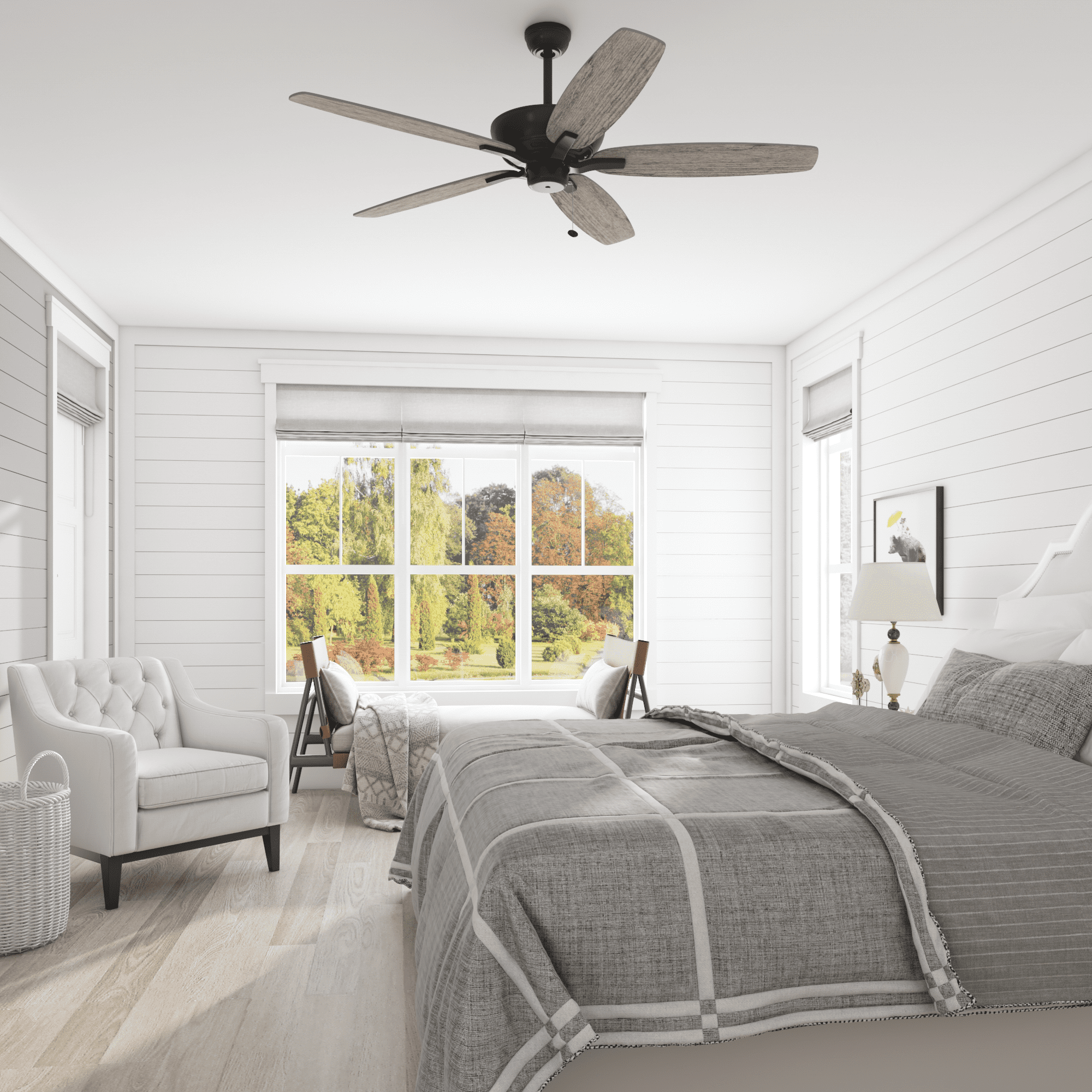 This classic style fan features stylish details and pairs well with most home décor. This white ceiling fan with traditional 5-blade design provides comforting, adjustable airflow and is damp rated for use indoors and covered outdoor spaces such as porches and patios. Easily control your ceiling fan’s 3 speeds with the traditional pull chains. Use the reversible airflow switch to change the direction of the fan to properly distribute air. During warmer months, this fan will provide a cooling effect or when reversed during the cooler months, it will help distribute warm air. This ceiling fan was created with high-quality materials that are durable and long-lasting and comes with a limited lifetime warranty from the manufacturer. Specifications: Sizing: 60-in 5-blade indoor/outdoor fan for rooms over 400 sq. ft.