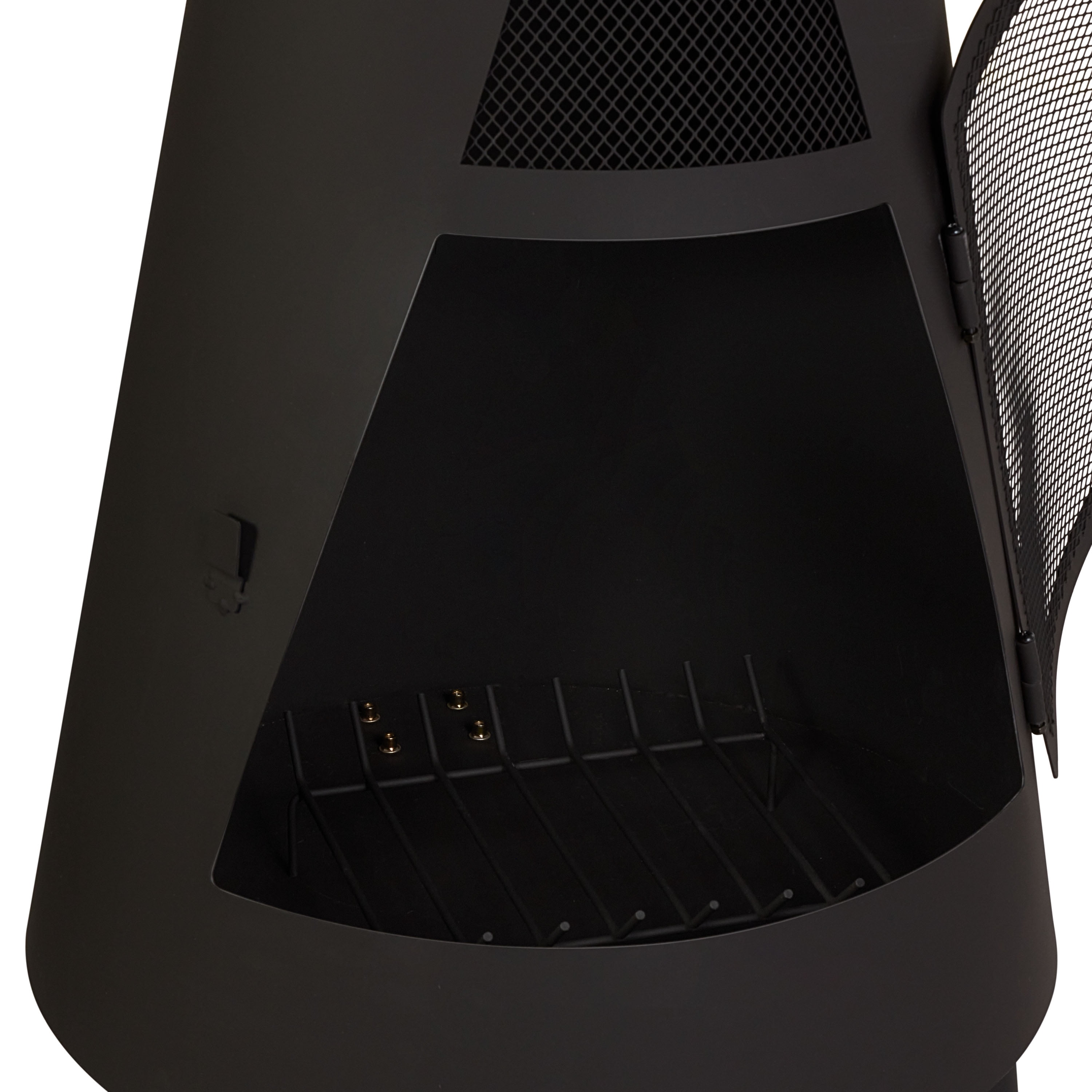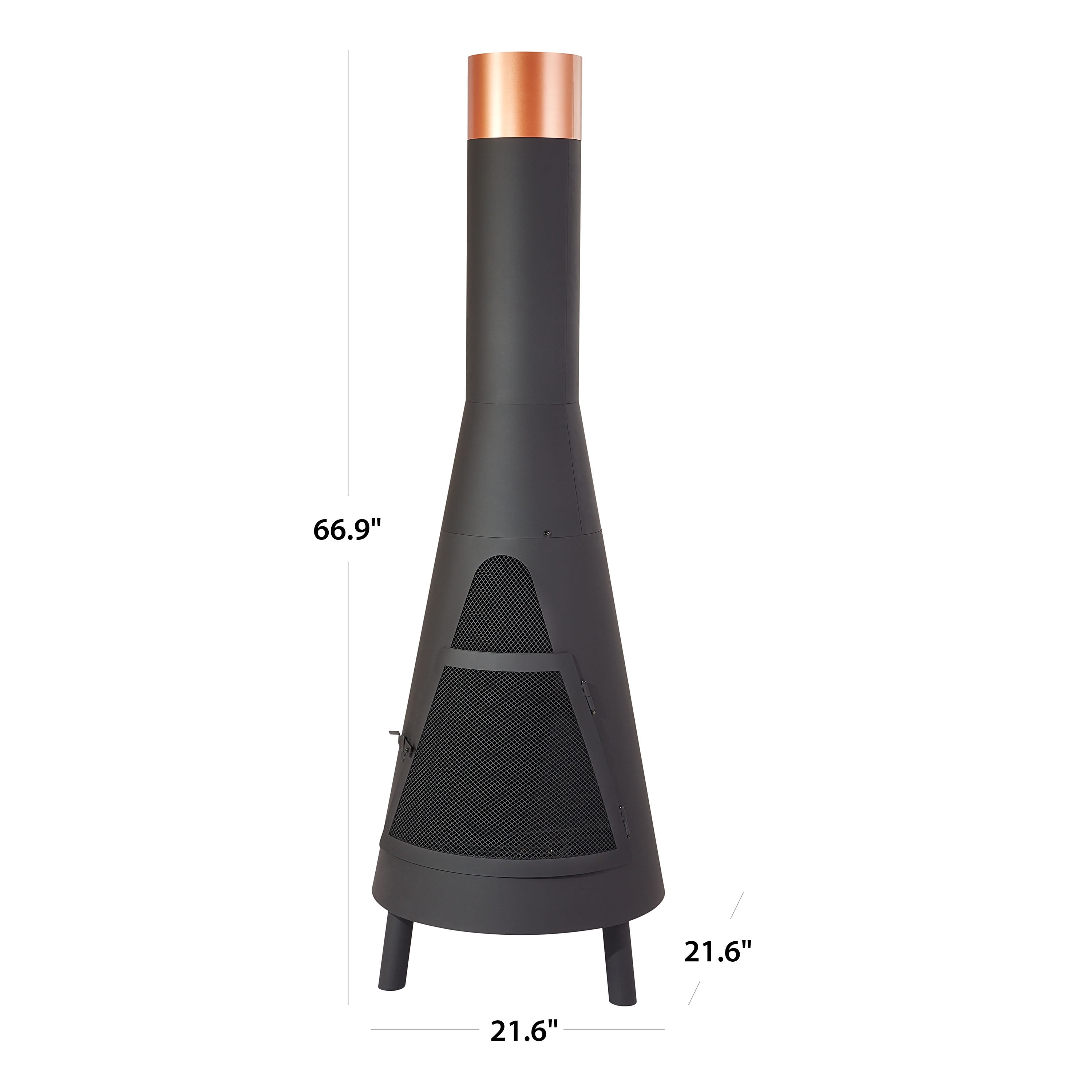 Mainstays 67” Round Powder-Coated-Black Finish Steel Chiminea with Poker Sleek, eye-catching fire pit makes ideal centerpiece to backyard or patio Includes a poker, a cover, and a fire grate for burning dry, seasoned hardwood Designed to provide warmth and a soothing ambiance for your outdoor gatherings Durable, steel chiminea blends modern style with a classic, black finish topped by a stylish, copper-colored ring Material: Steel Dimensions: 21.6”L x 21.6”W x 66.9”H Weight: 30.8 lbs Some assembly required Care: Clean on a regular basis. Note: After repeated use, a slight discoloration of the finish may occur. DO NOT attempt to clean this fire pit until the fire is COMPLETELY out and cool to the touch. DO NOT use oven cleaner or abrasive cleaners, as they will damage this product. DO NOT clean any part of this fire pit in a self-cleaning oven, as it may damage the finish. Wipe exterior surface with a mild dishwashing detergent or baking soda. For stubborn surface, use a citrus based degreaser and a nylon scrubbing brush. Rinse and clean with water. Remove built-up creosote from components with a chimney-cleaning product.