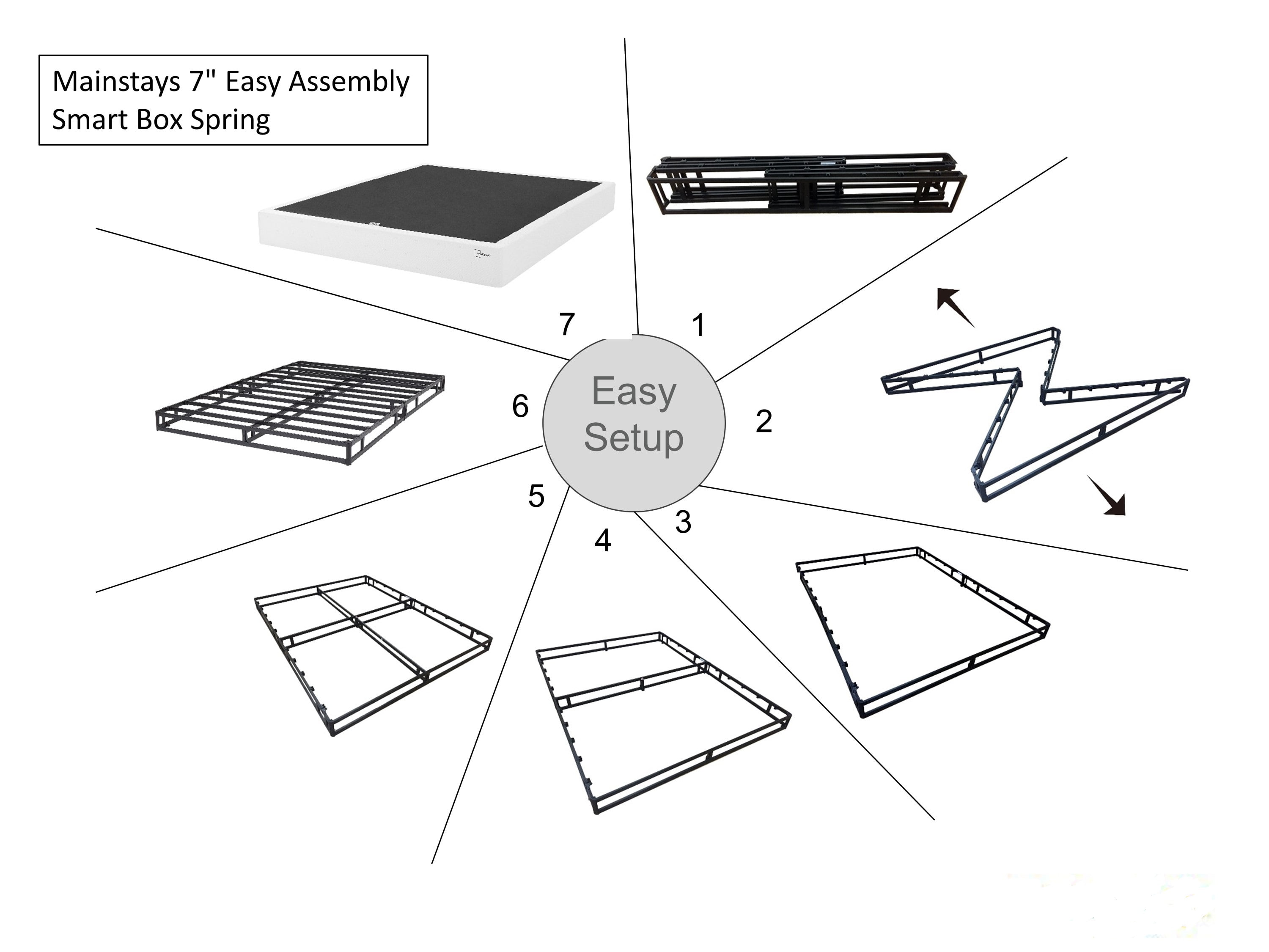 Mainstays 7″ Easy Assembly Smart Box Spring, Twin: Sets up easily in seconds An innovative design allows the box spring to easily fold up for storage and transport when not in use Provides ultra-sturdy support for any innerspring, memory foam, or combination mattress Features a 100% polyester jacquard cover Constructed with a durable powder coated steel frame for a long life of reliable use Easy to assemble with no tools required Available in Twin, Twin XL, Full, Queen, King, and California King sizes Twin and Twin XL can support up to 600 lbs. total weight capacity Full, Queen, King, and California King can support up to 1200 lbs. total weight capacity Mattresses and bed frames sold separately Please see our assortment of mattresses Twin dimensions: 74″ x 38″ x 7″H – 26.54 lbs. Twin XL dimensions: 79″ x 38″ x 7″H – 26.92 lbs. Full dimensions: 74″ x 53″ x 7″H – 35.71 lbs. Queen dimensions: 79″ x 59″ x 7″H – 39.15 lbs. King dimensions: 79″ x 75″ x 7″H – 45.01 lbs. California King dimensions: 83″ x 71″ x 7″H – 44.22 lbs. Twin shipping dimensions: 41.34″ x 11.61″ x 8.7″ – 29.87 lbs. Twin XL shipping dimensions: 41.34″ x 11.61″ x 8.7″ – 30.25 lbs. Full shipping dimensions: 56.3″ x 12.80″ x 8.07″ – 40.01 lbs. Queen shipping dimensions: 62.80″ x 12.8″ x 8.07″ – 43.83 lbs. King shipping dimensions: 78.94″ x 11.2″ x 8.07″ – 50.62 lbs. California King shipping dimensions: 74.41″ x 11.2″ x 8.07″ – 50.04 lbs.