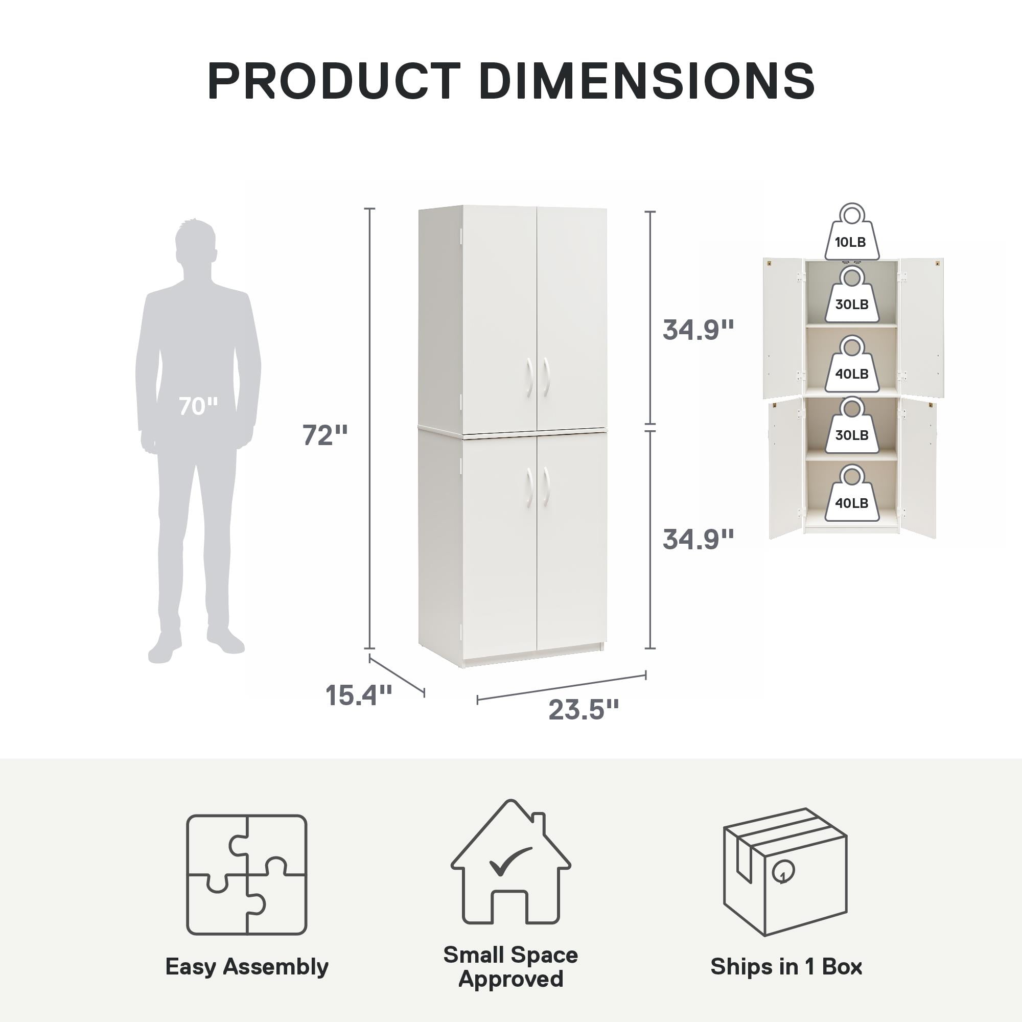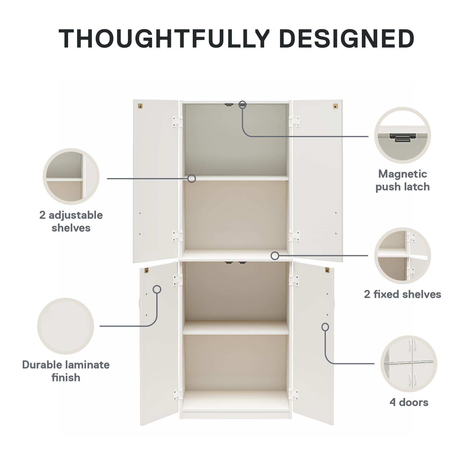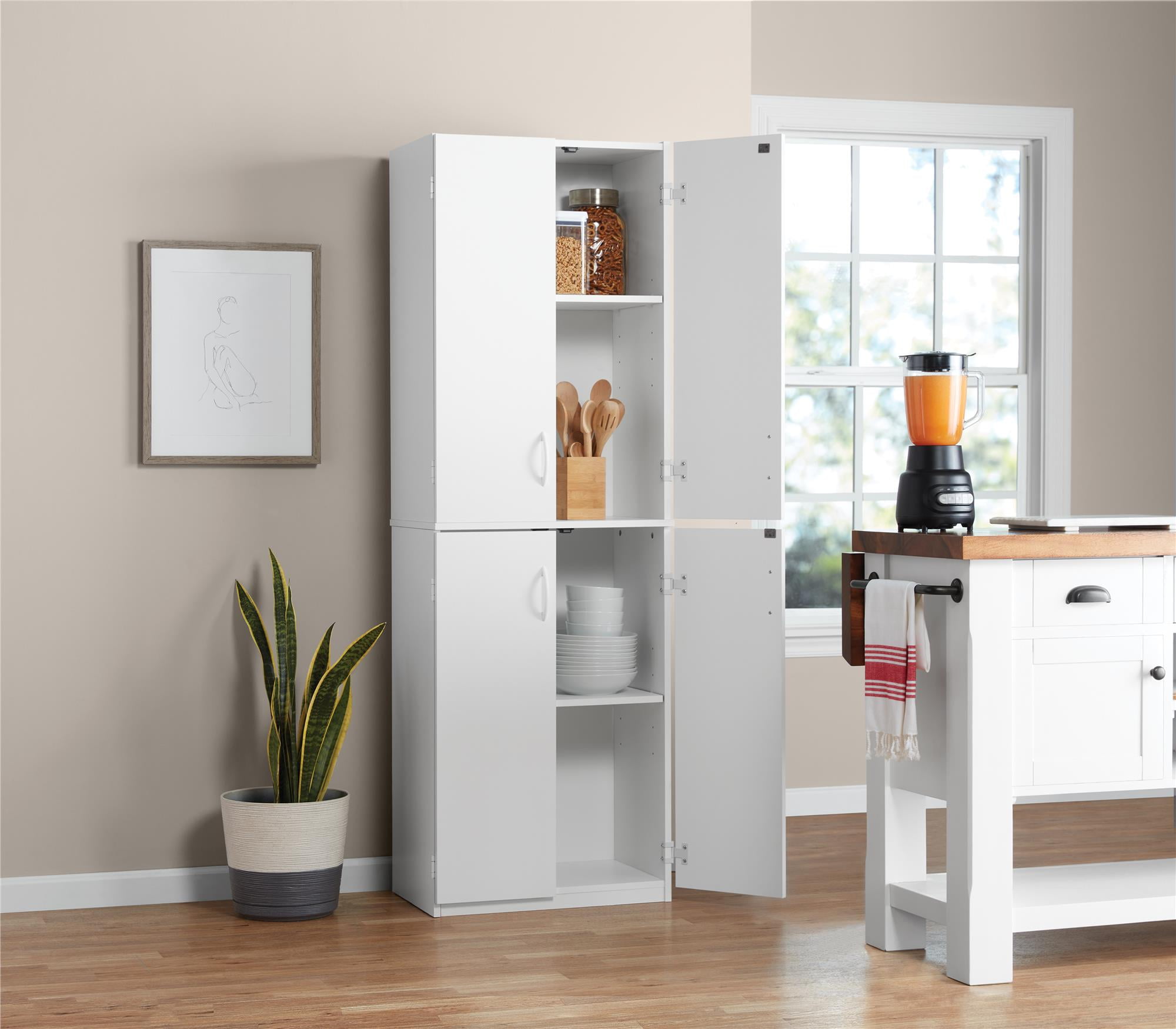 VERSATILITY AND STYLE: Discover the versatility of the Mainstays 72″ 4-Door Storage Cabinet, a stylish solution perfect for your laundry room, kitchen, or garage SPACIOUS AND ADJUSTABLE STORAGE: With four doors and four shelves, three of which are adjustable, it offers ample space for essentials like books, dishes, tools, or pantry items DURABLE CONSTRUCTION AND DESIGN: Constructed from engineered wood with a durable laminate finish, it promises long-lasting affordable storage and is available in a variety of neutral colors to seamlessly blend with any décor PRODUCT DETAILS: Ships in one box and requires assembly by two adults; Assembled dimensions and weight: 23.5″ W x 15.37″ D x 71.97″ H; 100 lbs.; 1-year limited warranty included IMPORTANT: This unit MUST be secured to the wall to help prevent tipping. Carefully follow the assembly manual for proper installation of the included anti-tip safety bracket.