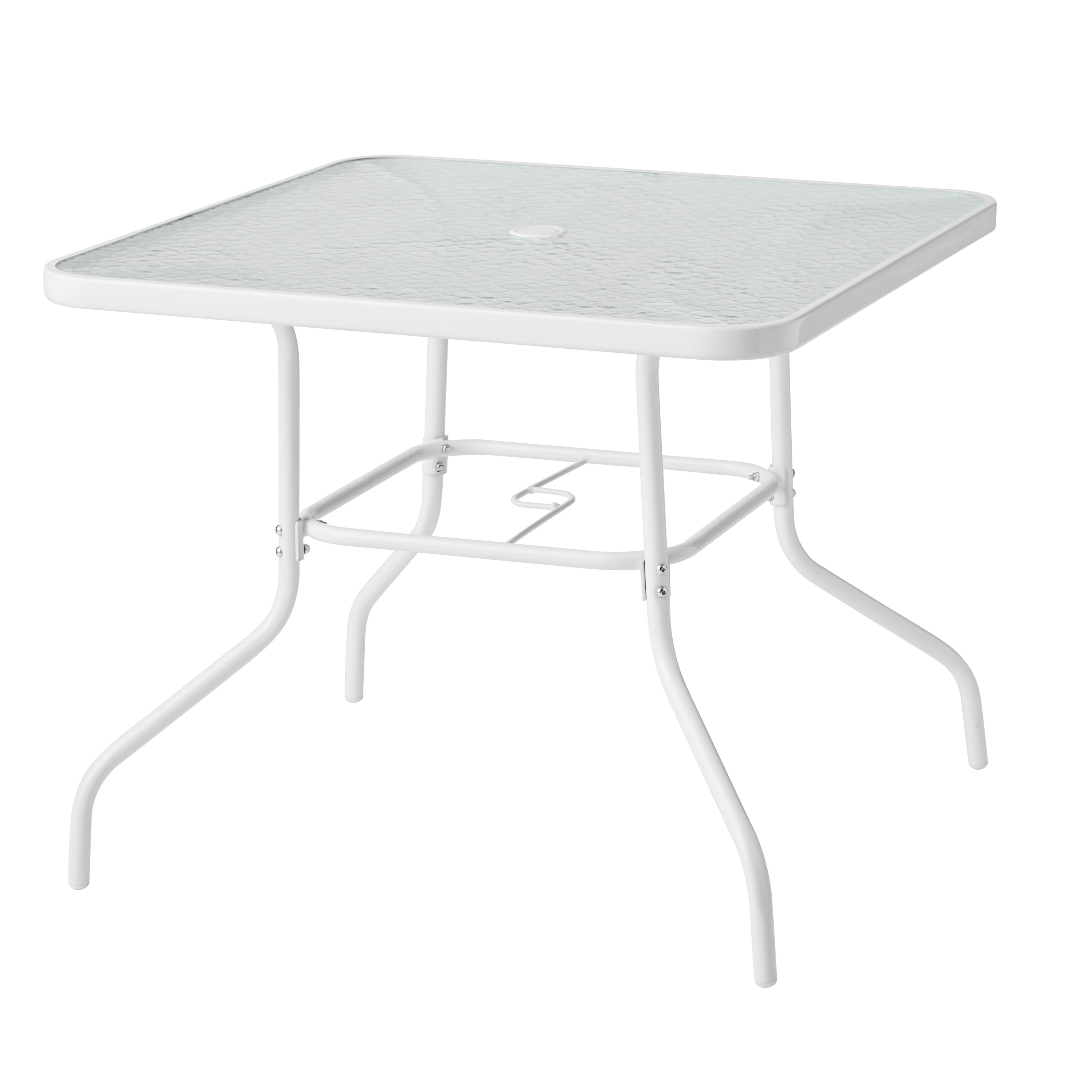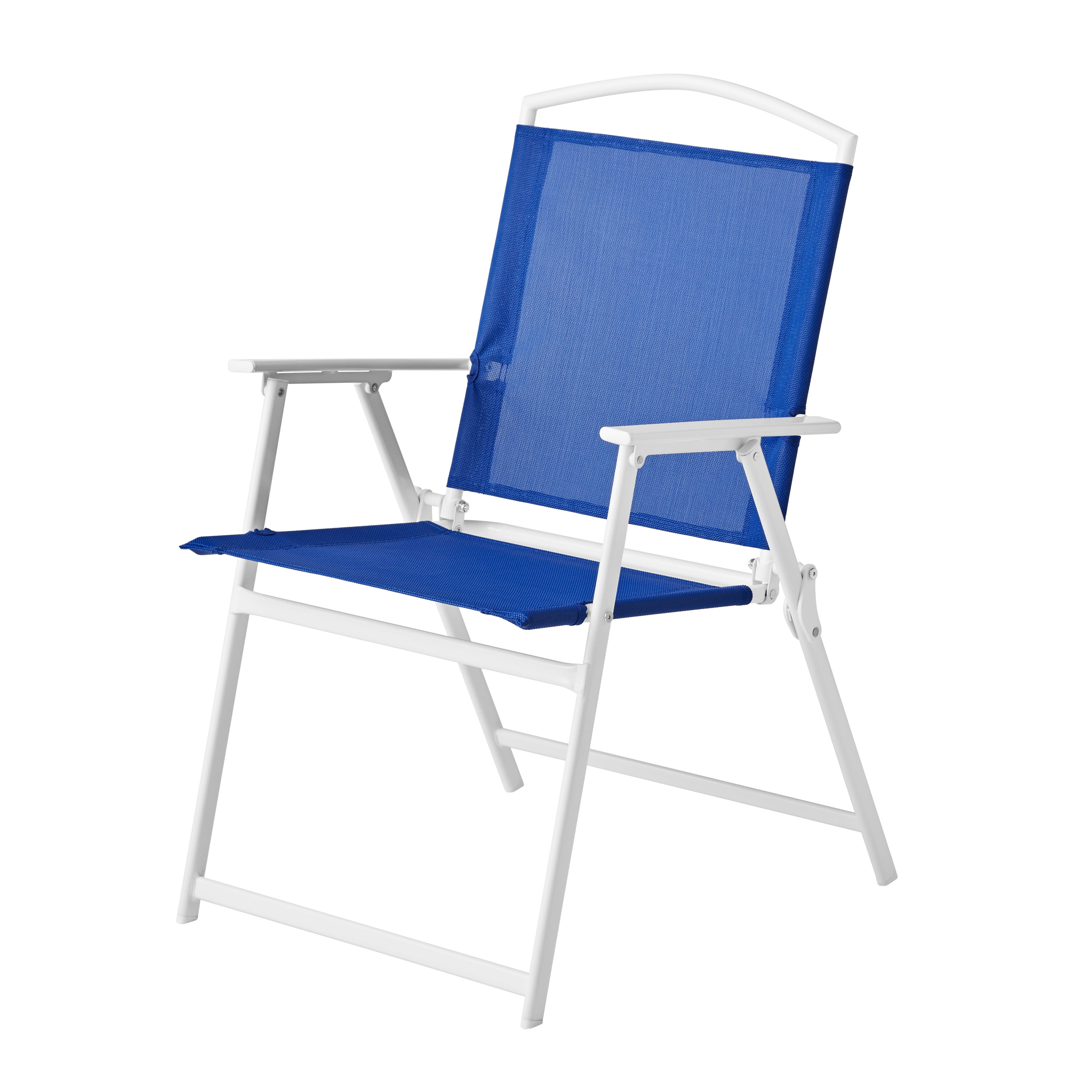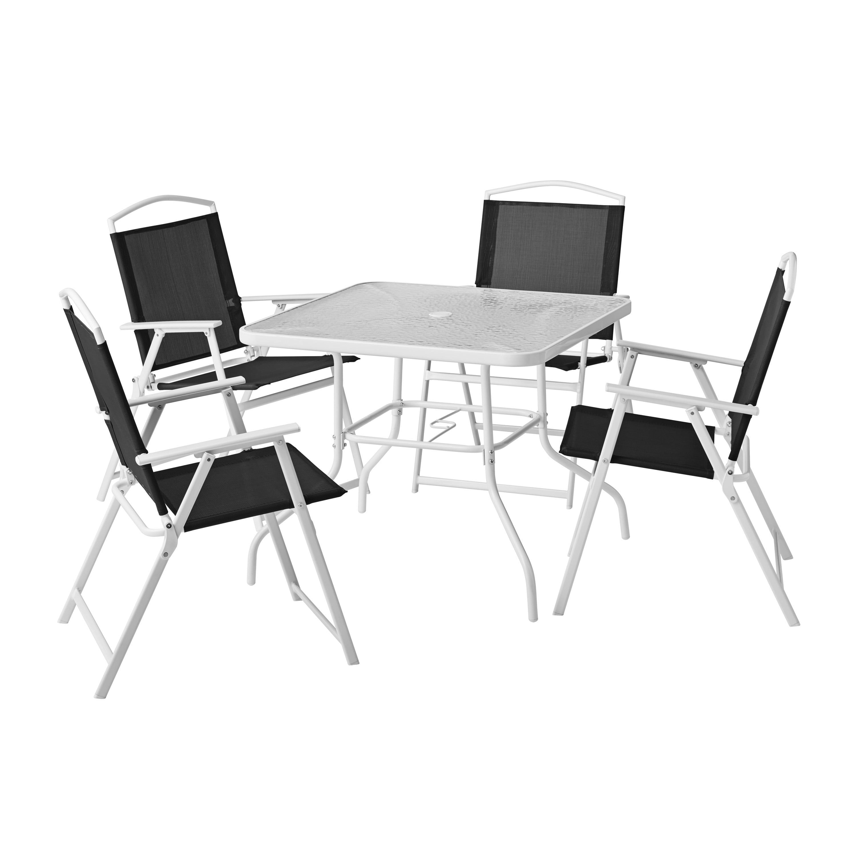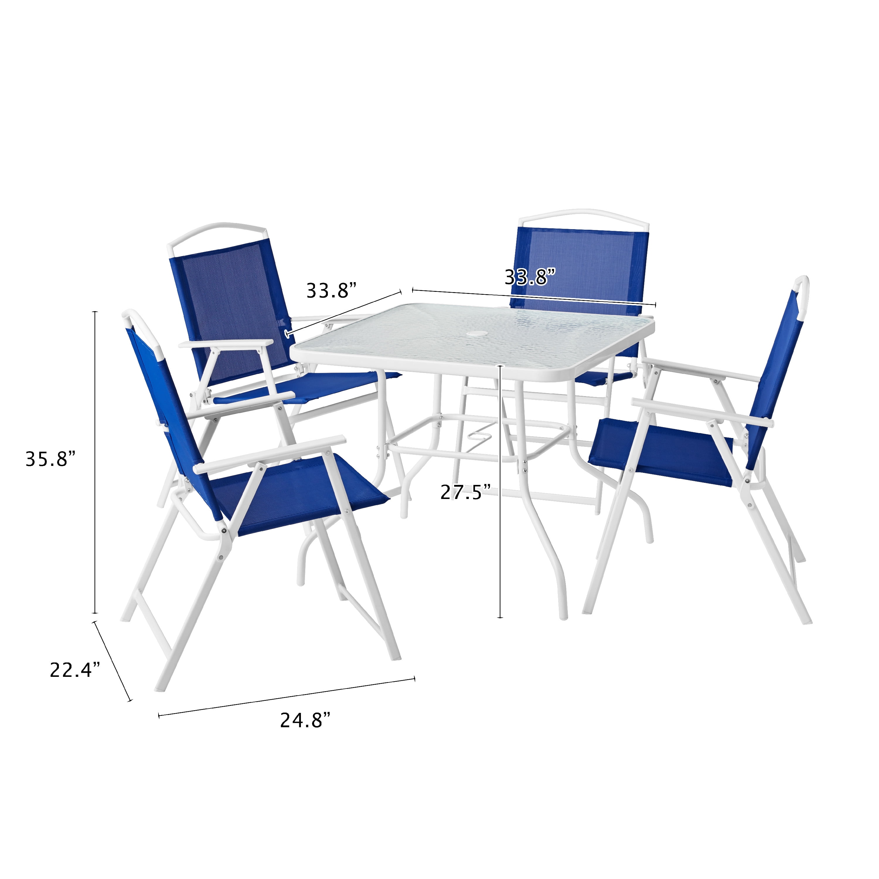 Mainstays Albany Lane Outdoor Patio 5-Piece Dining Set, White Steel Frame and Blue Sling Durable powder-coating steel frame for long-lasting use Weather-resistant treatment Quick-drying ventilated sling fabric is easy to care for Tempered glass tabletop with umbrella hole Assembly details: No assembly required for chairs; Required assembly hardware included for table Folds flat for convenient storage Great for use on patios, lanais, porches, gardens, yards, pool areas, and more Easy to maintain; simply wipe down with soap and water as needed and allow to air dry Assembled Product Dimensions (L x W x H): chair – 25” x 22.63” x 35.8” ; table – 33.8” x 33.8” x 27.5” Product weight: chairs – 9.3 lbs. each, table – 26.8 lbs