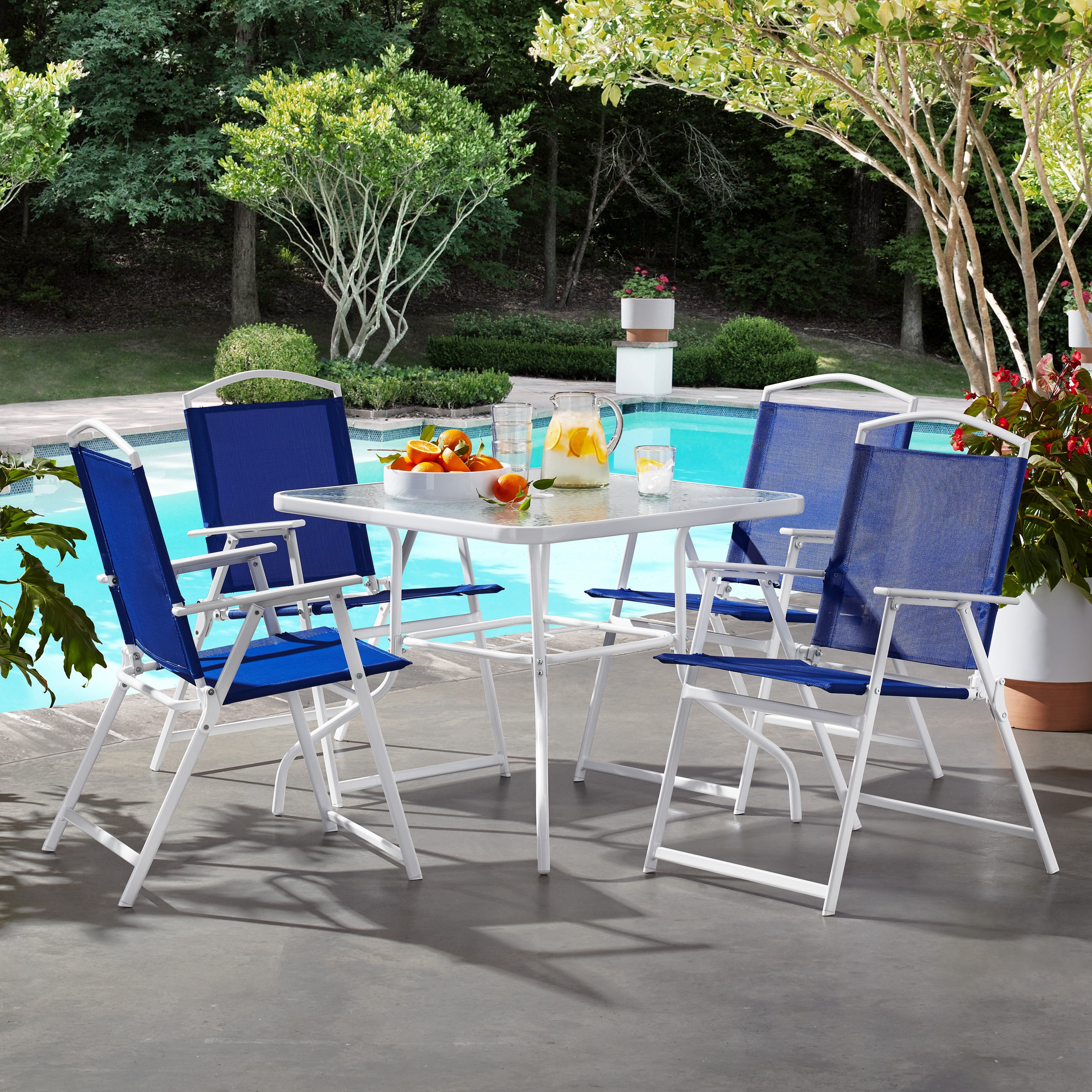 The Mainstays Albany Lane Outdoor Patio 5-Piece Dining Set, White Steel Frame and Blue Sling is a very traditional folding set that includes 4 sling folding chairs and 1 glass table. This set can be excellent on your patio, lanai, porch, garden, or yard. This dining set is crafted from durable powder-coated steel for long-lasting use. The chairs feature blue ventilated slings for quick drying and easy cleaning. The tempered glass tabletop features an umbrella hole that can fit standard-sized patio umbrellas for shade on sunny days. The folding chairs can support up to 250 lbs. each and require no assembly. The 4 legs and 1 connected bracket of the table can be assembled easily in under half an hour. Put out coffee, wine, fruit, etc., and gather your friends around this easy-to-clean outdoor dining set. For additional questions or concerns regarding this product care, please contact the manufacturer’s customer service department at 1-866-905-4107. The only thing left for you and your family to do now is to enjoy the great outdoors with your new furniture.