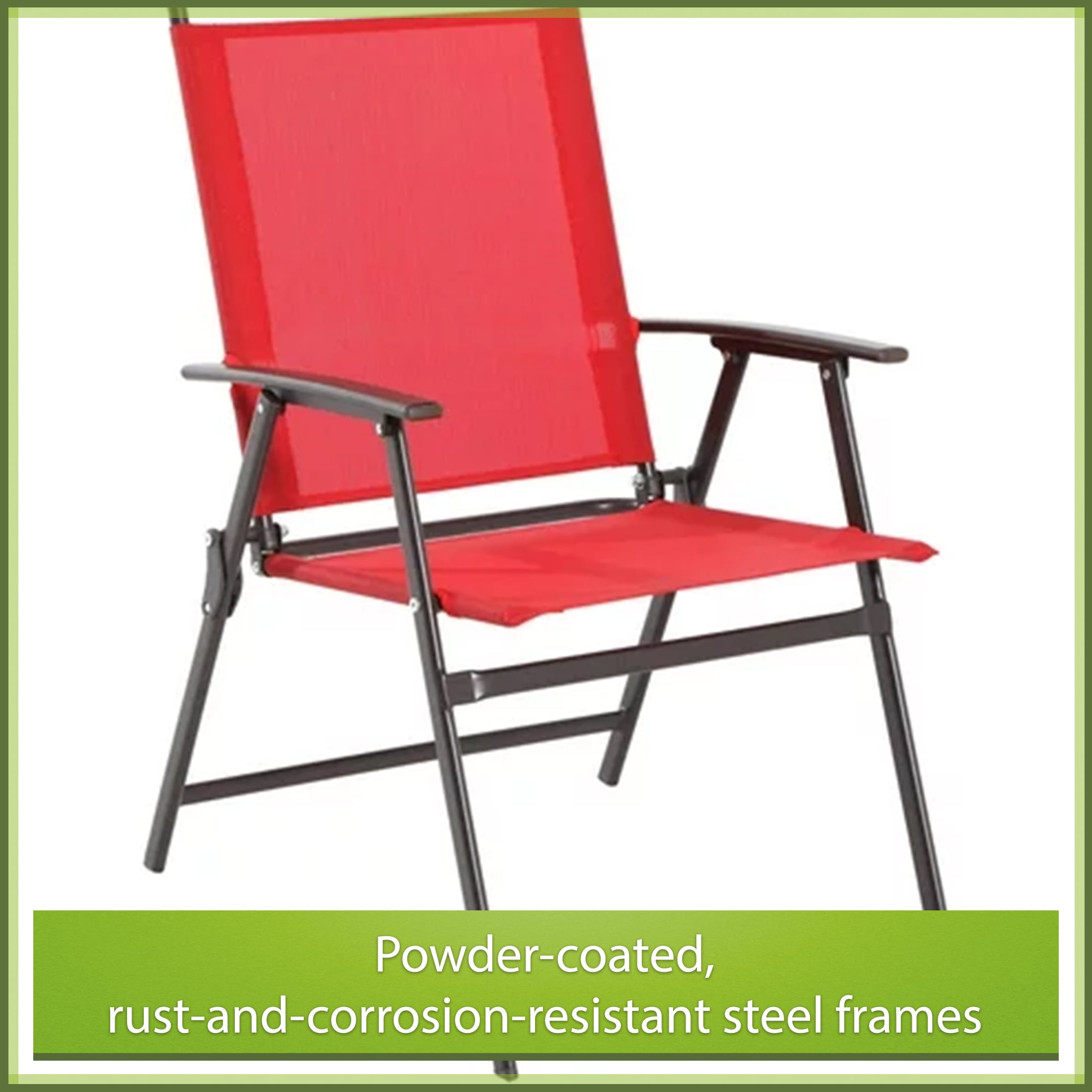 Mainstays Albany Lane 6-Piece Outdoor Patio Dining Set, Red Casual, outdoor patio set ideal for entertaining, dining, and relaxing Includes 4 foldable, portable, easy-to-store armchairs, a square table with a water-wave, tempered glass top, and a stylish market umbrella Chairs and umbrella feature quick-drying sling fabric; black frames constructed of powder-coated, rust-and-corrosion-resistant steel Stylish, classic look complements most other outdoor furniture and decor Quaint, fun little addition to any porch, patio, or deck Instructions included for easy assembly Materials: Steel, tempered glass, PVC sling, polyester Weight capacity: 250 lbs (each chair) Assembled dimensions: 24.8″L x 22.44″W x 35.83″H (each chair), 33.8″L x 33.8″W x 27.5″H (table), 59.06″L x 59.06″W x 86.61″H (umbrella) Weight: 8.91 lbs (each chair), 28.22 lbs (table), 6.31 lbs (umbrella) Total weight: 70.17 lbs Care: Clean with mild solution of soap/detergent, rinse thoroughly, allow to air dry; do not use bleach or strong solvents as this will cause damage to both fabric and metal finishes