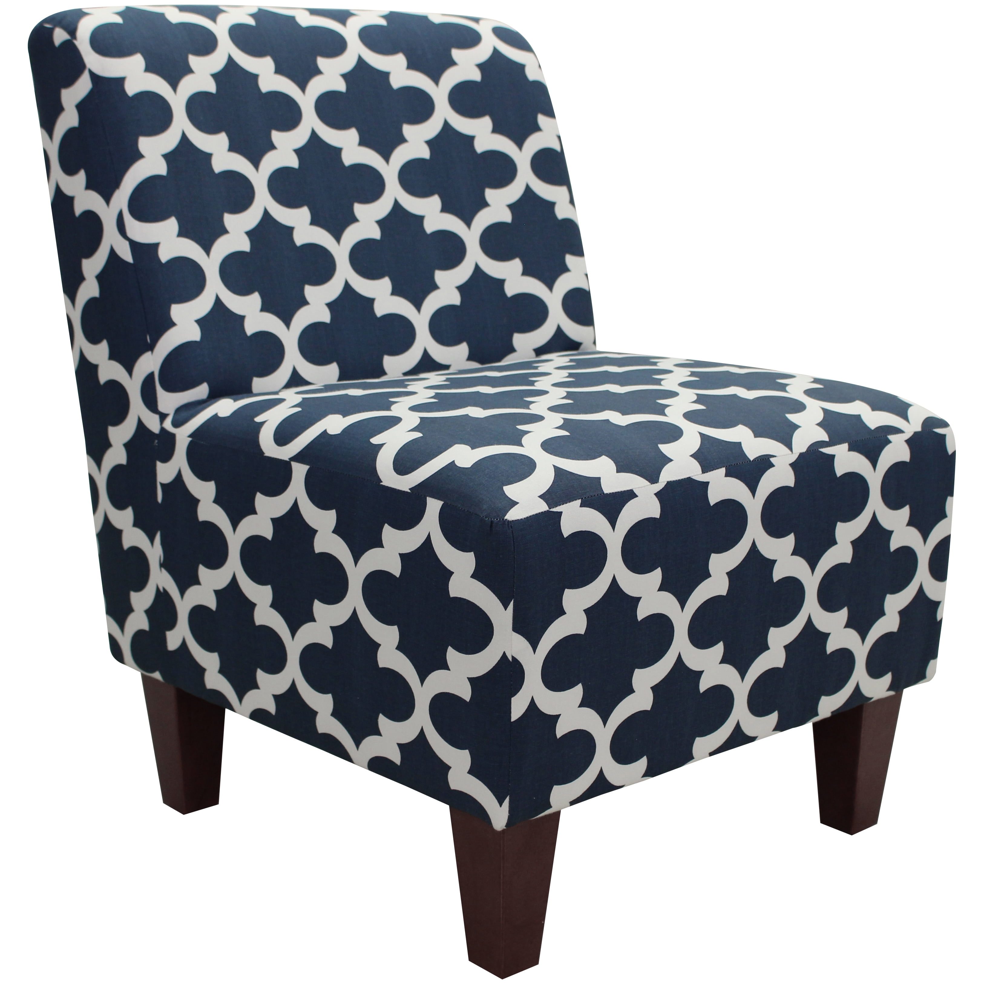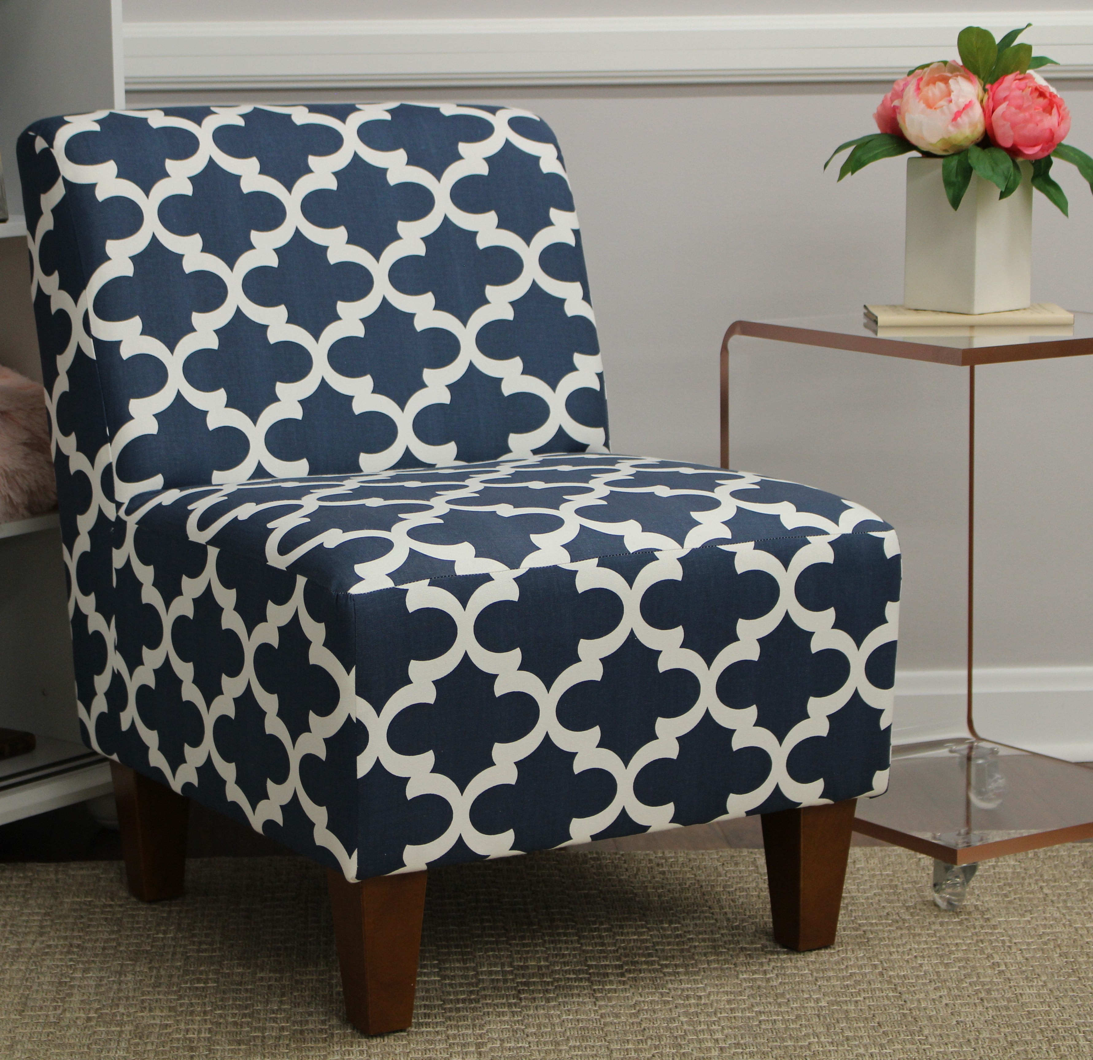 Mainstays Amanda Armless Accent Chair, Multiple Colors: Armless slipper chair available in multiple prints including: Buckwheat Beige, Caribbean Blue, Navy Blue and White, and Peacock Animal Print Generous padding and coil spring construction Easy assembly – simply screw on legs Wipes clean with damp cloth Overall Dimensions: 28″D x 24″W x 32″H; 17″ Seat Height