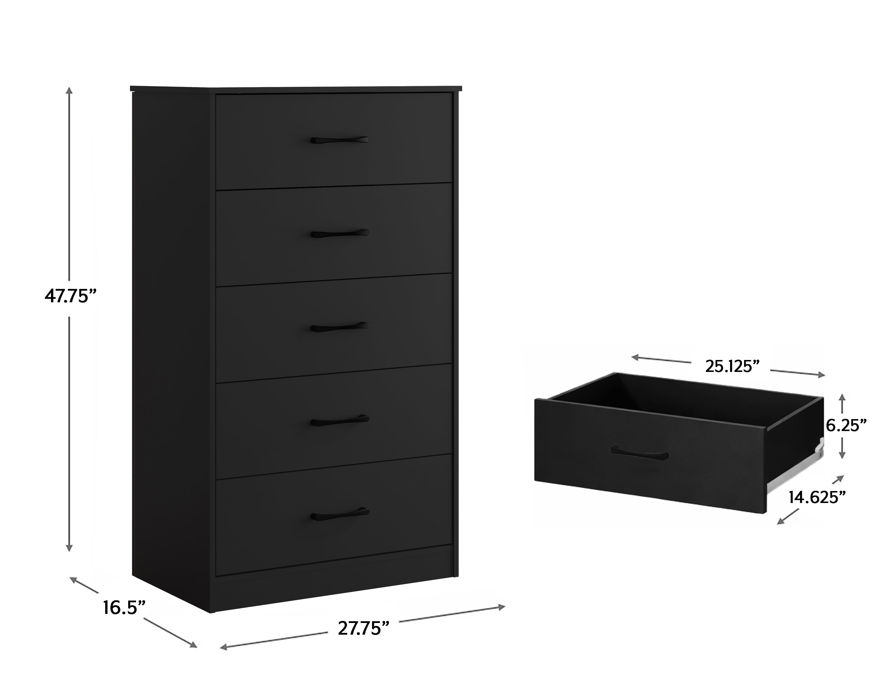 Minimally adorned casual transitional adult dresser with a classic silhouette Wood, MDF, particle board and PU paper foil laminate construction in a black finish Ultra-fast, frustration-free, easy assembly Overall Dimensions: 47.75H x 27.75W x 16.5D Assembly required Item will ship in one box Effortless metal glide system This product is compliant with the U.S. STURDY Act, which addresses anti-tip specifications that protect children. The design prohibits multiple drawers from being opened at once for safety purposes, and anti-tip hardware is included in the package Works well with modern and contemporary décor Stylish black drawer pulls