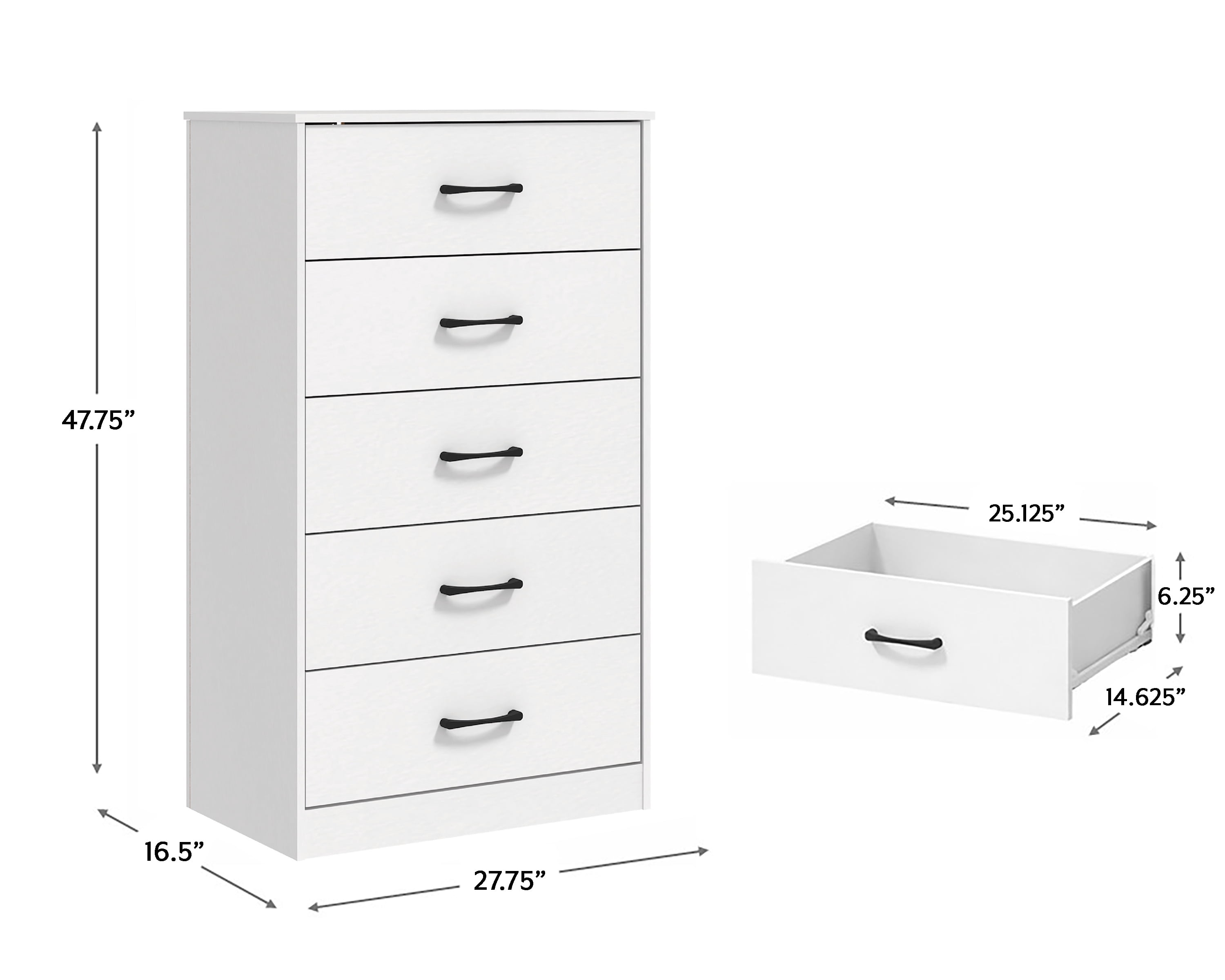 Minimally adorned casual transitional adult dresser with a classic silhouette Wood Composite, MDF, particle board and PU paper foil laminate construction in a white finish Ultra-fast, frustration-free, easy assembly Overall Dimensions: 47.75H x 27.75W x 16.5D Assembly required Item will ship in one box Effortless metal glide system This product is compliant with the U.S. STURDY Act, which addresses anti-tip specifications that protect children. The design prohibits multiple drawers from being opened at once for safety purposes, and anti-tip hardware is included in the package Works well with modern and contemporary décor Contrasting matte black drawer pulls