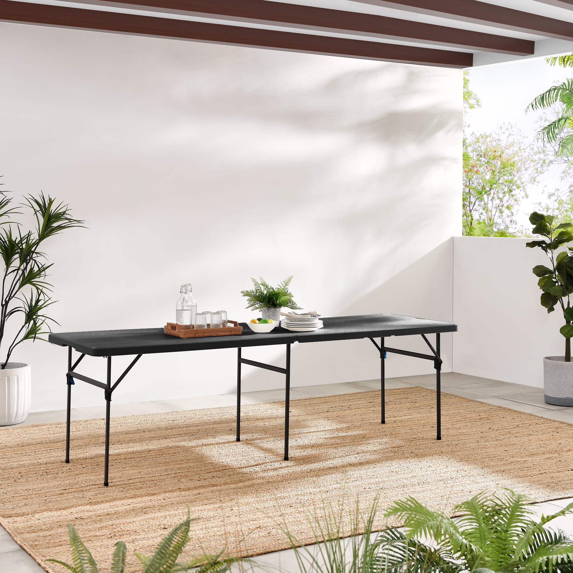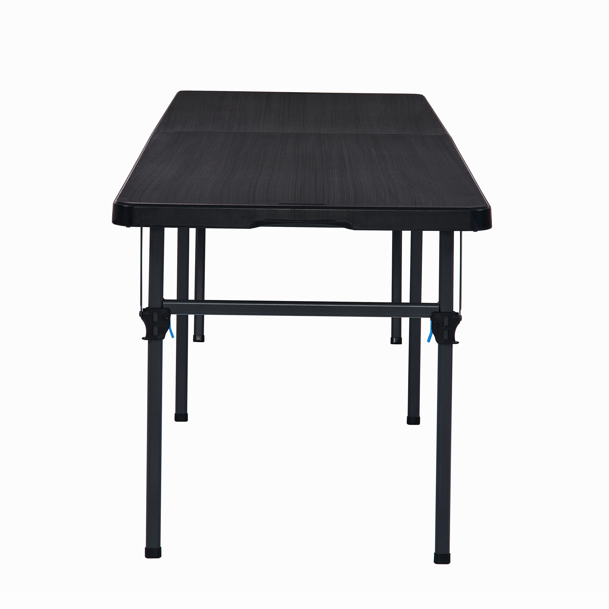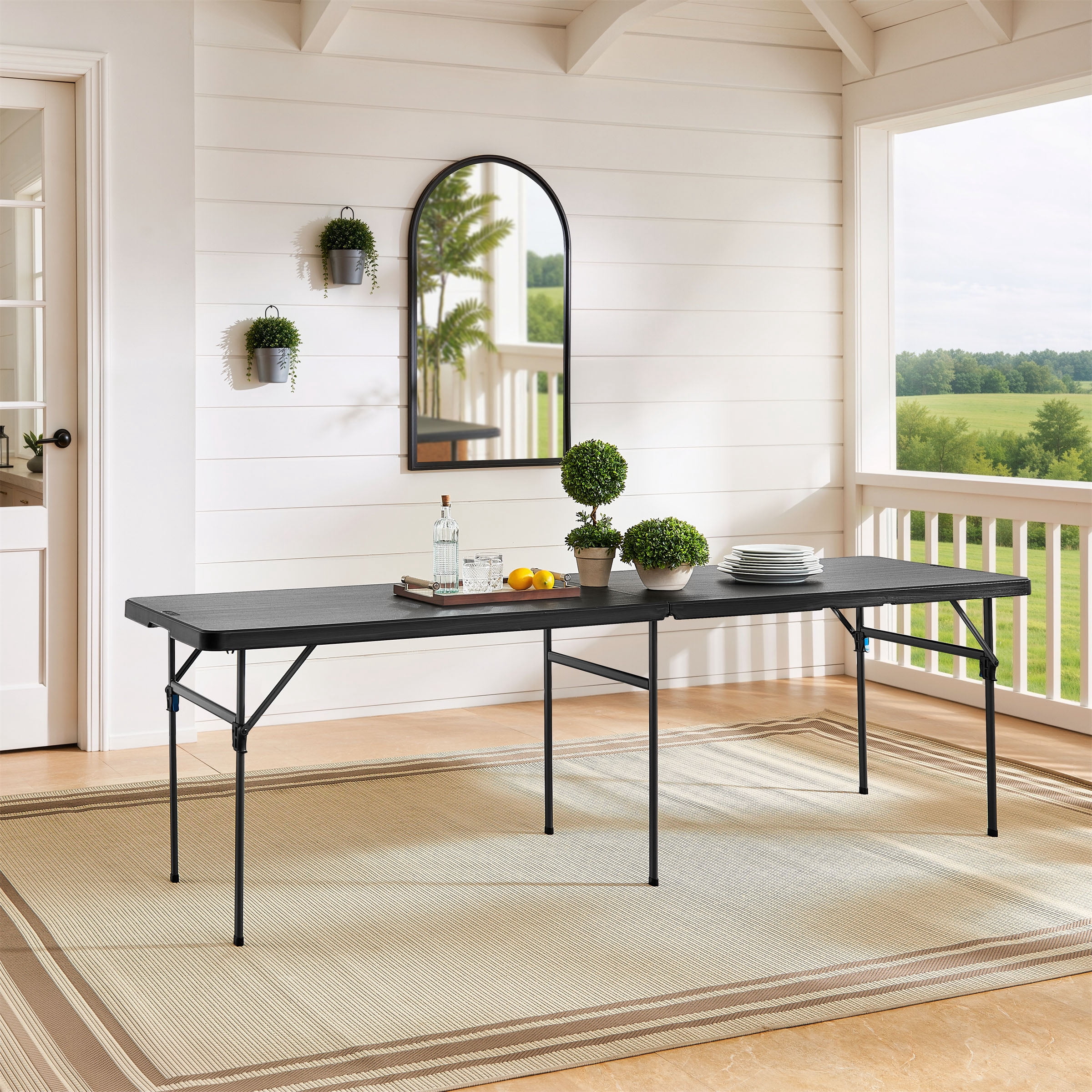 Mainstays 8 Foot Fold-in-Half Resin Table, Black Assembled Dimensions: 96″ x 30″ x 29″ Comfortably seats 8 adults Extra middle leg and support sidebars for an additional stable structure Easily folds in half for convenient storage or transport Constructed of UV-Protected high-density polyethylene plastic and black powder-coated steel Includes built-in carry handle, for easy transportation Built for indoor and outdoor use Durable Caps on legs to prevent floor damage No assembly is needed, can be open and folded in a few seconds Folded dimension: 48.03″ L x 30.00″ W x 3.62″ H Weight: 41.18 lbs. Weight Capacity: 500 lbs. Perfect for your home, office, or outdoor activities