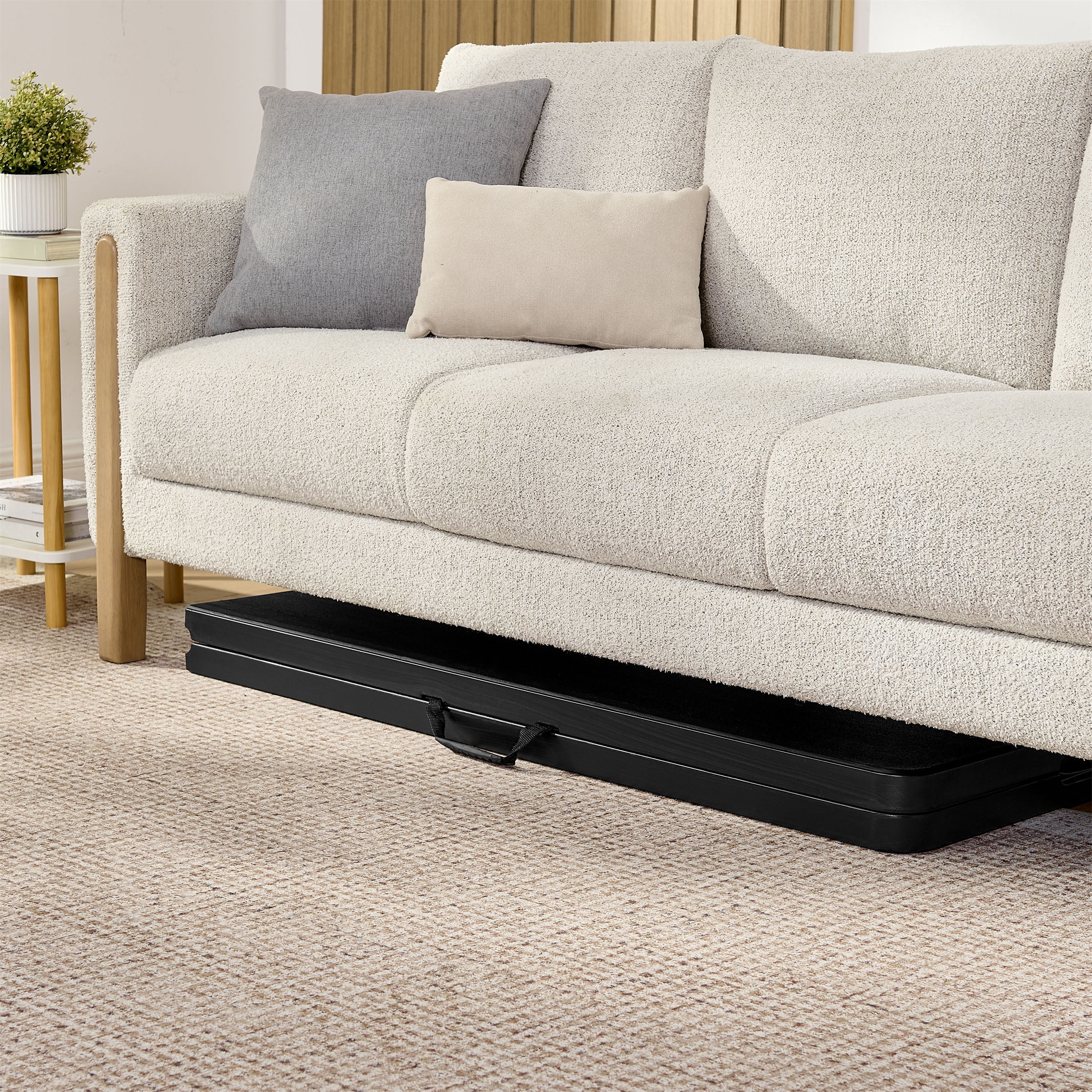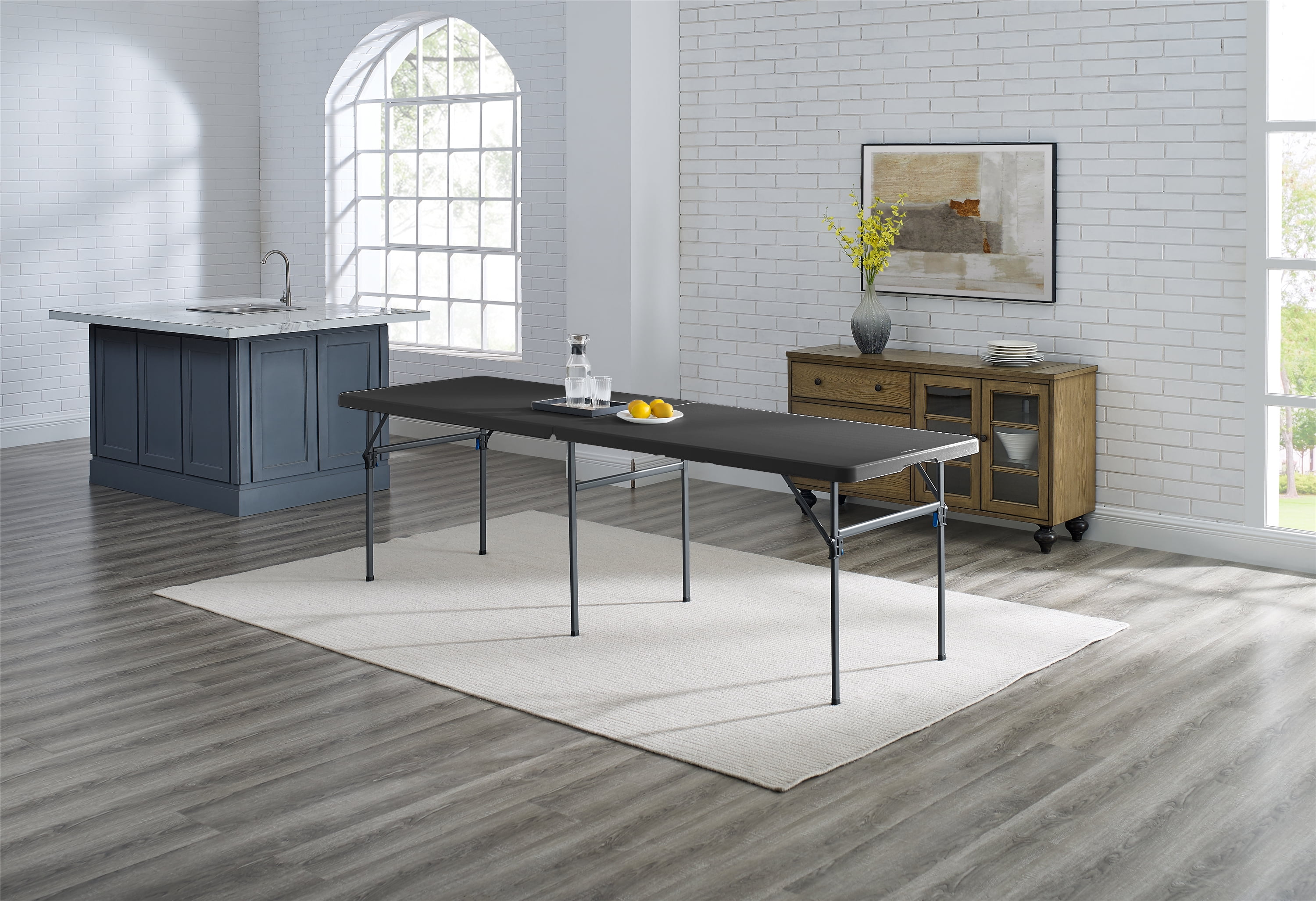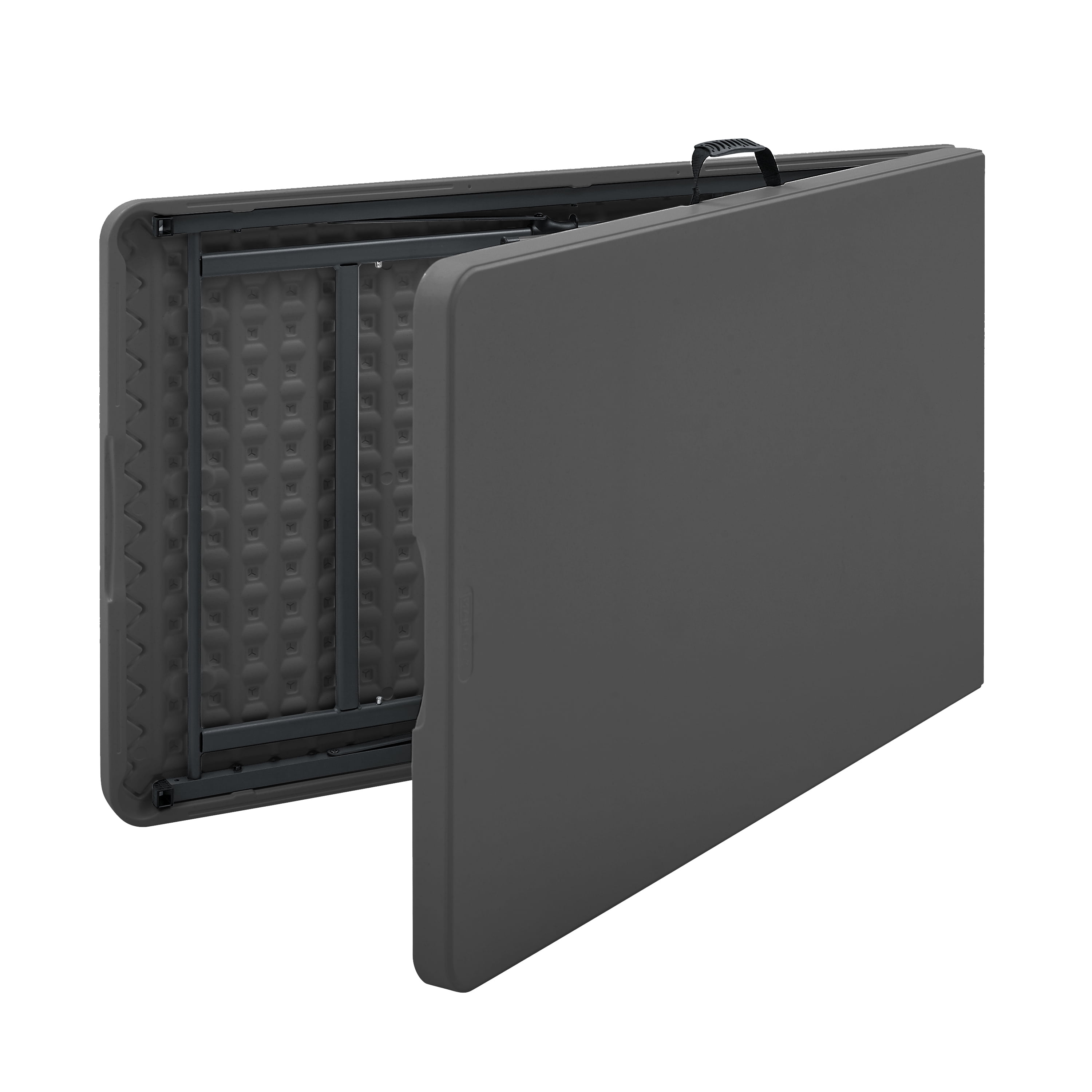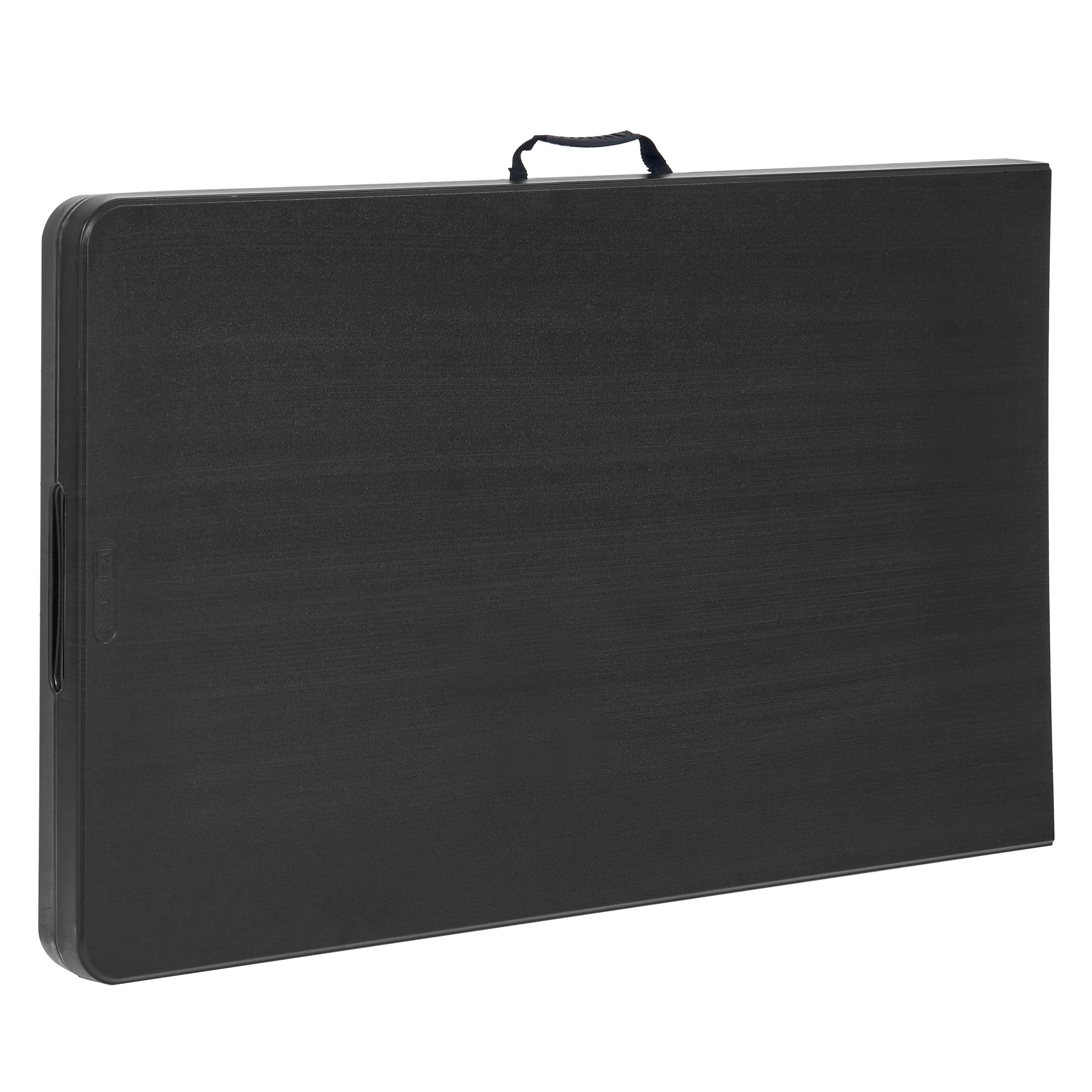 Mainstays 8 Foot Fold-in-Half Resin Table, Black Assembled Dimensions: 96″ x 30″ x 29″ Comfortably seats 8 adults Extra middle leg and support sidebars for an additional stable structure Easily folds in half for convenient storage or transport Constructed of UV-Protected high-density polyethylene plastic and black powder-coated steel Includes built-in carry handle, for easy transportation Built for indoor and outdoor use Durable Caps on legs to prevent floor damage No assembly is needed, can be open and folded in a few seconds Folded dimension: 48.03″ L x 30.00″ W x 3.62″ H Weight: 41.18 lbs. Weight Capacity: 500 lbs. Perfect for your home, office, or outdoor activities
