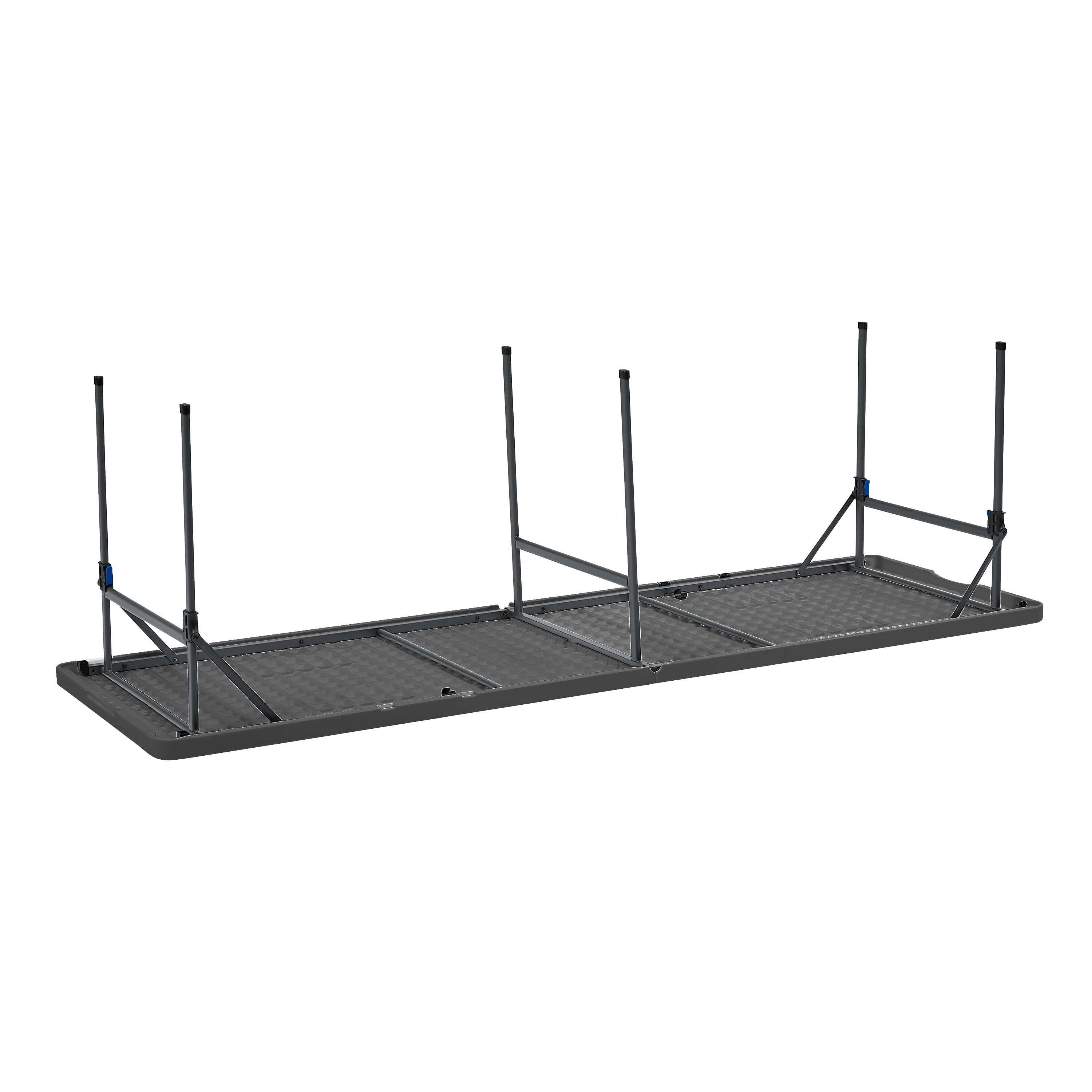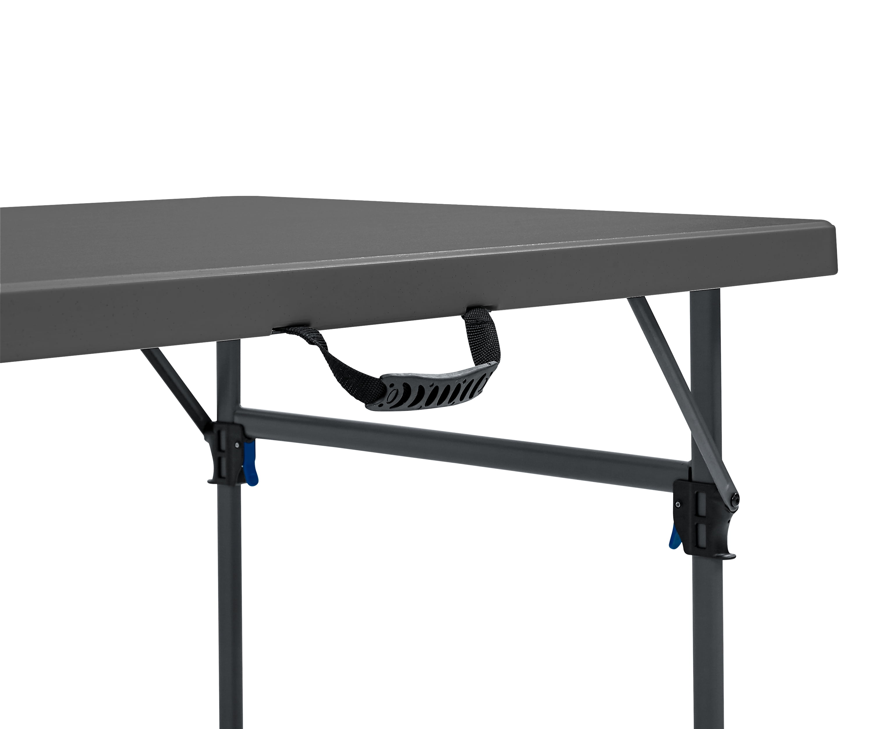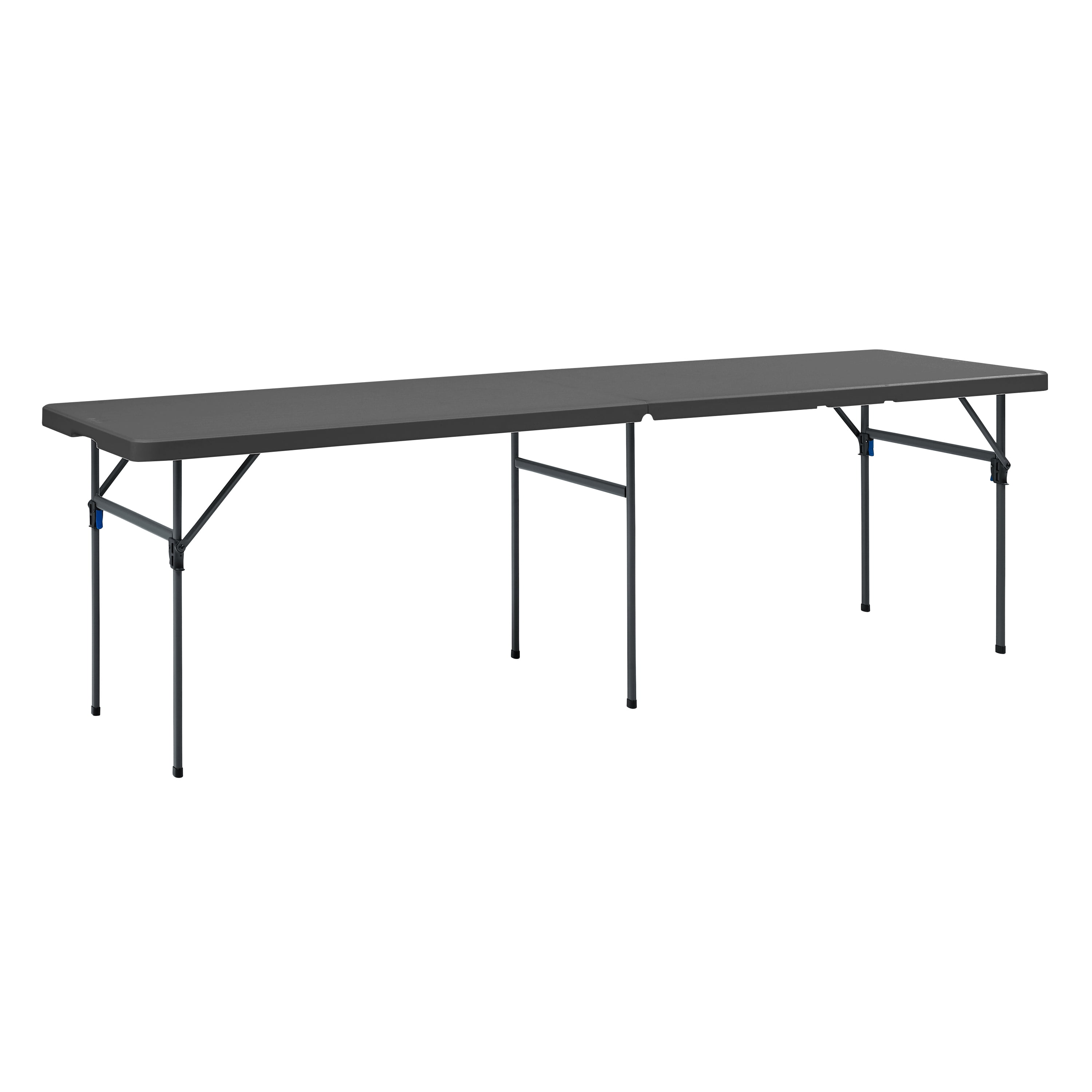 Make your next event a success with this lightweight, 8-foot black folding table from Mainstays. Sets up in seconds for extra room at parties or picnics, and the extra middle leg and side support bars provide superior strength and durability. Our pinch free buttons allow easy folding of legs, plus the carry handle makes it perfect for taking it on-the-go. The scratch and stain-resistant resin top ensures lasting durability and easy clean up, while the rust resistant powder coated steel frame offers a strong and stable structure. The Mainstays 8-foot fold-in-half table in black is perfect for all your needs and occasions, great for everyday use both indoors and outdoors.