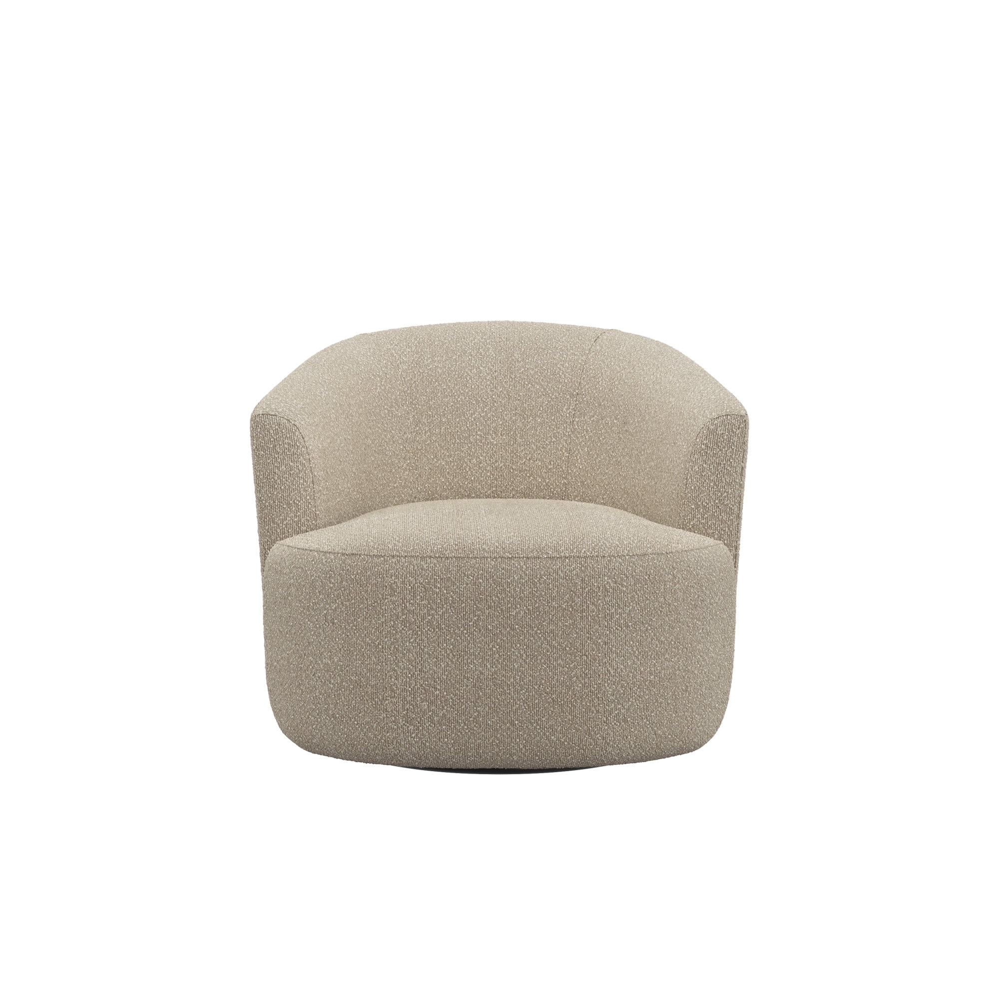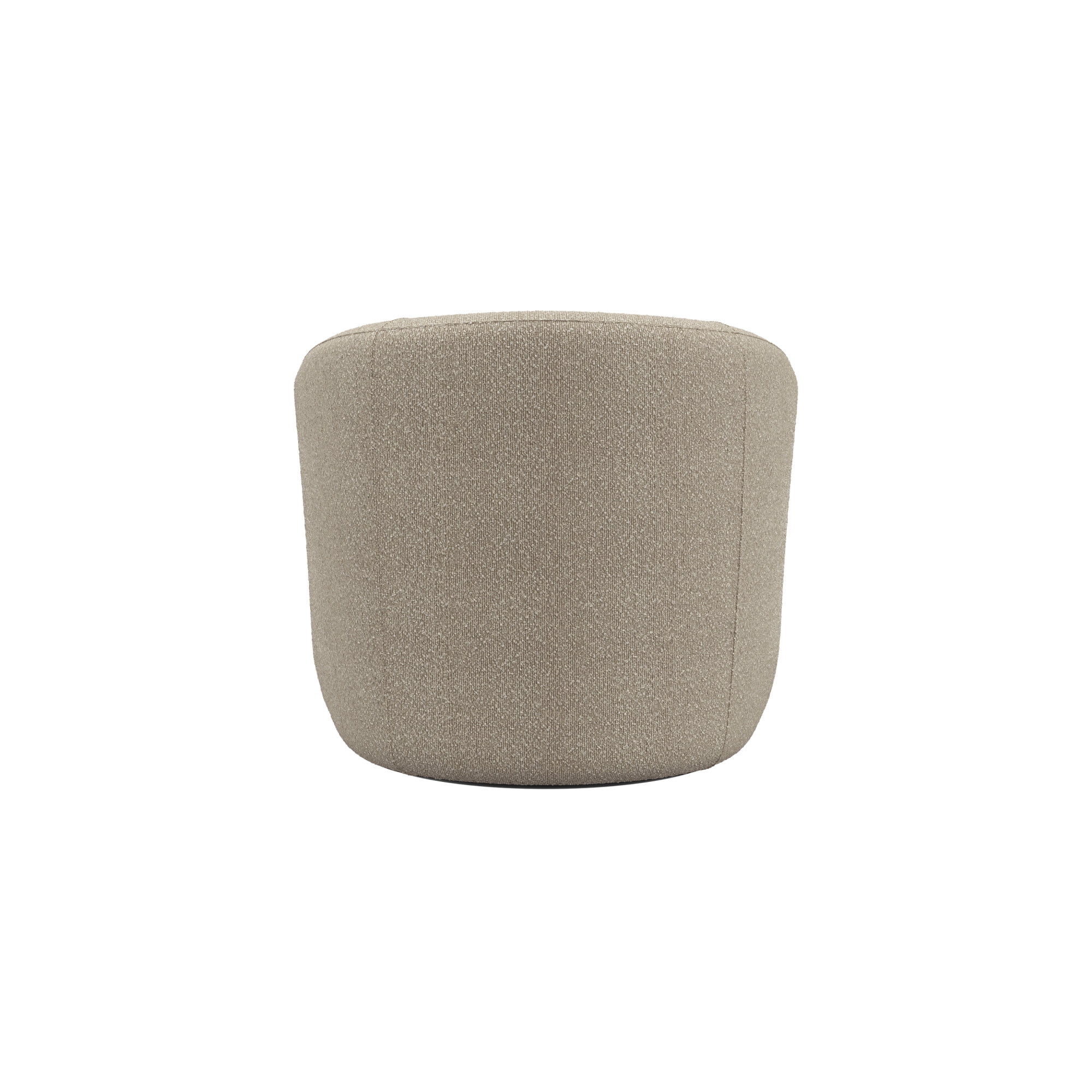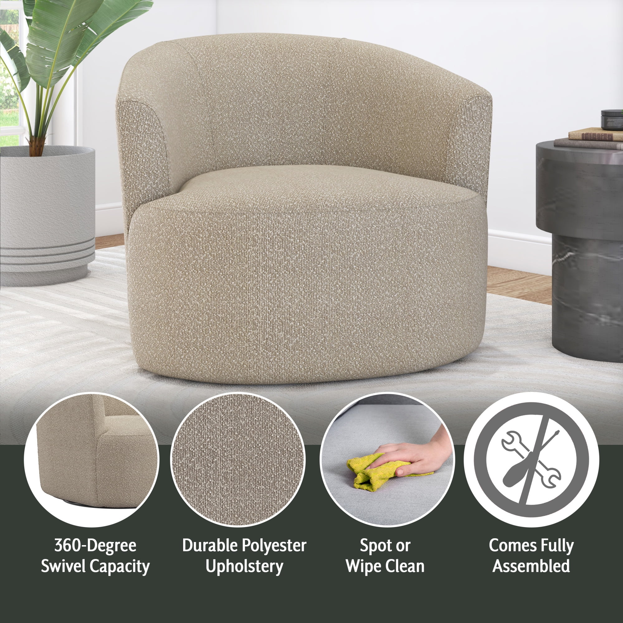 Boucle fabric upholstery 360 degree metal swivel base Available Colors: Cream, Taupe and Olive Overall Dimensions: 30H x 32W x 33.5D No assembly required Shipped in one box Spot or wipe clean Recommended weight capacity 250lbs