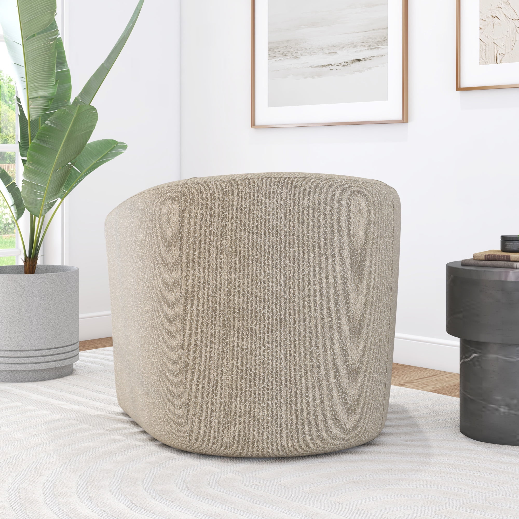 Introduce the Mainstays Swivel Chair to your living area, perfect for adding a touch of comfort and style to any living room, bedroom, or office. With its low-profile barrel back design, this chair serves as a modern accent piece, effortlessly adding a hint of luxury to your space without the need for complex assembly or tools. The chair’s taupe boucle fabric is versatile, harmonizing with both vibrant and muted color palettes for a classic, elegant look. Made with durable and easy-to-clean upholstery, the Mainstays Swivel Chair is not just an attractive piece, but also a practical choice for busy family homes, guaranteeing lasting appeal and easy maintenance.