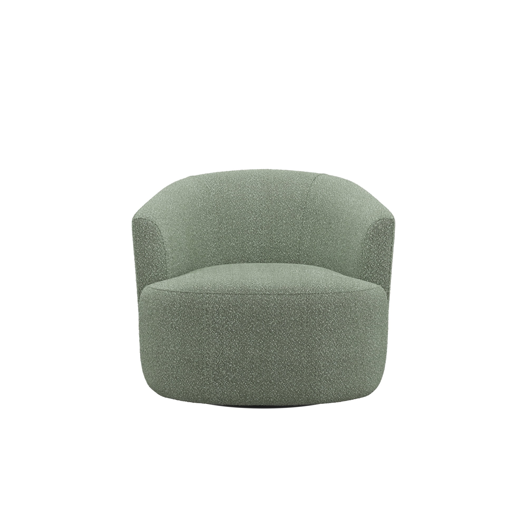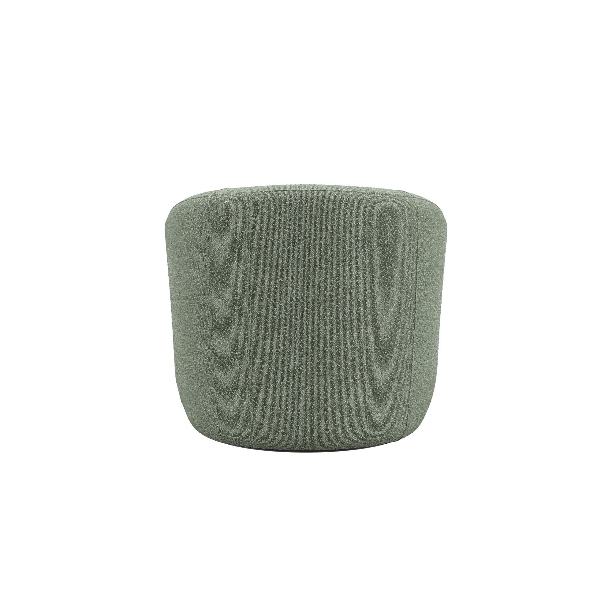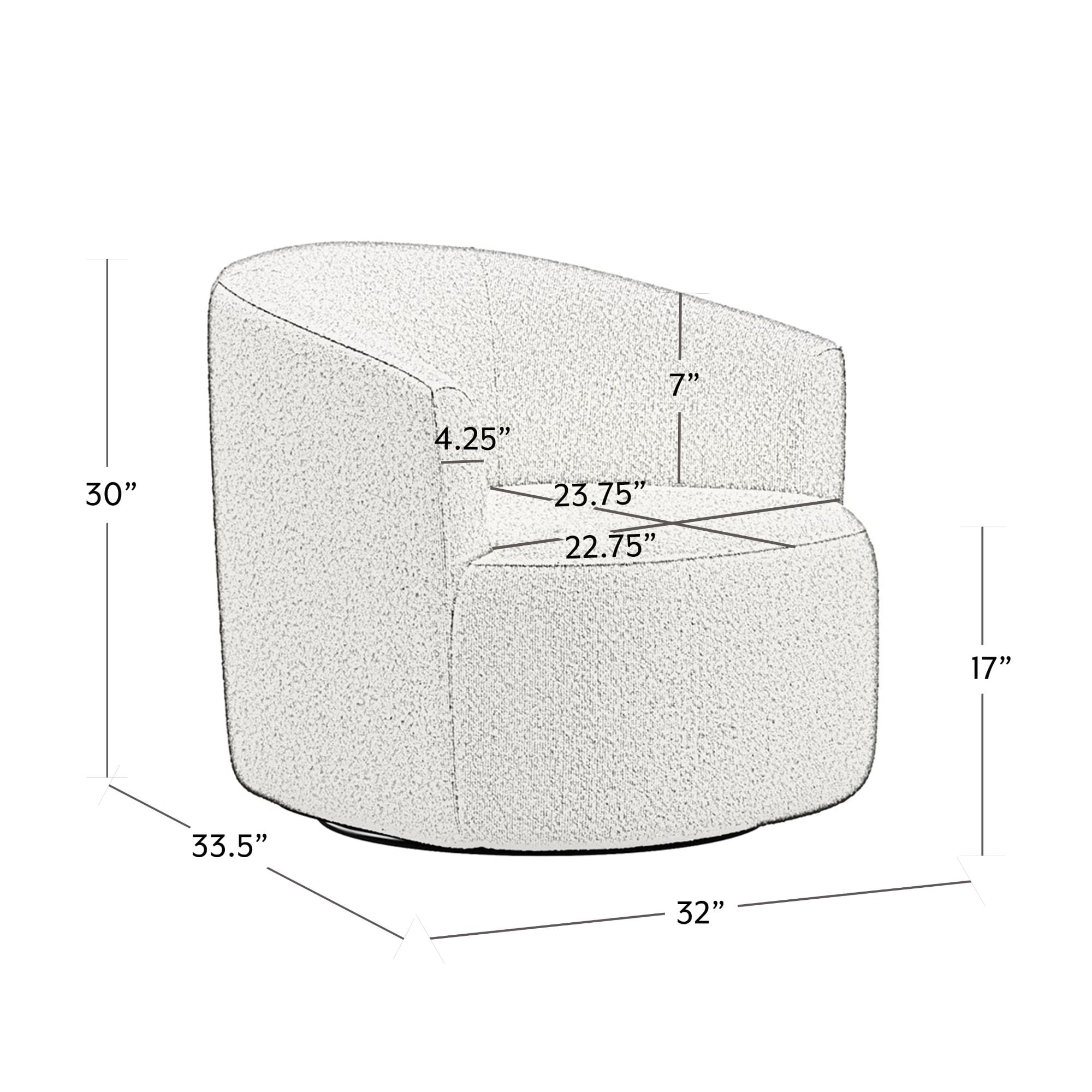 Boucle fabric upholstery 360 degree metal swivel base Available Colors: Cream, Taupe and Olive Overall Dimensions: 30H x 32W x 33.5D No assembly required Shipped in one box Spot or wipe clean Recommended weight capacity 250lbs