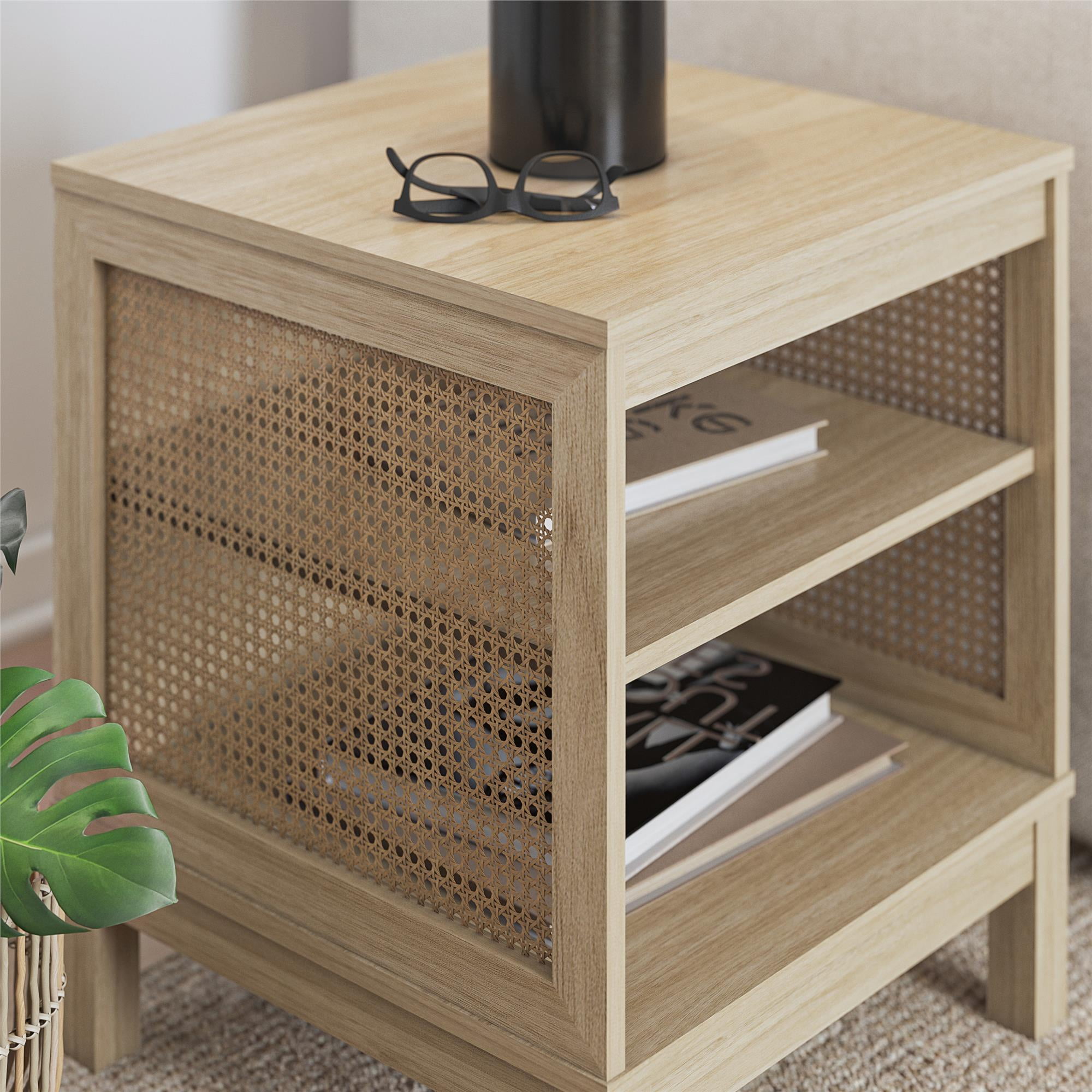 Boho Chic Design: Infuse your living room space with the laid-back charm of bohemian style, accentuated by the natural cane side accent walls Versatile Storage: Utilize the two open shelves to display decorative pieces, store books, or keep everyday essentials organized and within reach Durable Construction: Made from laminated engineered wood, this side table ensures long-lasting durability while maintaining its stylish appearance Space-Saving Solution: With its compact design, this side table fits seamlessly into various living spaces, serving as a functional and stylish accent piece Assembled Dimensions: 24″H x 20″W x 20″D