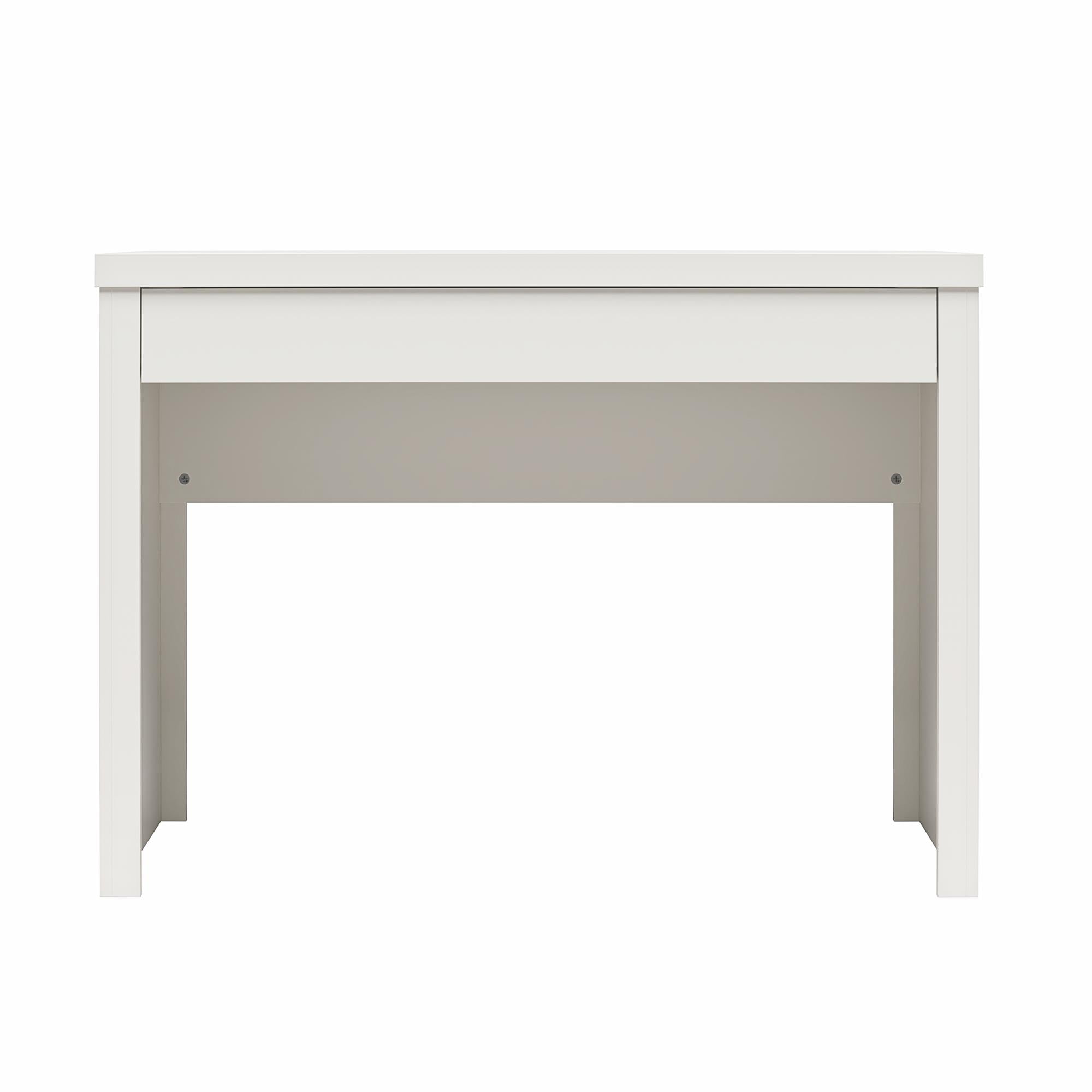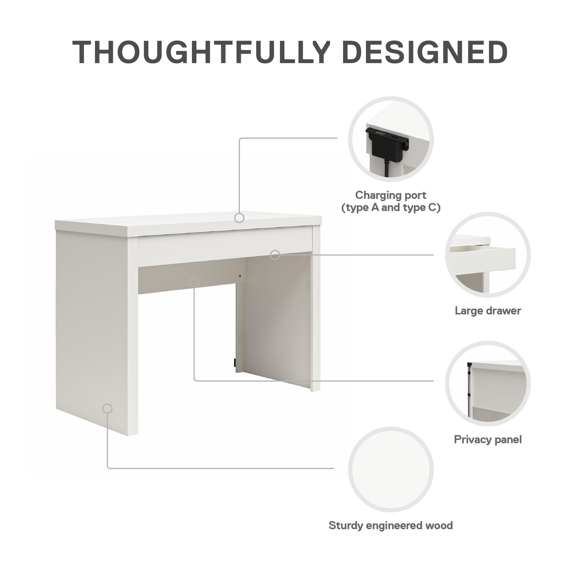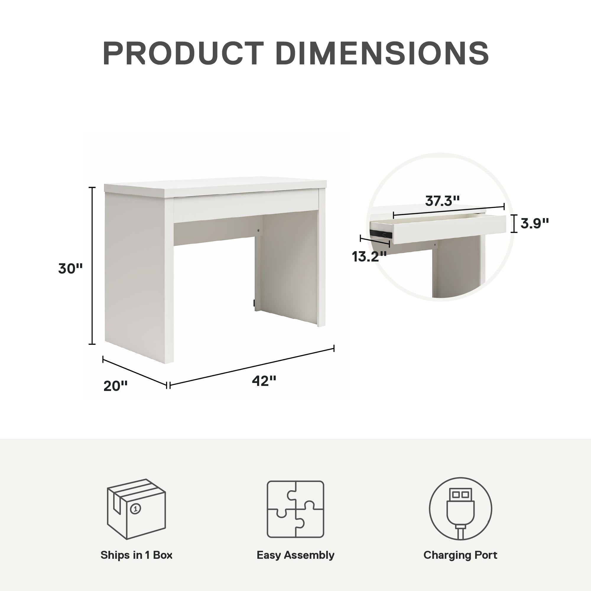 SLEEK AND MODERN WRITING DESK: This desk features a minimalist design with a modesty panel, making it a chic addition to any home office, college dorm, or teen’s room PRACTICAL ORGANIZATION: Includes a drawer for organizing writing utensils, tablets, and other essentials, ensuring your space stays tidy and efficient CONVENIENT USB PORTS: Stay powered up with hidden USB A and USB C-type plugs at the back of the desk, complete with an included cord, power adapter, and clips to keep everything neatly tucked away BUDGET-FRIENDLY AND STURDY: Crafted from durable engineered wood, this desk offers a stylish and contemporary look at an affordable price, ensuring both quality and value for your workspace ITEM DETAILS: The computer desk ships flat in one box and requires minimal assembly time; Dimensions: 42”W x 30”H x 20”D; Drawer: 35.6″W x 2.1″H x 13.26″D; Weight limits: Desktop: 50 lbs.; Drawer: 25 lbs.; 1-year limited warranty