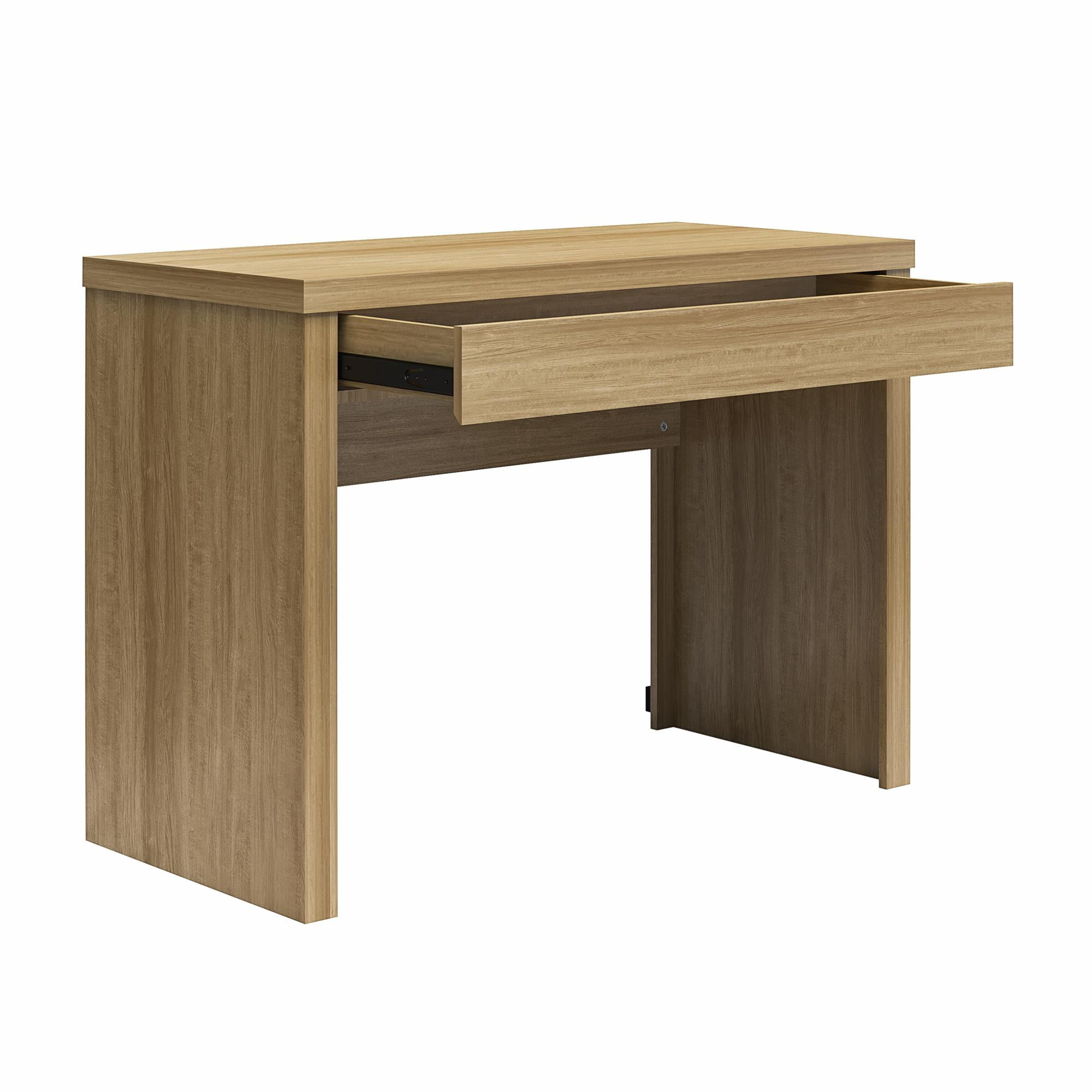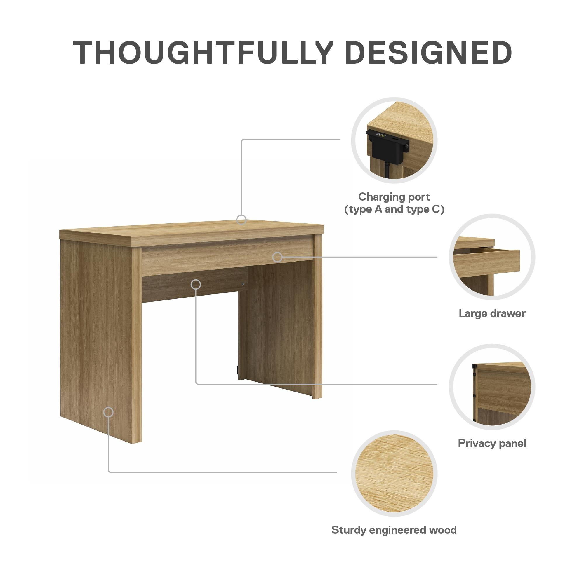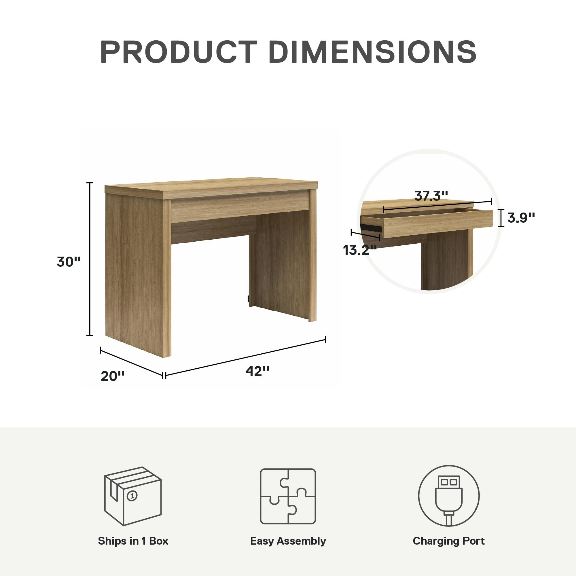 SLEEK AND MODERN WRITING DESK: This desk features a minimalist design with a modesty panel, making it a chic addition to any home office, college dorm, or teen’s room PRACTICAL ORGANIZATION: Includes a drawer for organizing writing utensils, tablets, and other essentials, ensuring your space stays tidy and efficient CONVENIENT USB PORTS: Stay powered up with hidden USB A and USB C-type plugs at the back of the desk, complete with an included cord, power adapter, and clips to keep everything neatly tucked away BUDGET-FRIENDLY AND STURDY: Crafted from durable engineered wood, this desk offers a stylish and contemporary look at an affordable price, ensuring both quality and value for your workspace ITEM DETAILS: The computer desk ships flat in one box and requires minimal assembly time; Dimensions: 42”W x 30”H x 20”D; Drawer: 35.6″W x 2.1″H x 13.26″D; Weight limits: Desktop: 50 lbs.; Drawer: 25 lbs.; 1-year limited warranty