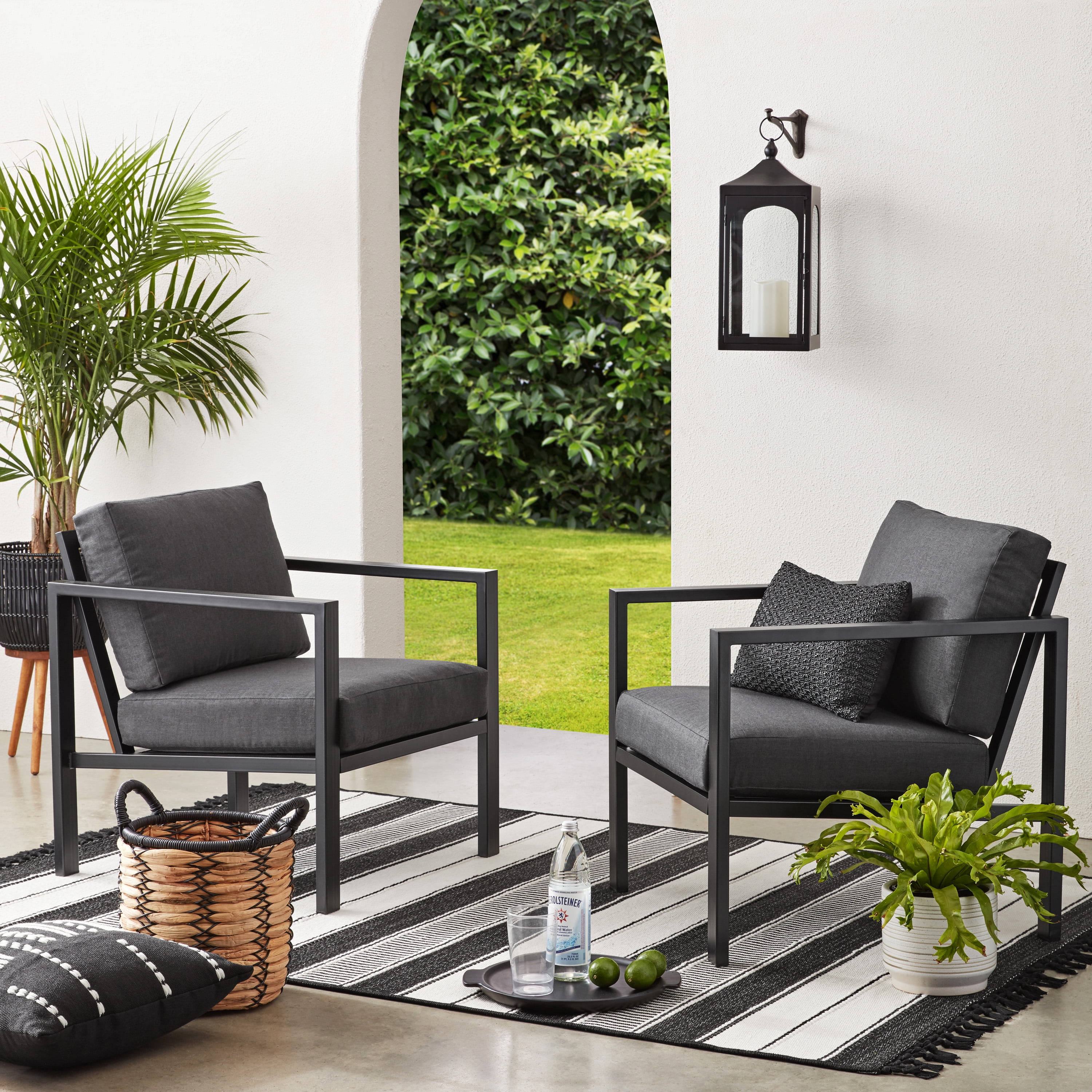 Mainstays Dashwood 4-Piece Outdoor Patio Conversation Set: Set includes 2 chairs, a loveseat, and a coffee table Set seats up to 4 people Fade-resistant Olefin Fabric for long wear and durability Metal slat table E-coated and powder-coated finish for rust-resistant durability Easily assembled with the included instructions Assembled product dimensions: Loveseat 47.2” W x 27.9” D x 29” H; 34.23 lbs.; Chair 25.6” W x 27.9” D x 29” H; 23.03 lbs.; Coffee table 39.4” W x 20.2” D x 18.8” H; 20.9 lbs. Individual seat weight capacity 250 lbs. and table weight capacity 50 lbs. Easy to care for: simply wipe down with soapy water as needed and allow to air dry Model # MS2328079419001 / UPC 844093013383 Arrives in 1 box, shipping dimensions: 45.1” L x 28.7” W x 22.4” H; 116.6 lbs. Site to Store Pickup Note: This item is packaged in 1 large box that may not fit in a standard-sized vehicle. Please make sure you have a large car or truck for store pickup. Limited 2-year warranty from date of purchase. For California residents, the limited warranty begins upon receipt of the product by the original purchaser. Customer Service, please call: 1-877-579-1550. Monday – Friday 8AM – 5PM EST